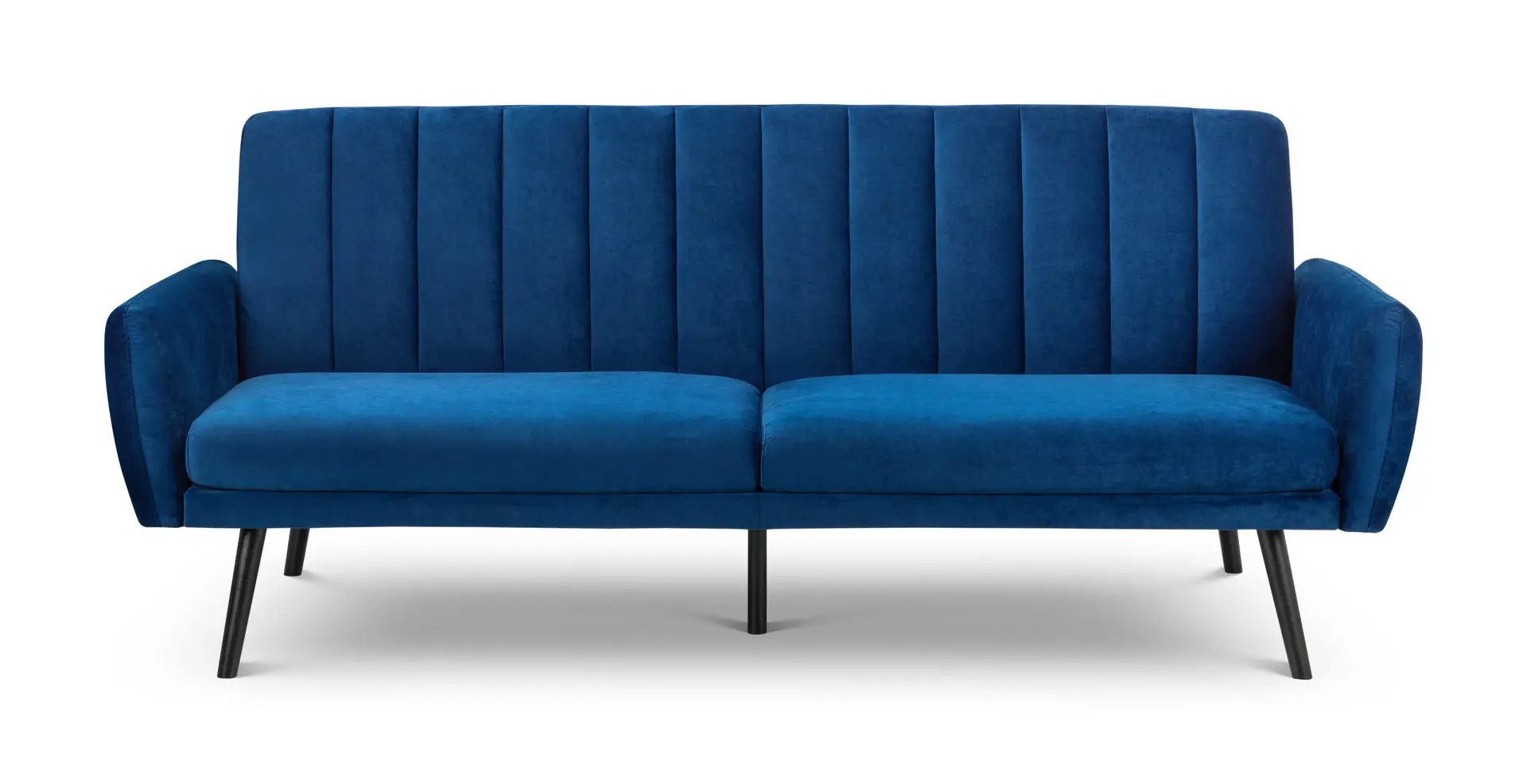 The Afina Sofabed adds glamour to any room, suited for a variety of décor whether glam, modern or mid-century. Upholstered in a luxurious blue velvet with classic statement stitched vertical rows on the back, with black tapered legs giving the sofa a Scandinavian look. The easy to use sleeper function offers a guest bed with utmost comfort, with thick, foam padded cushions.