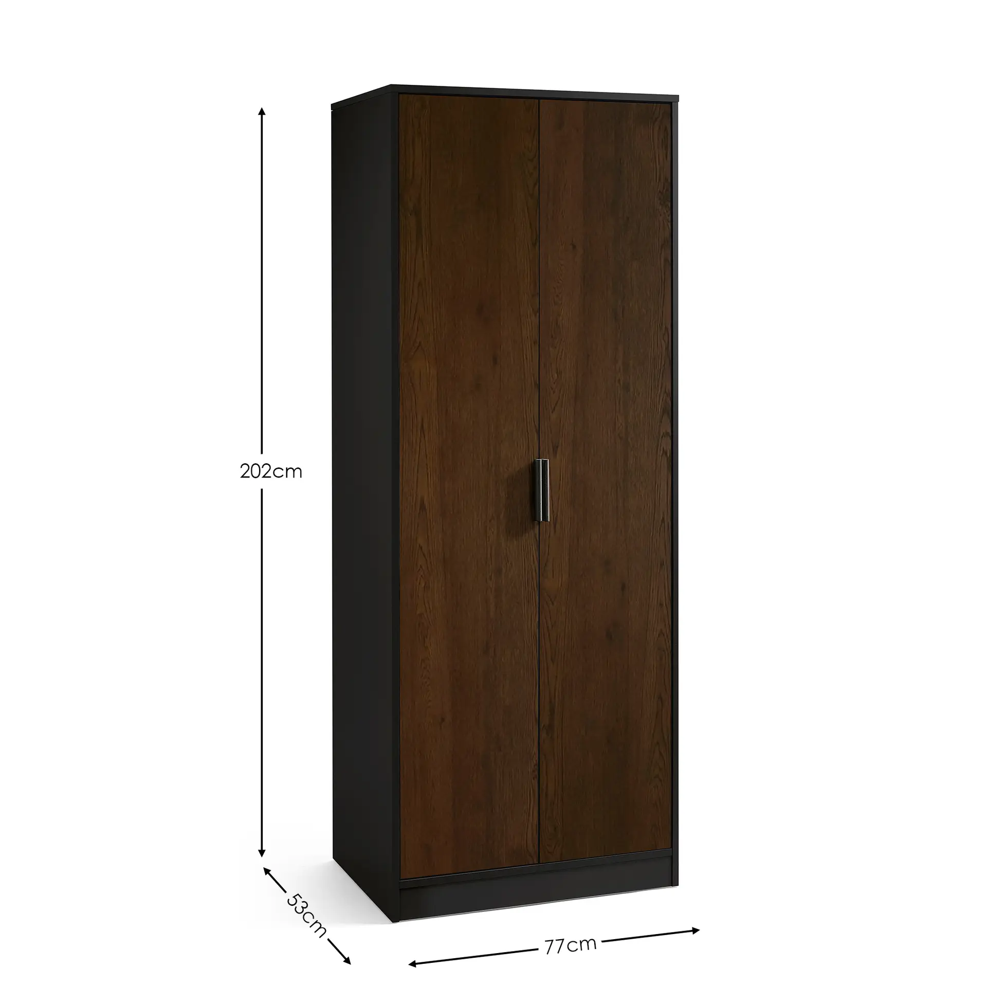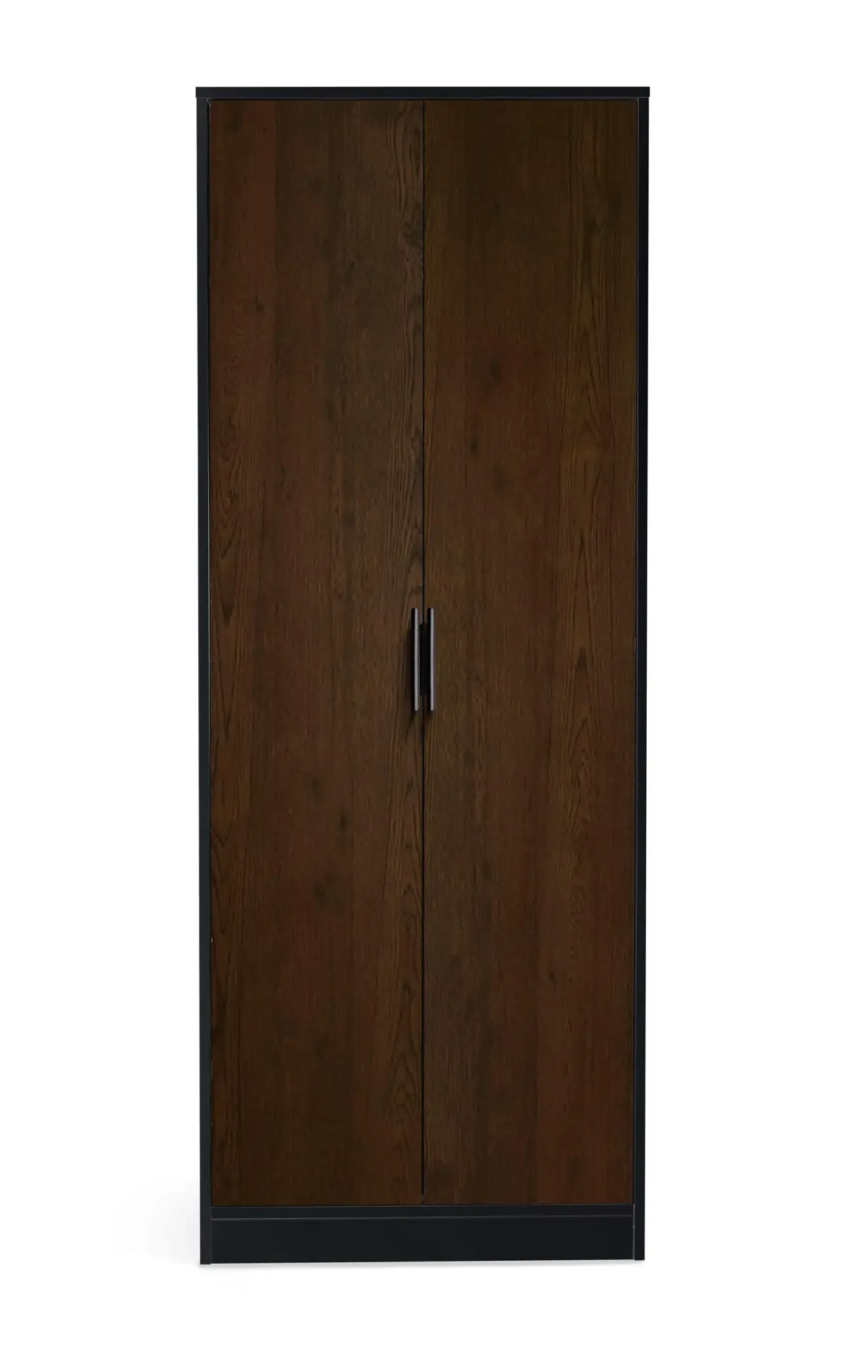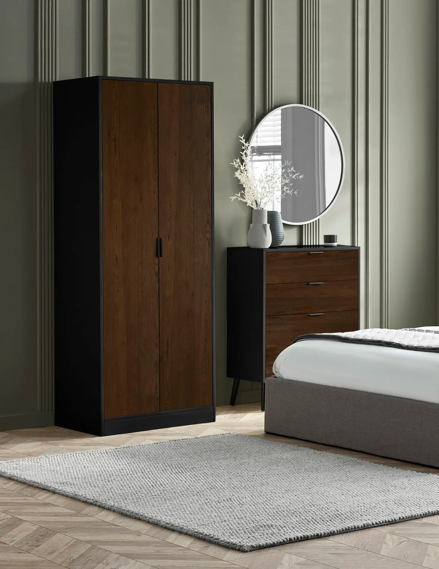 The Alba 2 Door Wardrobe in Walnut and Black offers a modern, sophisticated storage solution for your bedroom. The warm walnut finish on the doors contrasts beautifully with sleek black accents, creating a bold and stylish design. Inside, it provides ample space for organising your clothing and accessories, featuring a full-length hanging rail and spacious shelves. The black handles add a contemporary touch, enhancing its sleek, modern look. Combining practicality and elegance, this wardrobe is a standout addition to any modern bedroom.