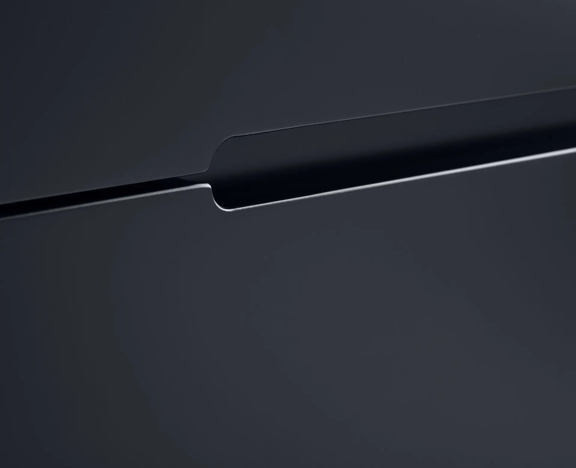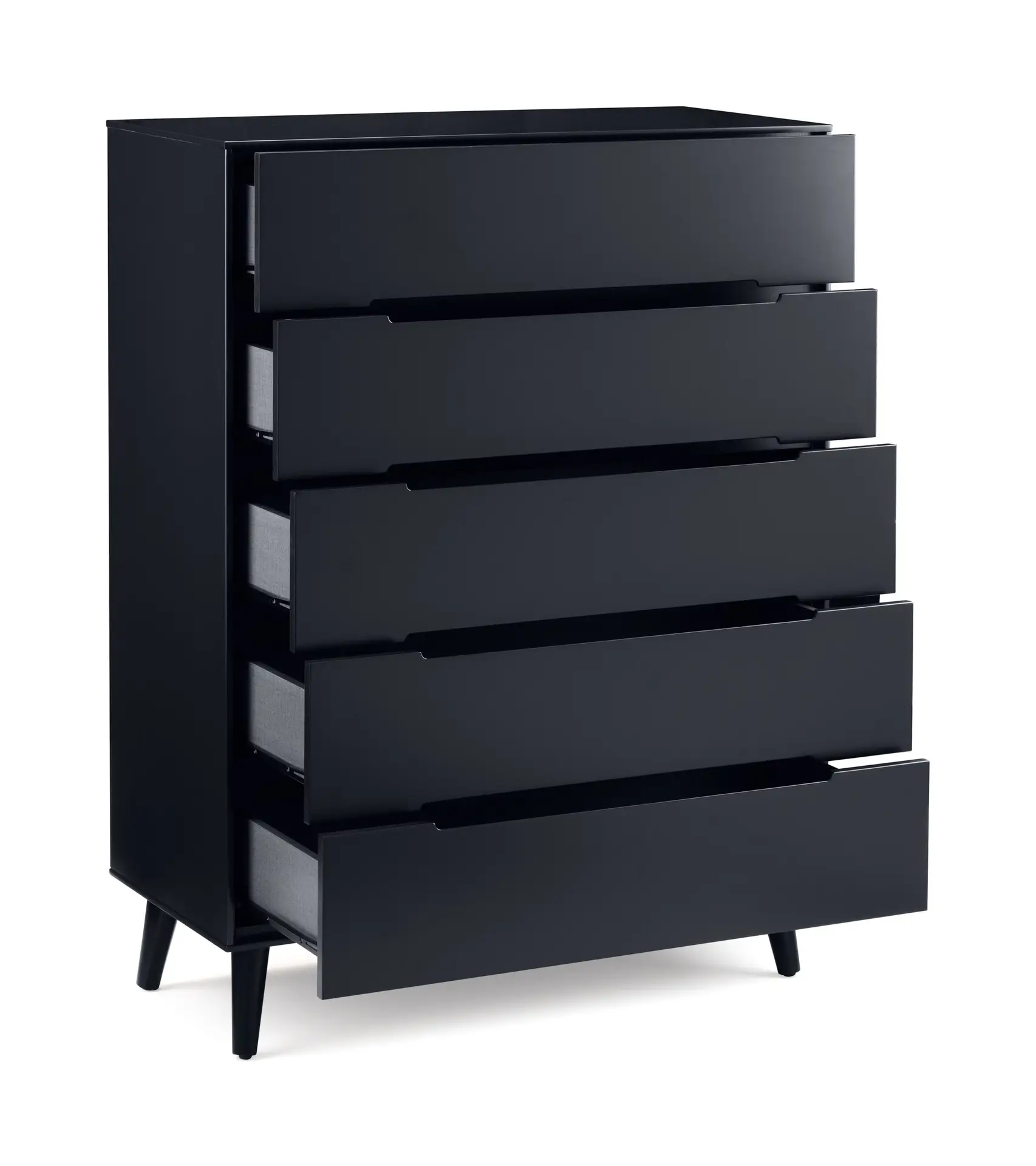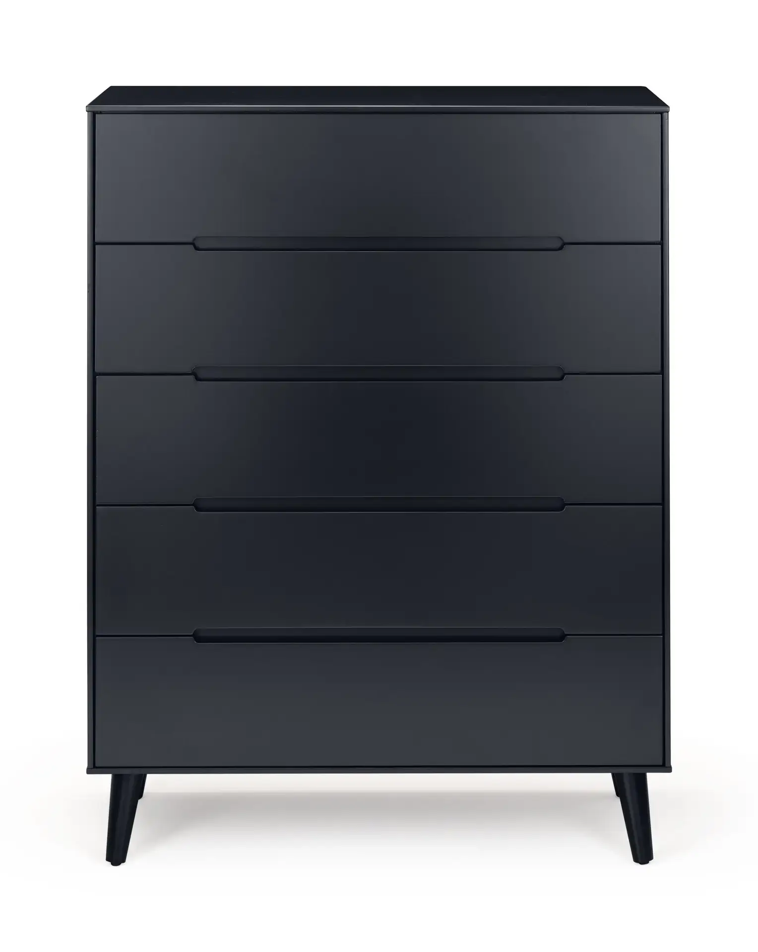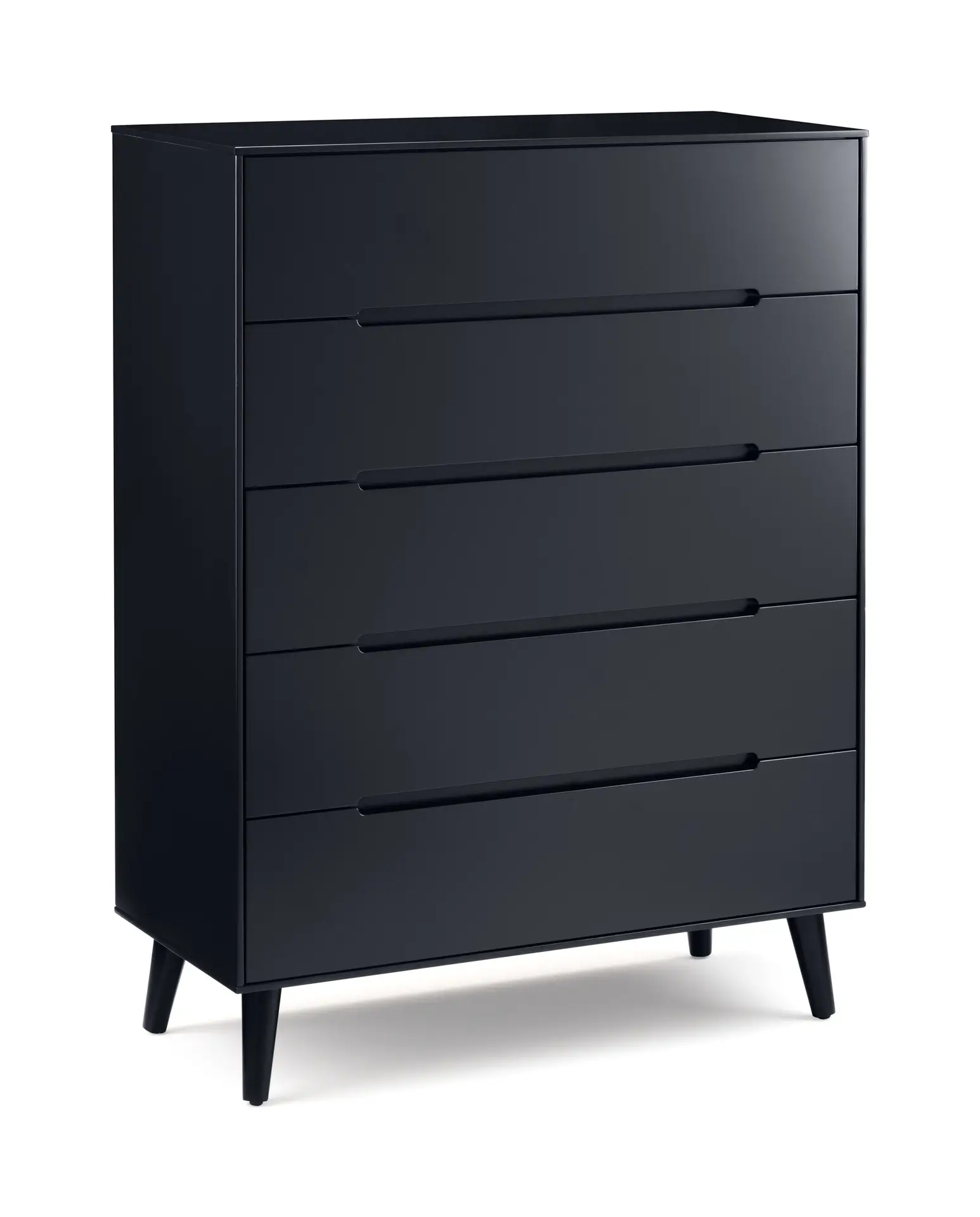 A stylish, retro-inspired chest with five large drawers in an immaculate matt anthracite lacquered finish, with complementary tapered oak finish legs and recessed handles to provide easy opening. The sleek Scandinavian feel fits beautifully with any décor.