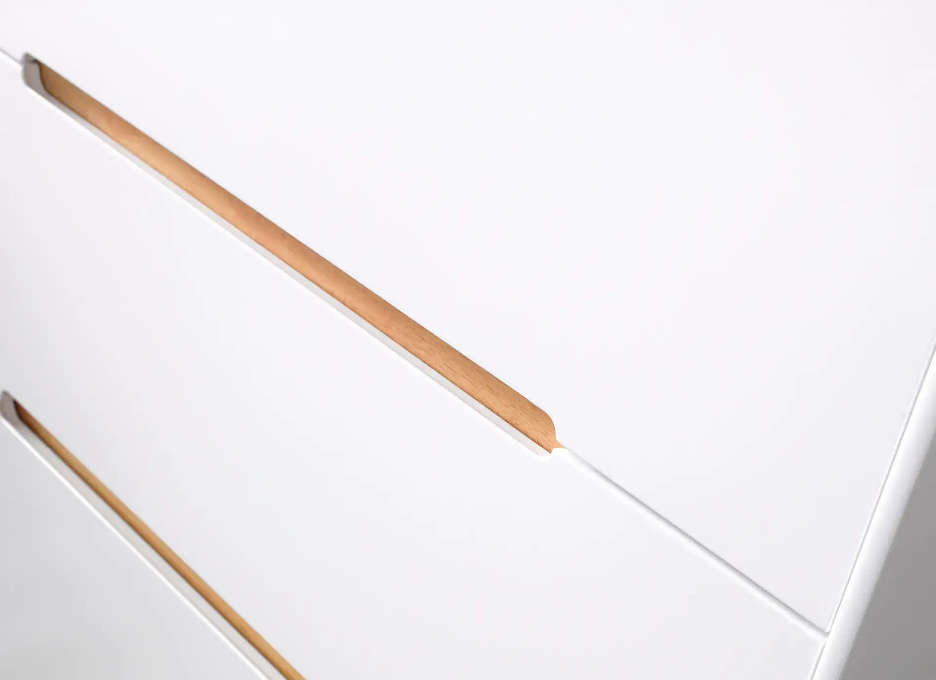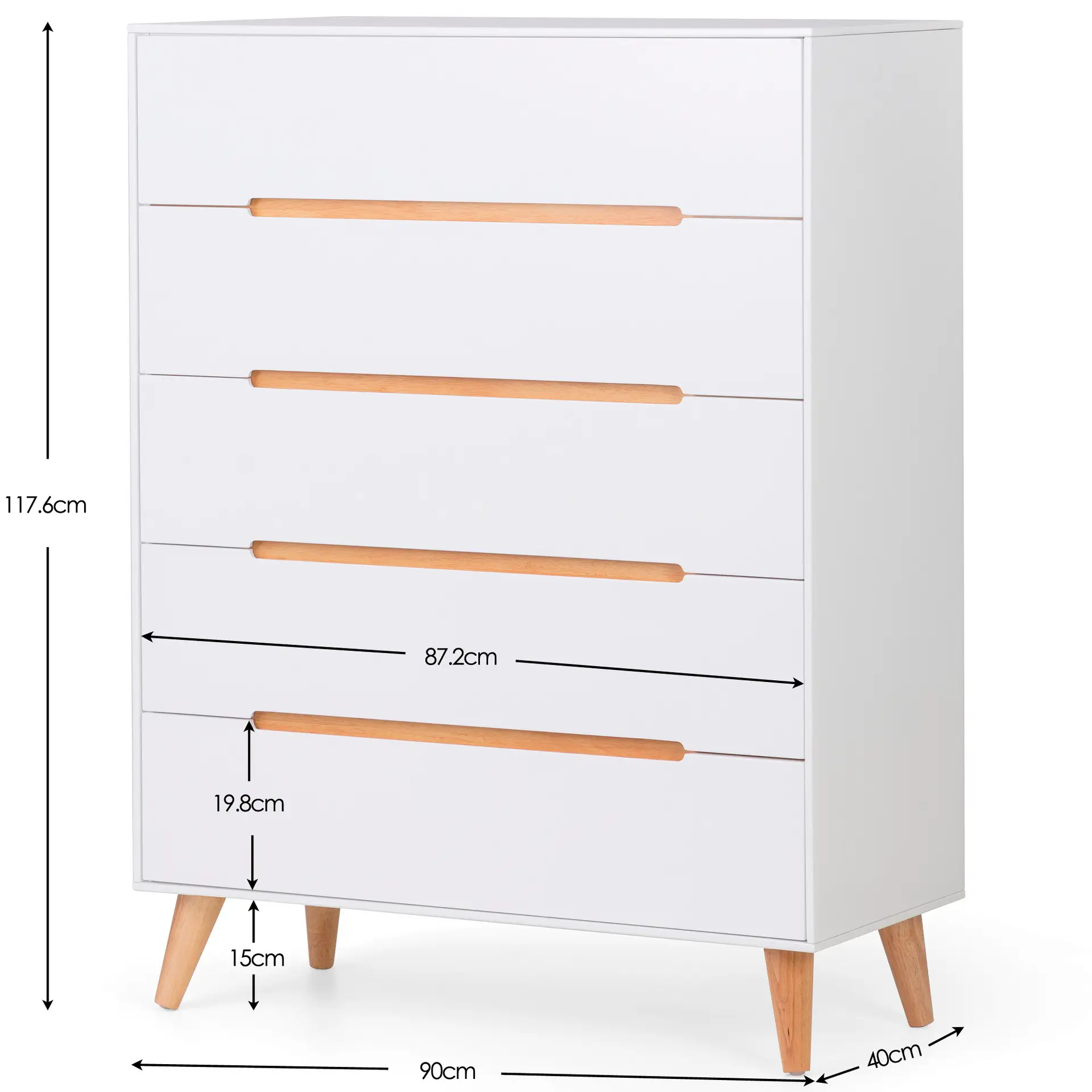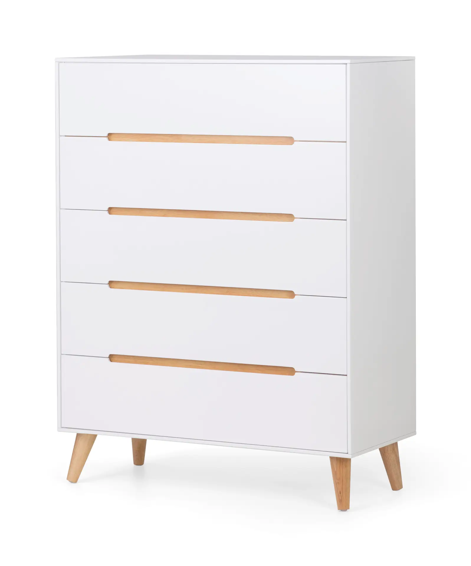 A stylish, retro-inspired chest with five large drawers in an immaculate matt white lacquered finish, with complementary tapered oak finish legs and recessed handles to provide easy opening. The sleek Scandinavian feel fits beautifully with any décor.