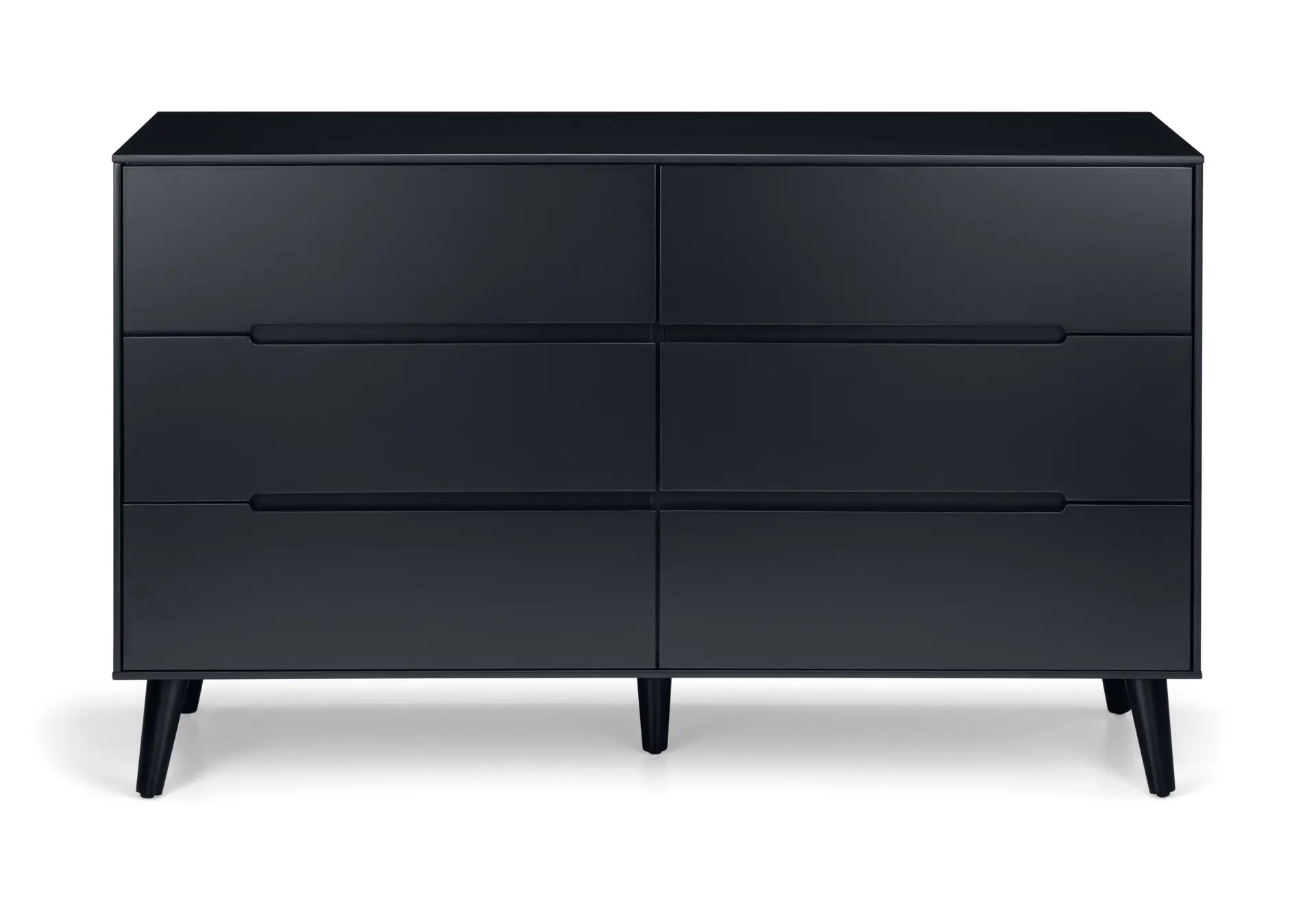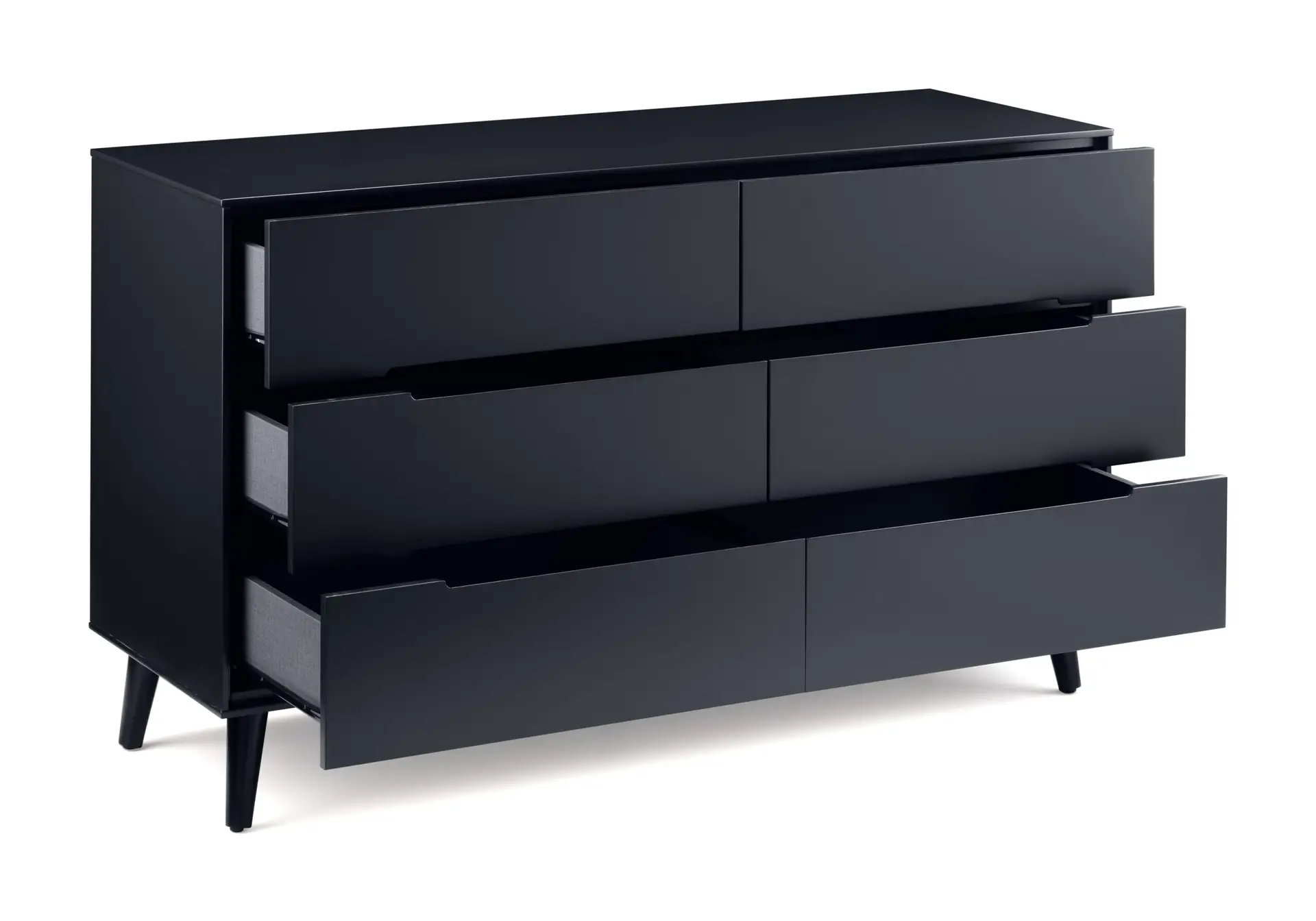 A stylish, retro-inspired wide chest with six large drawers in an immaculate matt anthracite lacquered finish, with complementary tapered oak finish legs and recessed handles to provide easy opening. This beautiful chest can also serve as a stylish dressing table. The sleek Scandinavian feel fits beautifully with any décor.