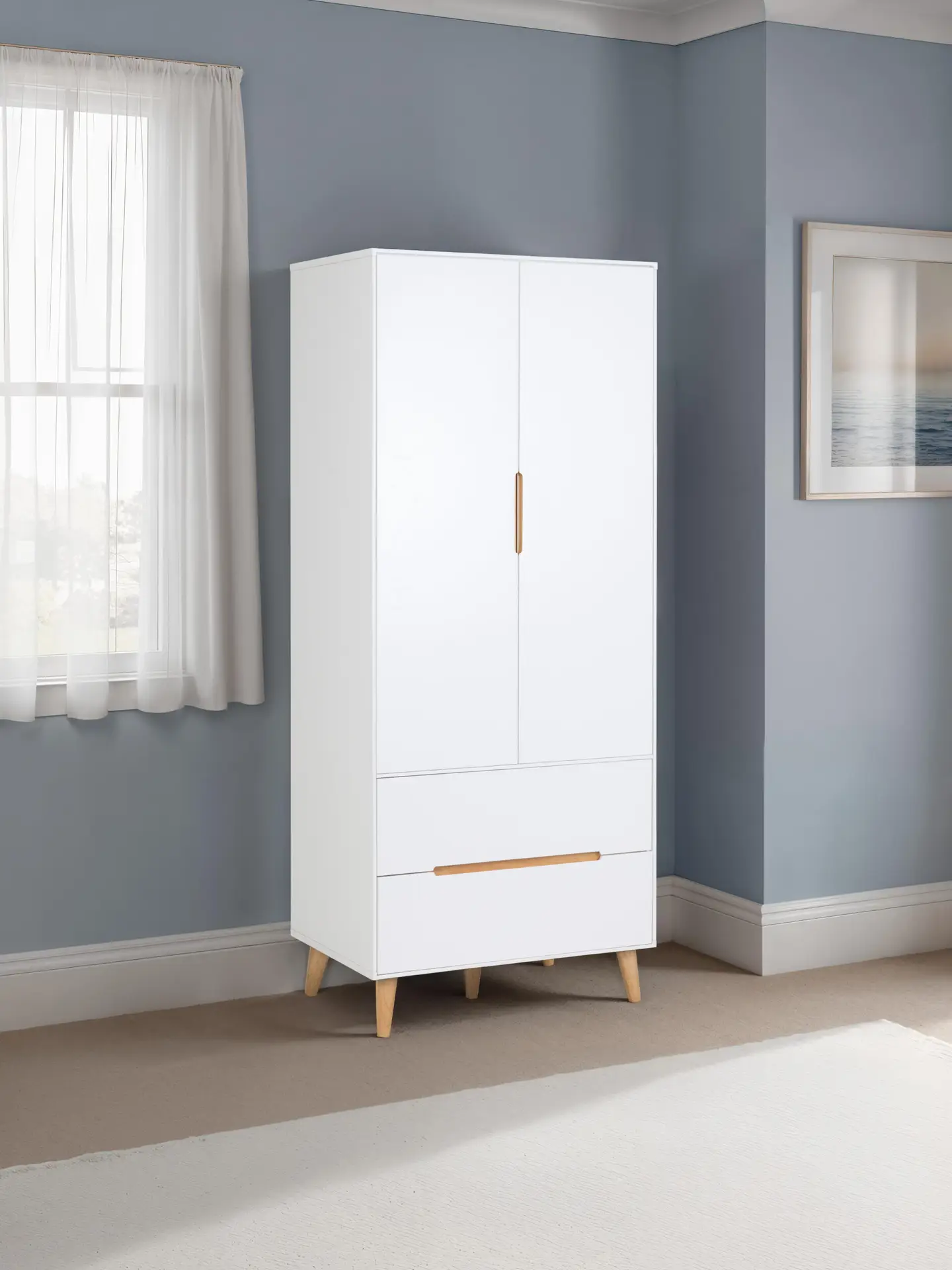 A stylish, retro-inspired combination wardrobe with two drawers in an immaculate matt white lacquered finish, with complementary tapered oak finish legs and recessed handles to provide easy opening. The sleek Scandinavian feel fits beautifully with any décor.