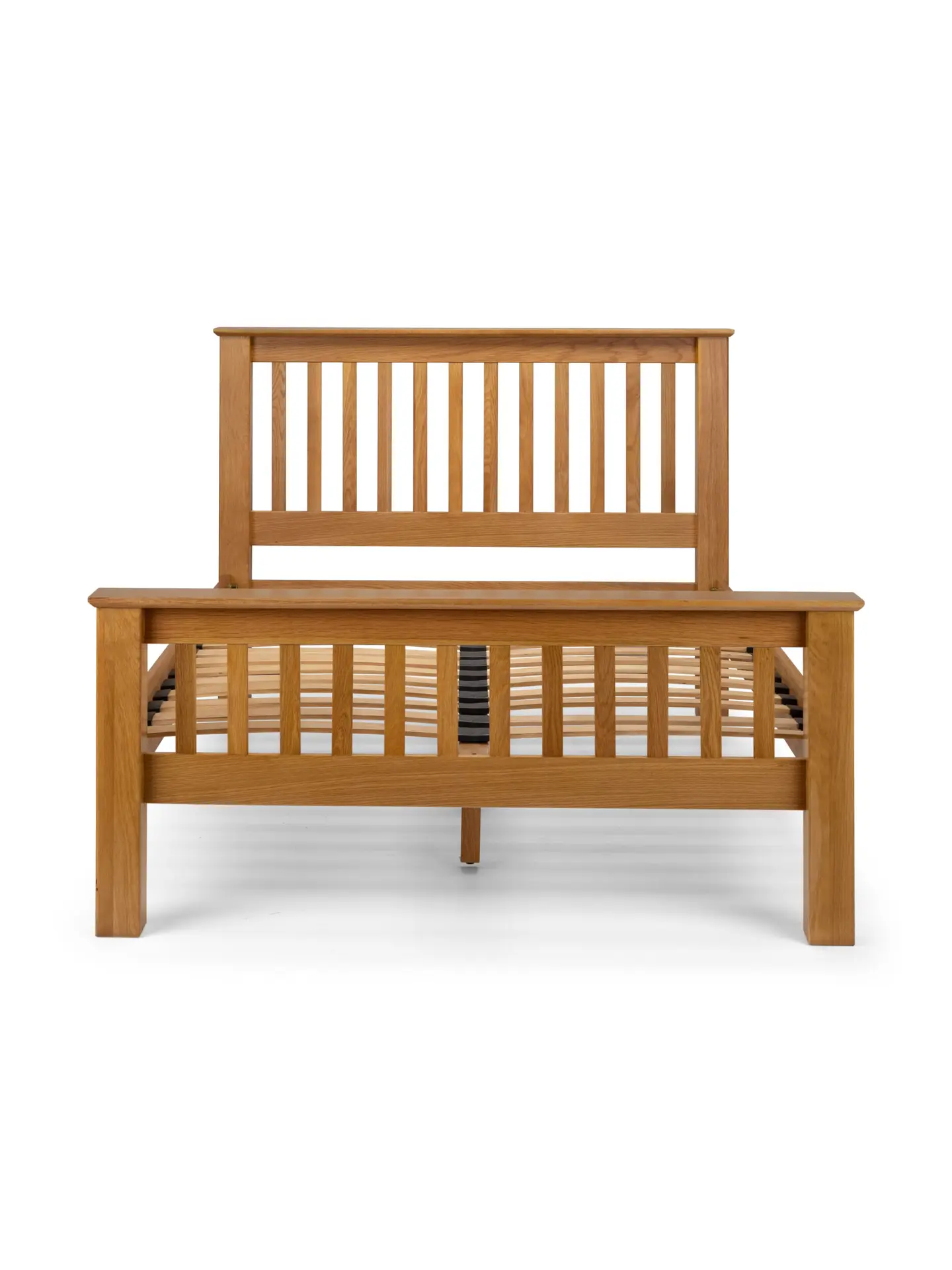 An imposing shaker style bed frame made from solid white oak and oak veneers. The timeless design complements both contemporary and traditional decor styles. This is an extremely robust bed that adds real presence to any bedroom. A fully sprung slatted sleeping base to ensure great comfort and prolonged mattress life.