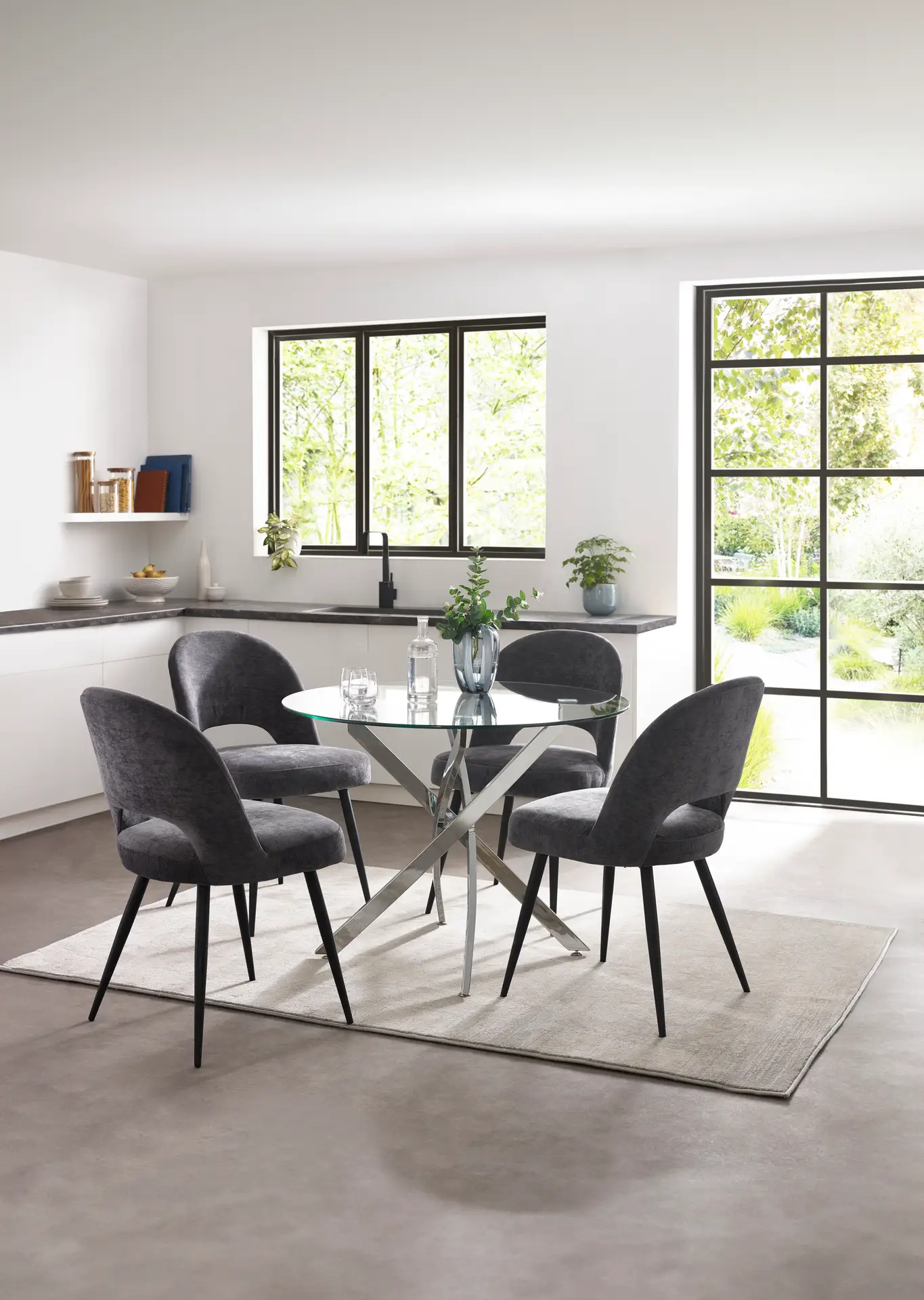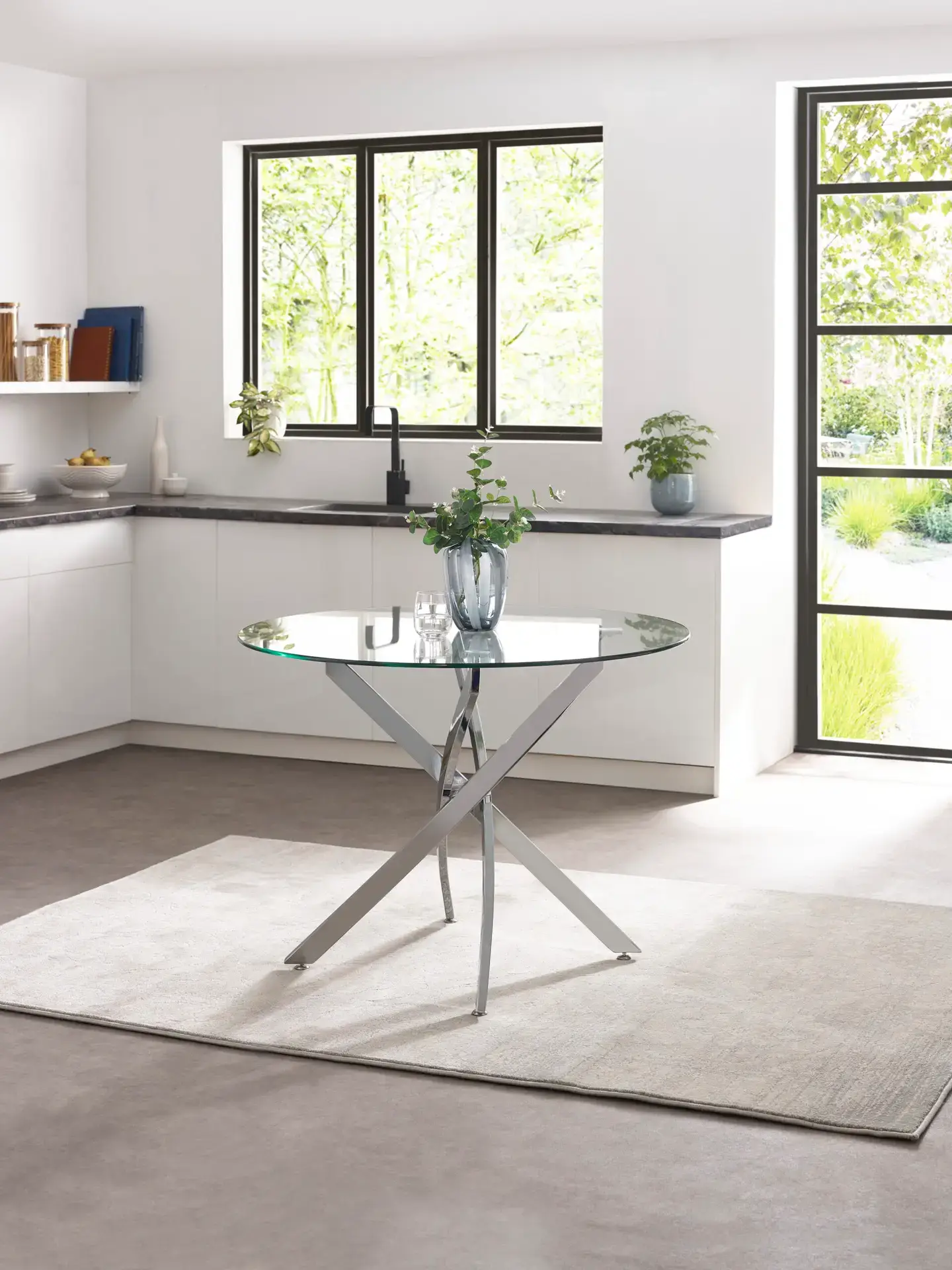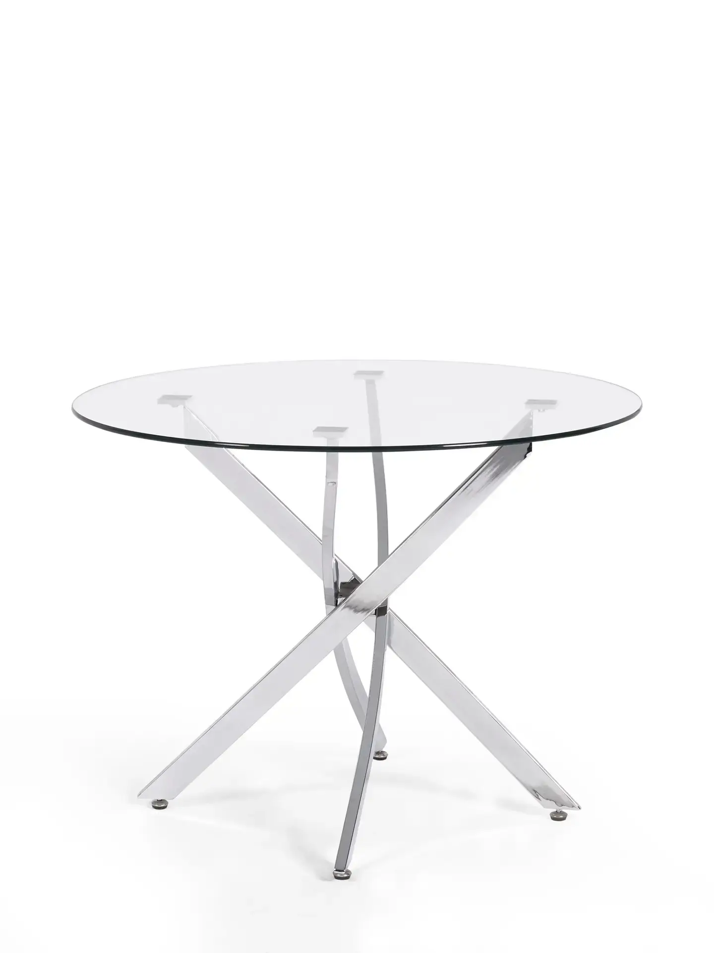The Anderson Round Glass Dining Table is the perfect combination of sleek style and modern elegance. The clear, circular tempered glass top creates a light and airy feel, highlighting the beauty of your space. A sturdy crossover chrome base adds a bold, contemporary touch while ensuring both stability and visual appeal. Ideal for any dining room or kitchen, this table blends sophistication with functionality, making it an ideal centerpiece for memorable meals and gatherings.