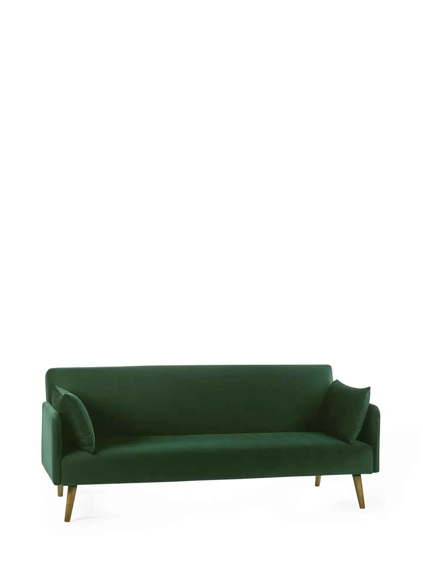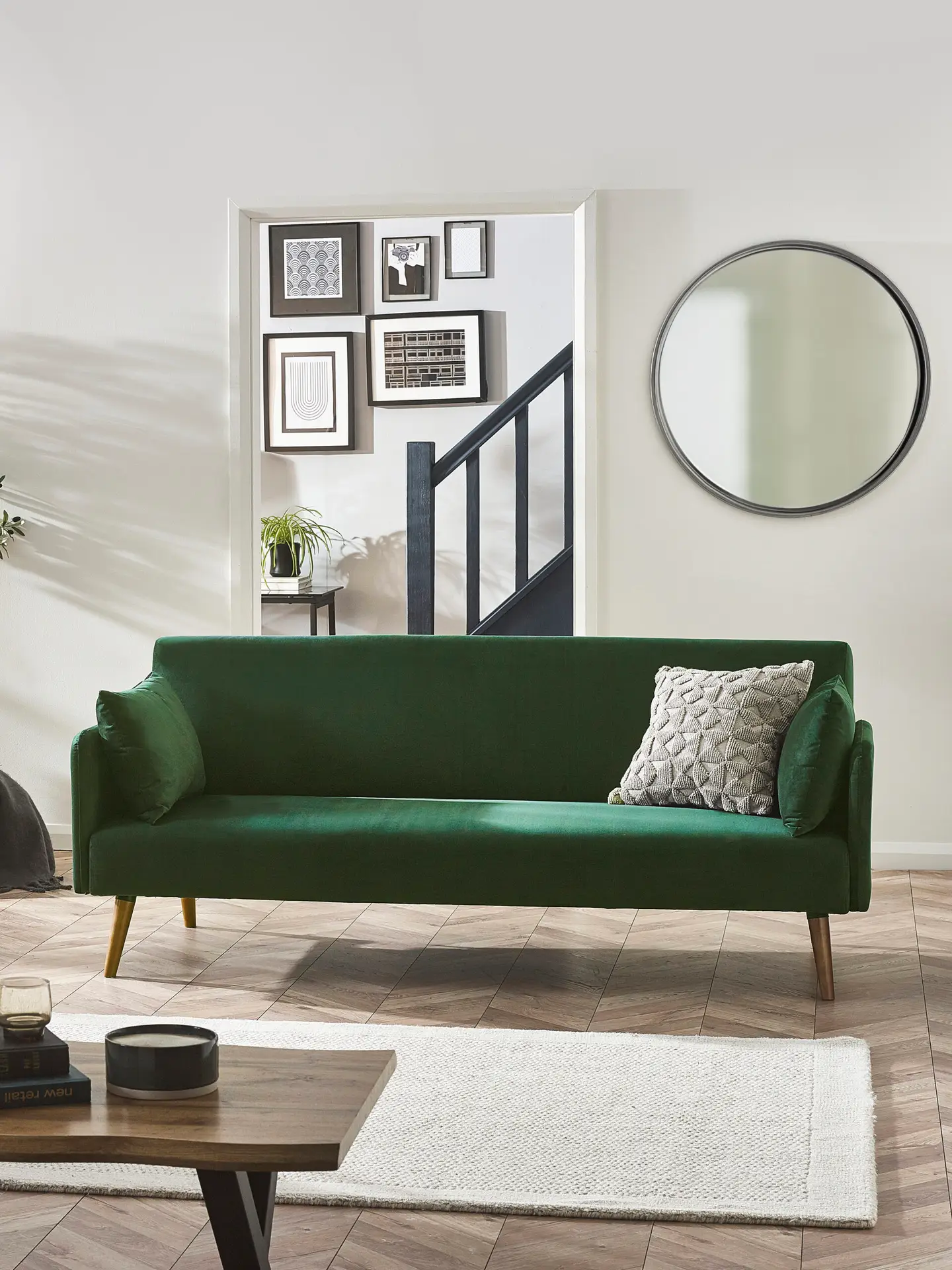 Elevate your space with the Andi Sofa Bed in Dark Green—a perfect mix of retro style and modern elegance, bringing both comfort and versatility to your home. Wrapped in a rich, dark green fabric, this piece adds a bold touch to any decor. With a simple fold-out design, it quickly transforms into a cosy bed, ideal for overnight guests. Two matching pillows are included for extra comfort and style. Supported by pale wood-effect legs, it brings warmth and sophistication, making it an ideal choice for compact or multipurpose rooms.