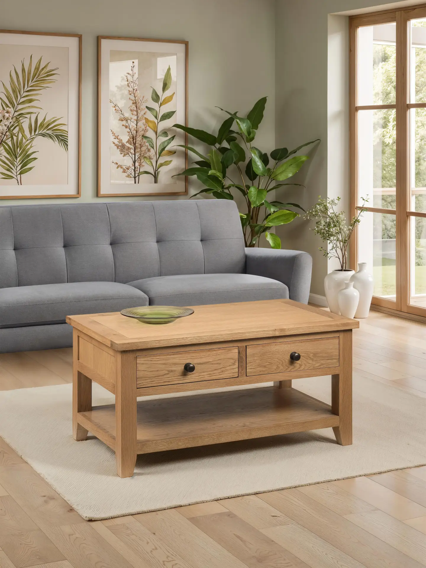 The Astoria coffee table offers great versatility, crafted from White Oak and Oak Veneers with a durable waxed finish. Features a handy storage shelf and 2 full depth drawers, accessible from either side for extra storage. A timeless design with chunky tops that complements contemporary and traditional interior styles equally well. With a range of coordinating furniture from the Julian Bowen Astoria range to create a warm, traditional feel in your home.