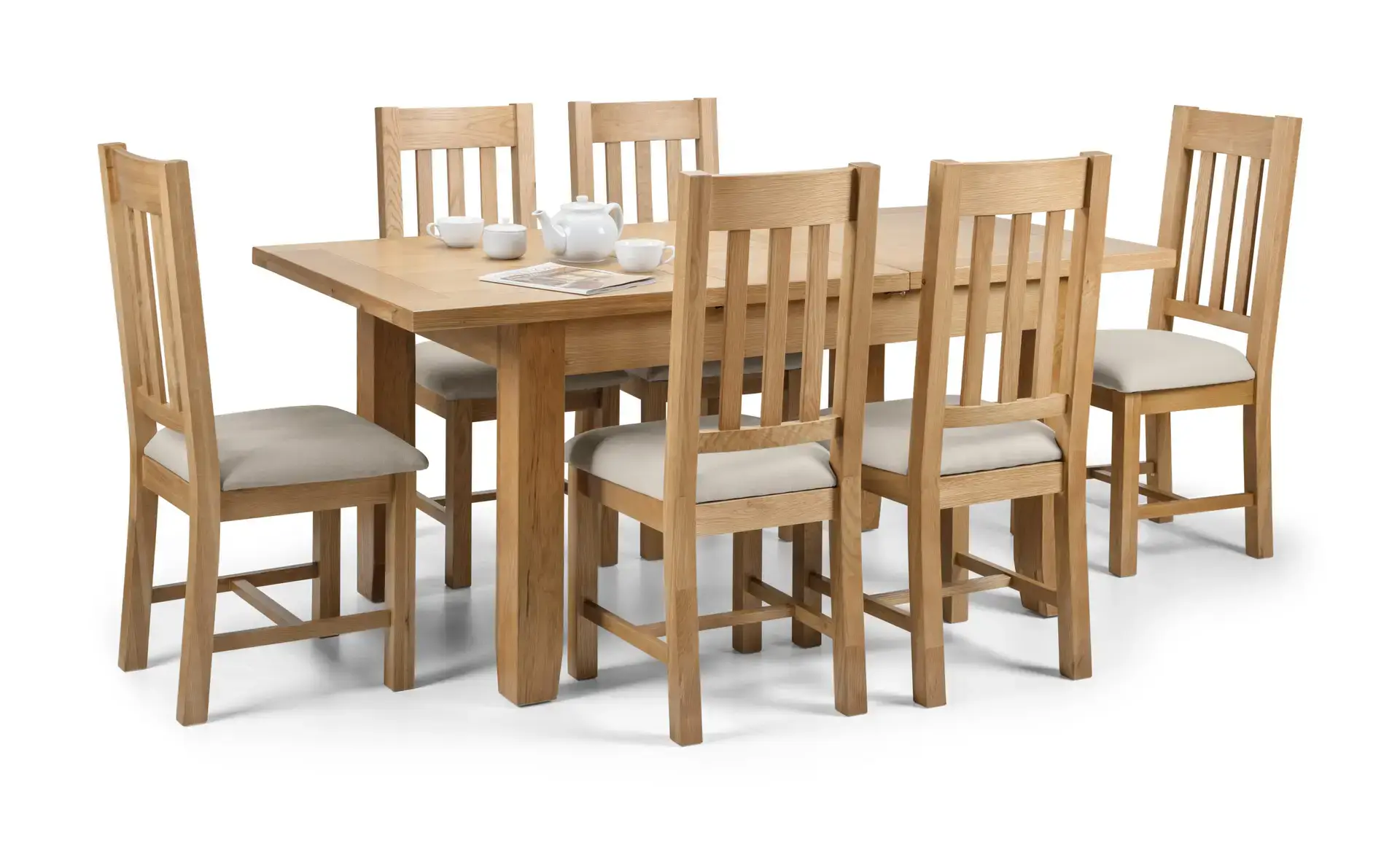 The Astoria dining table is a classic design with a chunky 40mm thick top in a sumptuous Waxed Oak finish. Crafted from the finest White Oak and Oak Veneers, the table features a 40cm butterfly extension system that is stored within the table when not in use. With a range of coordinating furniture from the Julian Bowen Astoria range to create a warm, traditional feel in your home. Paired with 6 Hereford dining chairs.