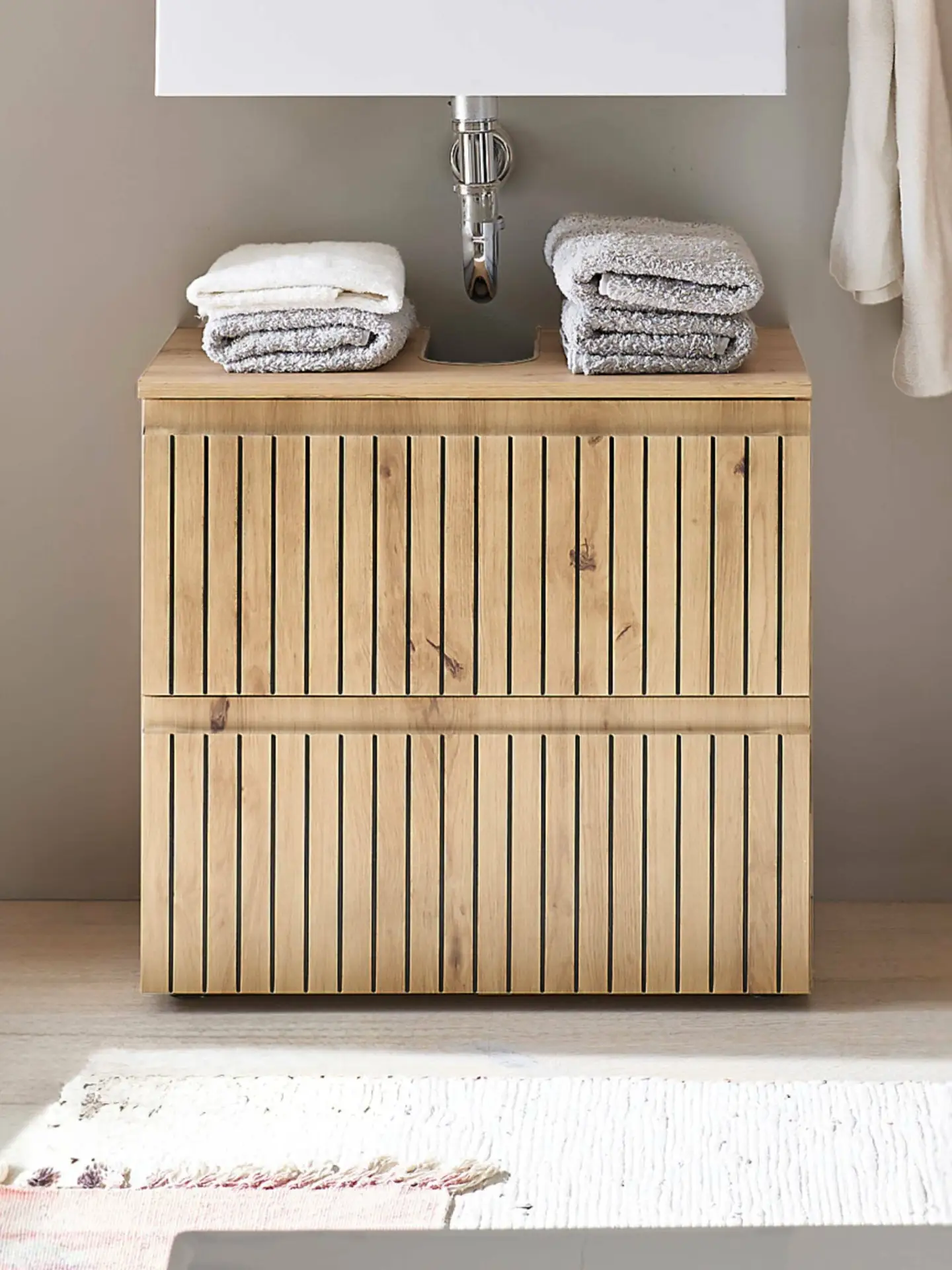 Uncover the ideal combination of practicality and understated elegance with the Austin 2 Drawer Under Sink Cabinet. This compact unit features two convenient drawers designed to maximise your bathroom space while providing stylish storage solutions. Inside, the spacious interior offers ample room for storing essentials, cleaning supplies, or extra towels. The charming slatted wood design enhances the overall aesthetic with a cohesive, natural look, while the discreet handles add a sophisticated touch.