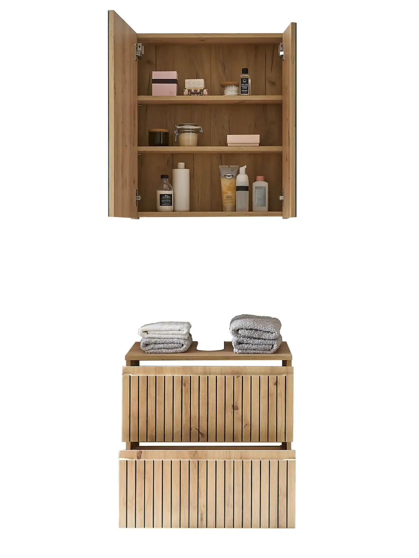 - Versatile space for towels and supplies.