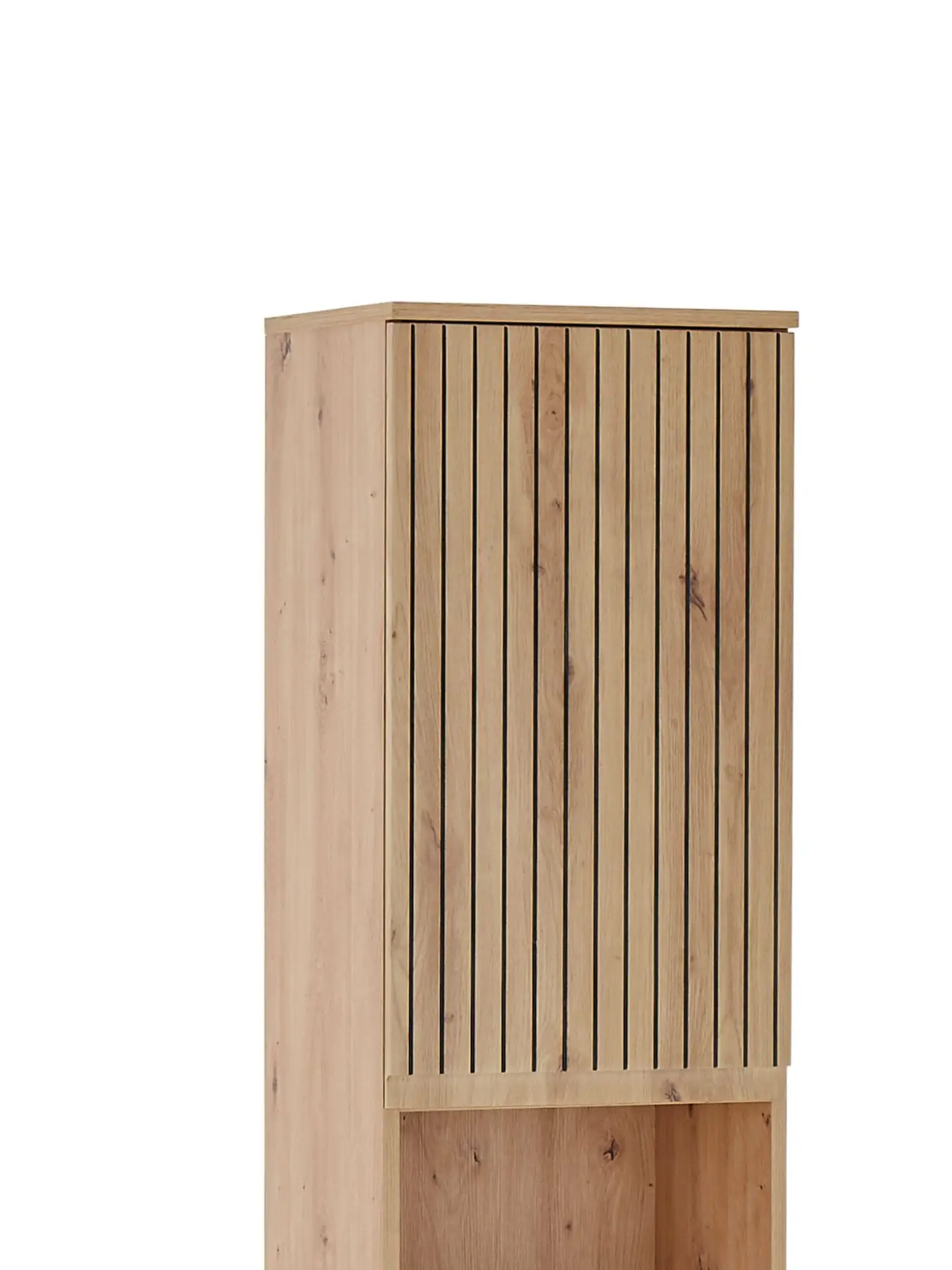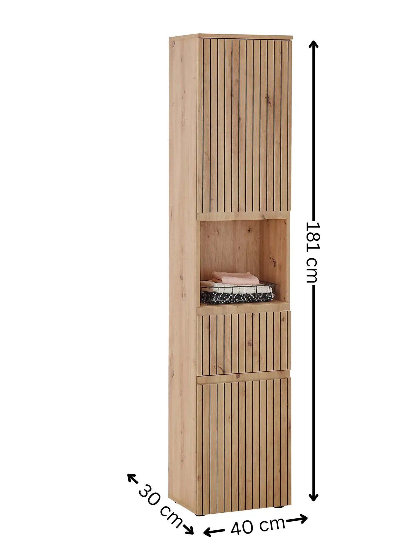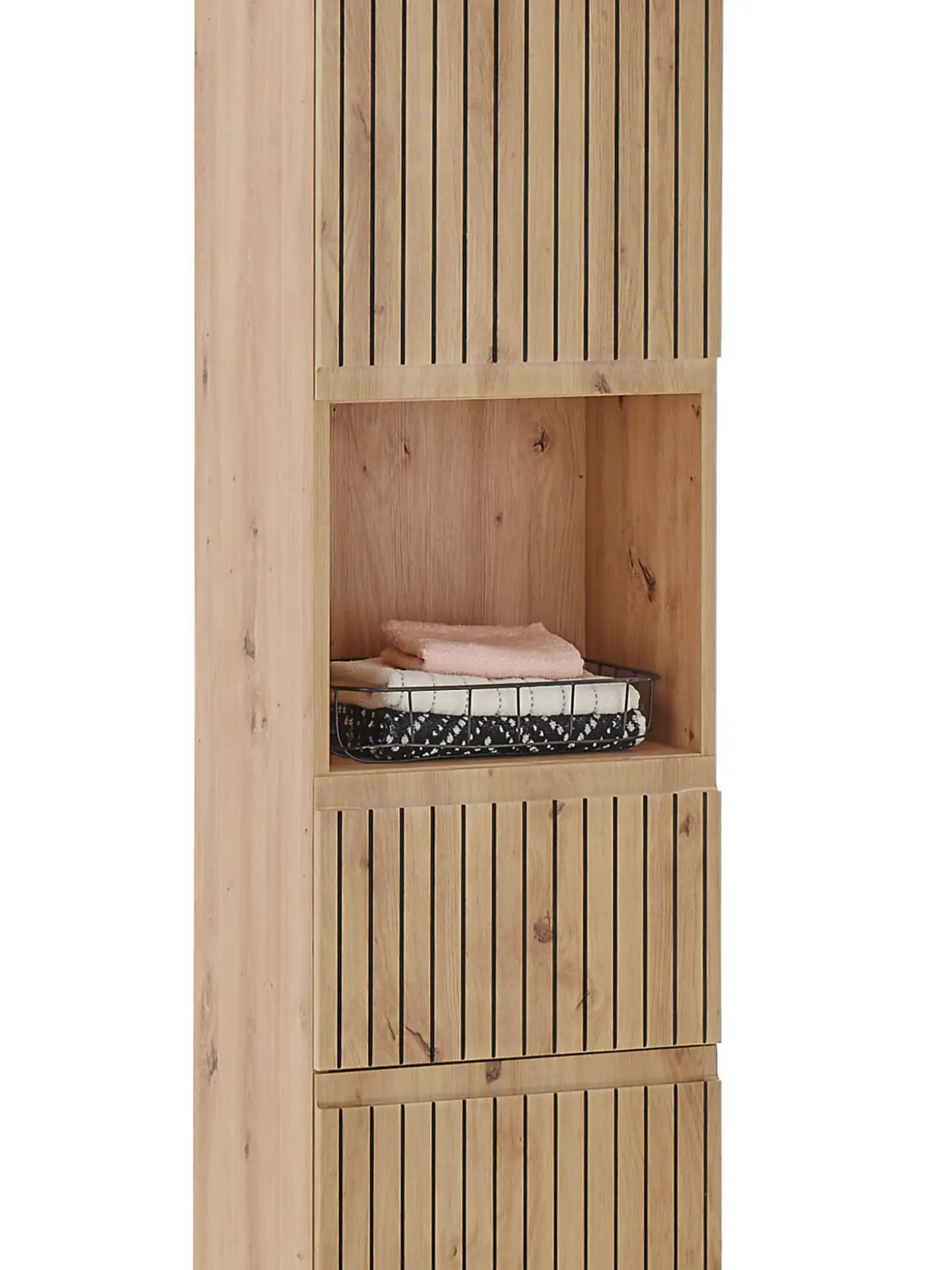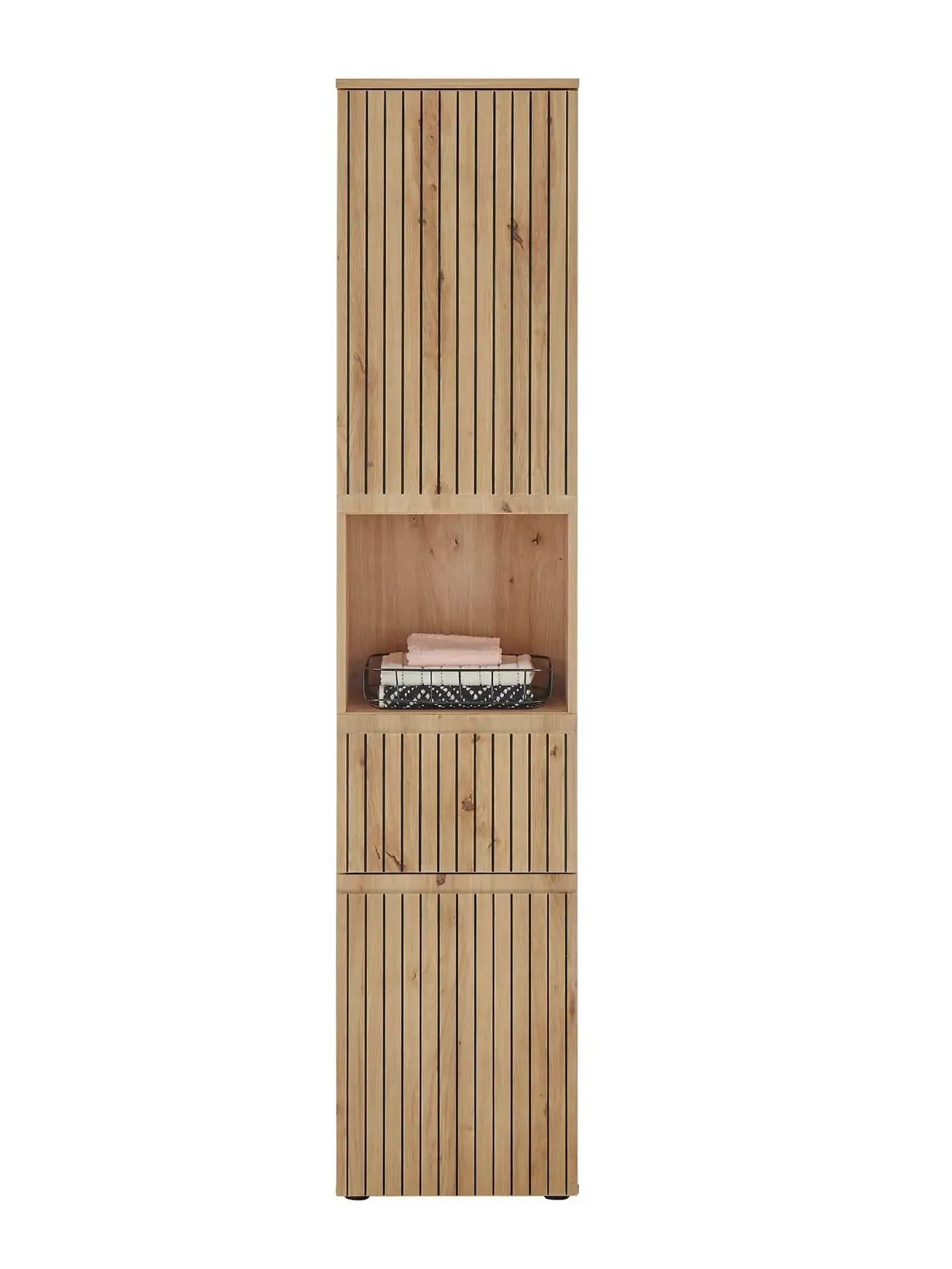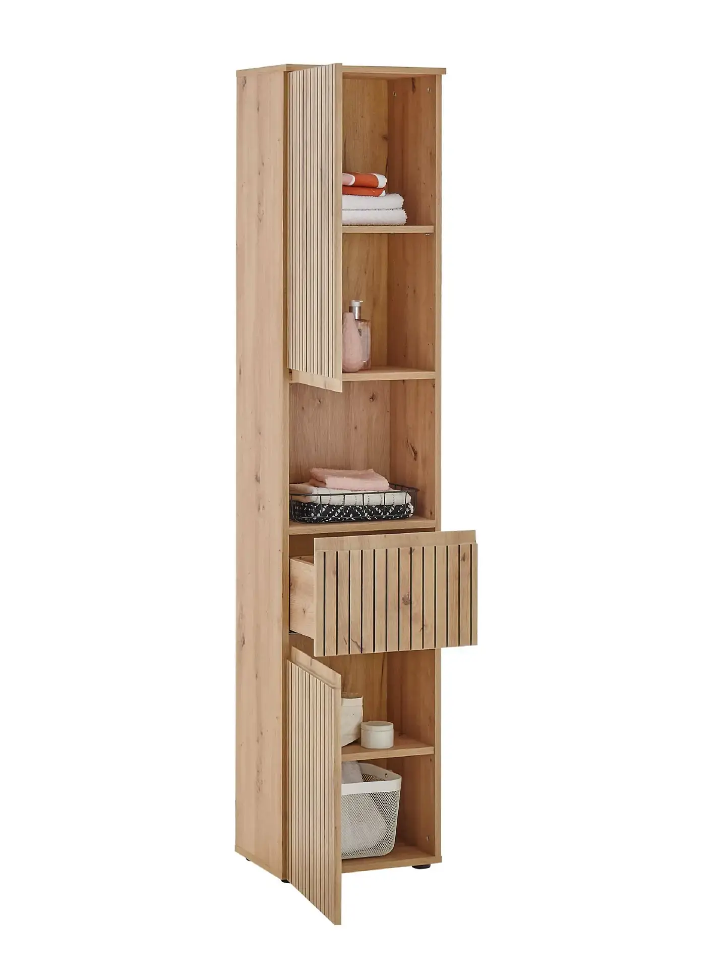 Elevate your bathroom with the Austin Tall Cabinet, a perfect blend of rustic charm and modern design. Its natural wood tones and sleek, slatted detailing create a warm, inviting atmosphere. With two spacious cupboards and four ample shelves, you can neatly organise towels, toiletries, and other essentials. The elegant pull drawer, complete with a discrete handle, provides a sophisticated touch and makes accessing smaller items effortless. While the open middle compartment is perfect for showcasing folded towels or decorative baskets. Perfect for those who appreciate both elegance and practicality, this cabinet brings a timeless, stylish upgrade to your bathroom décor.