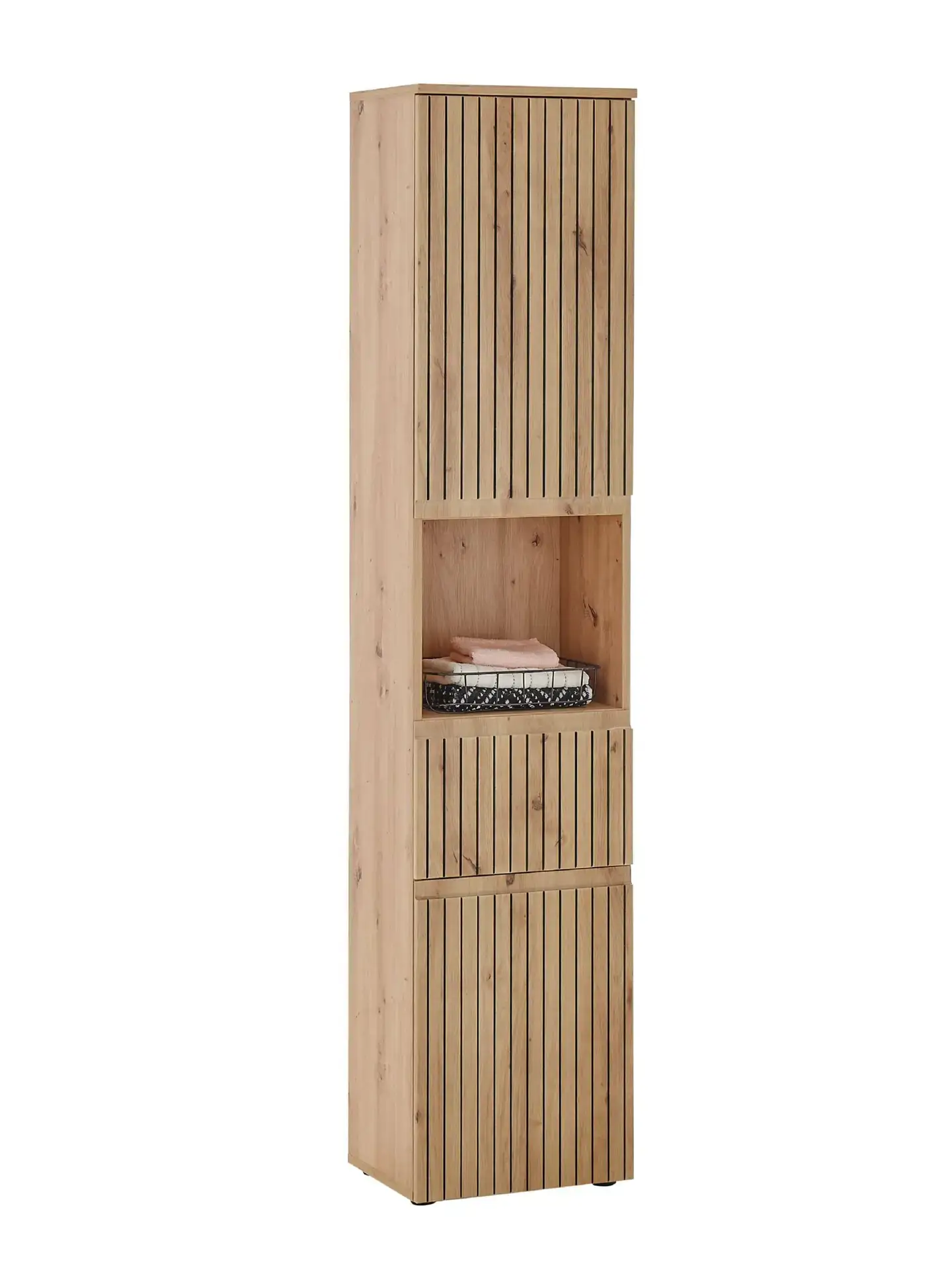 - Tall cabinet with two cupboards and four shelves offers versatile storage for towels, toiletries, and other bathroom essentials. Including an open middle compartment is ideal for displaying folded towels or decorative baskets, adding a stylish, personal touch to your bathroom.