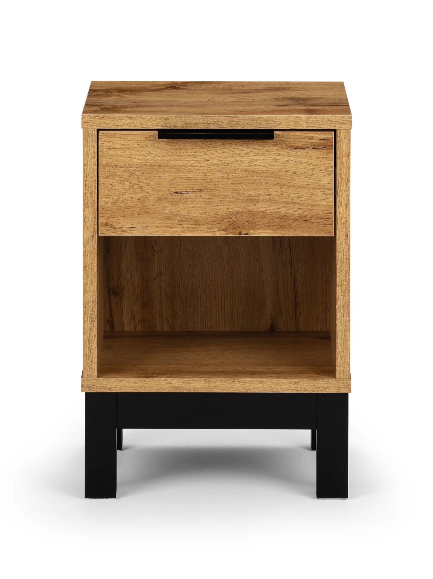 - Modern oak finish with contrasting black legs and handles.