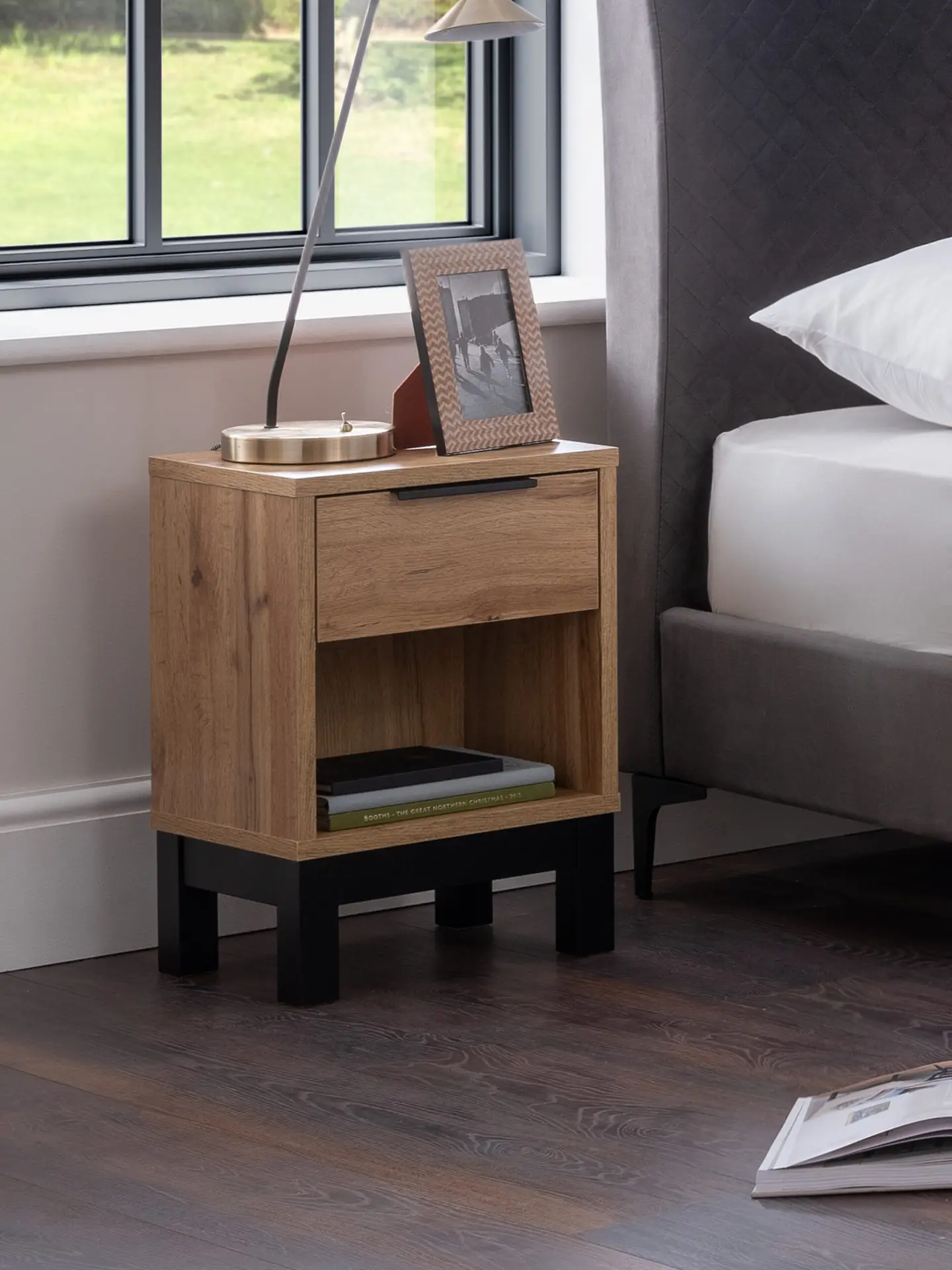 - Elegant Design: Crafted from premium oak wood, this bedside table offers a sturdy drawer with smooth metal glides and an open shelf for easy access to nighttime essentials. Perfect for modern and classic decor.