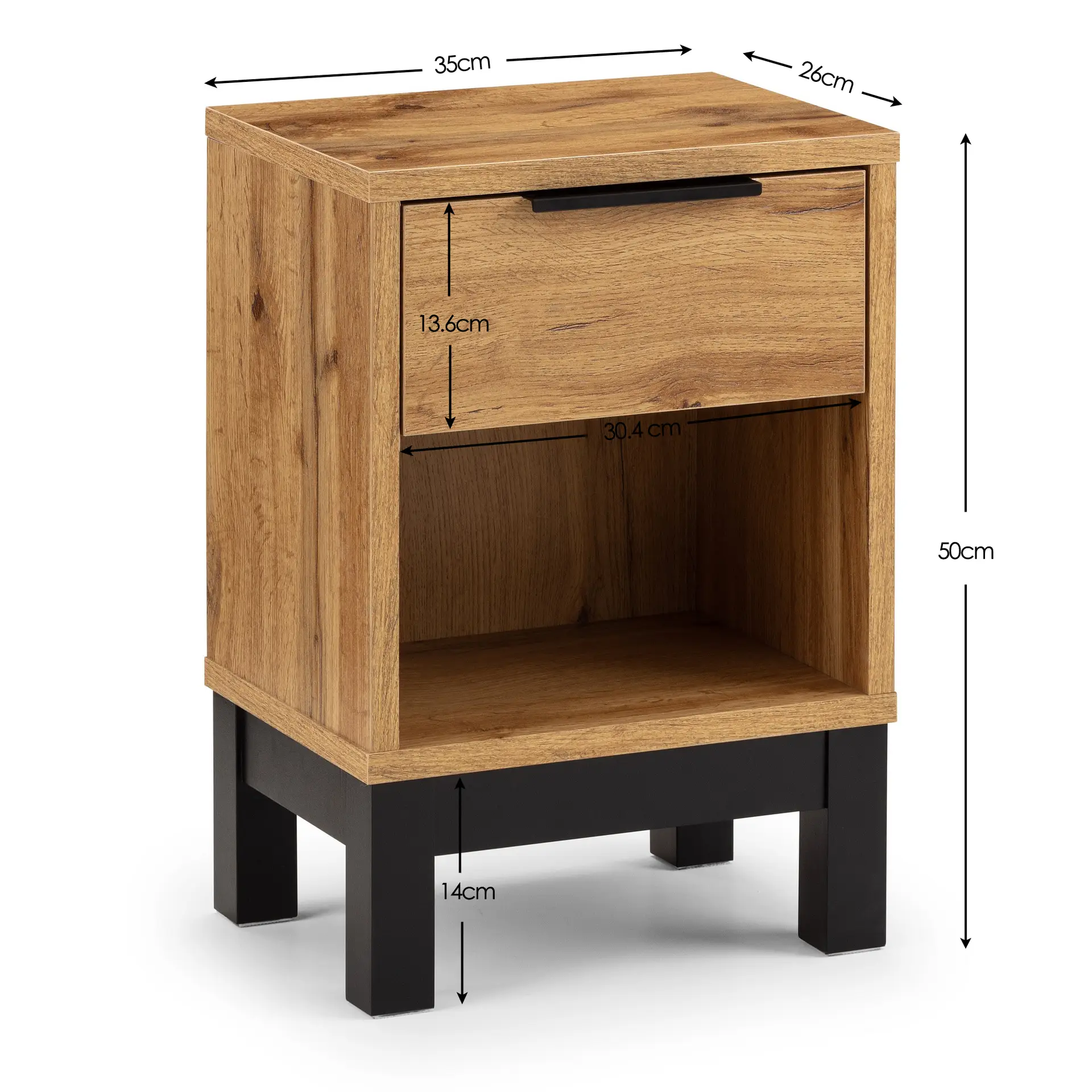 - Dimensions & Details: Measures Height: 50cm, Width: 35cm, Depth: 26cm with drawer interior and shelf space. Perfect for small to medium-sized bedrooms.