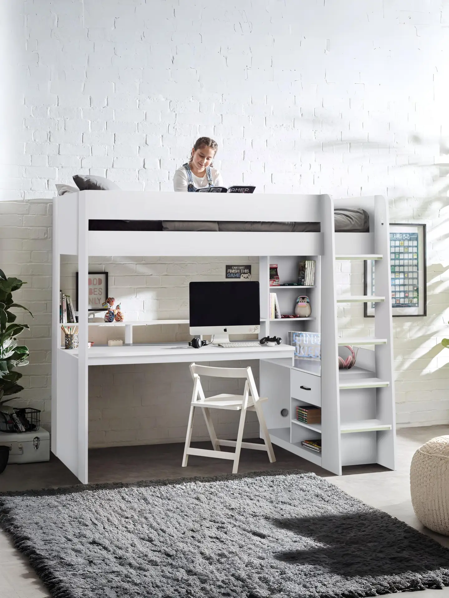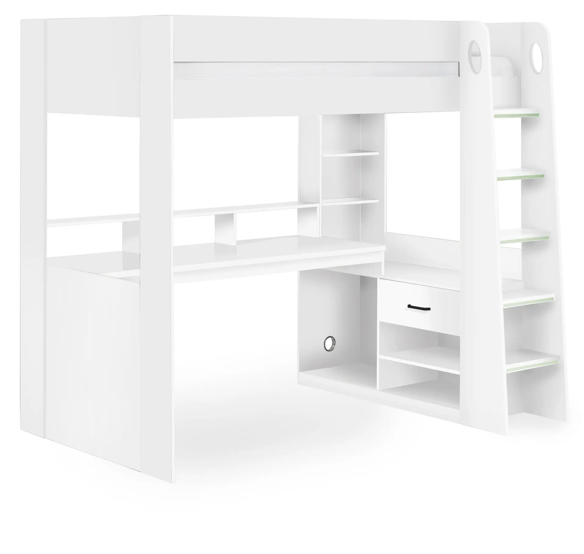 Step into the gaming sanctuary of your dreams with the Blaze Gaming Highsleeper – a harmonious blend of style and functionality. This beautifully crafted bunk bed, featuring a sleek white finish, is tailored to be the ultimate paradise for every gamer. Its built-in shelving and drawers seamlessly provide organised storage for gaming gear and essentials within arm’s reach. The wide-span desk offers abundant space for any gaming setup, while raised platforms effortlessly cradle monitors, offering an immersive gaming experience. Glow-in-the-dark steps guarantee a secure ascent to the bed space. Additionally, the bunk bed is available in black and pale woodgrain finish, presenting a diverse range of options to align with your personal style.