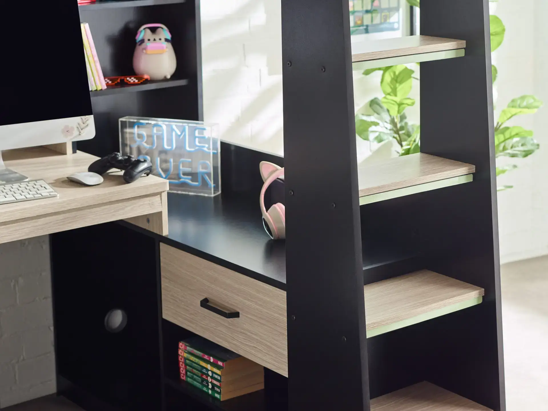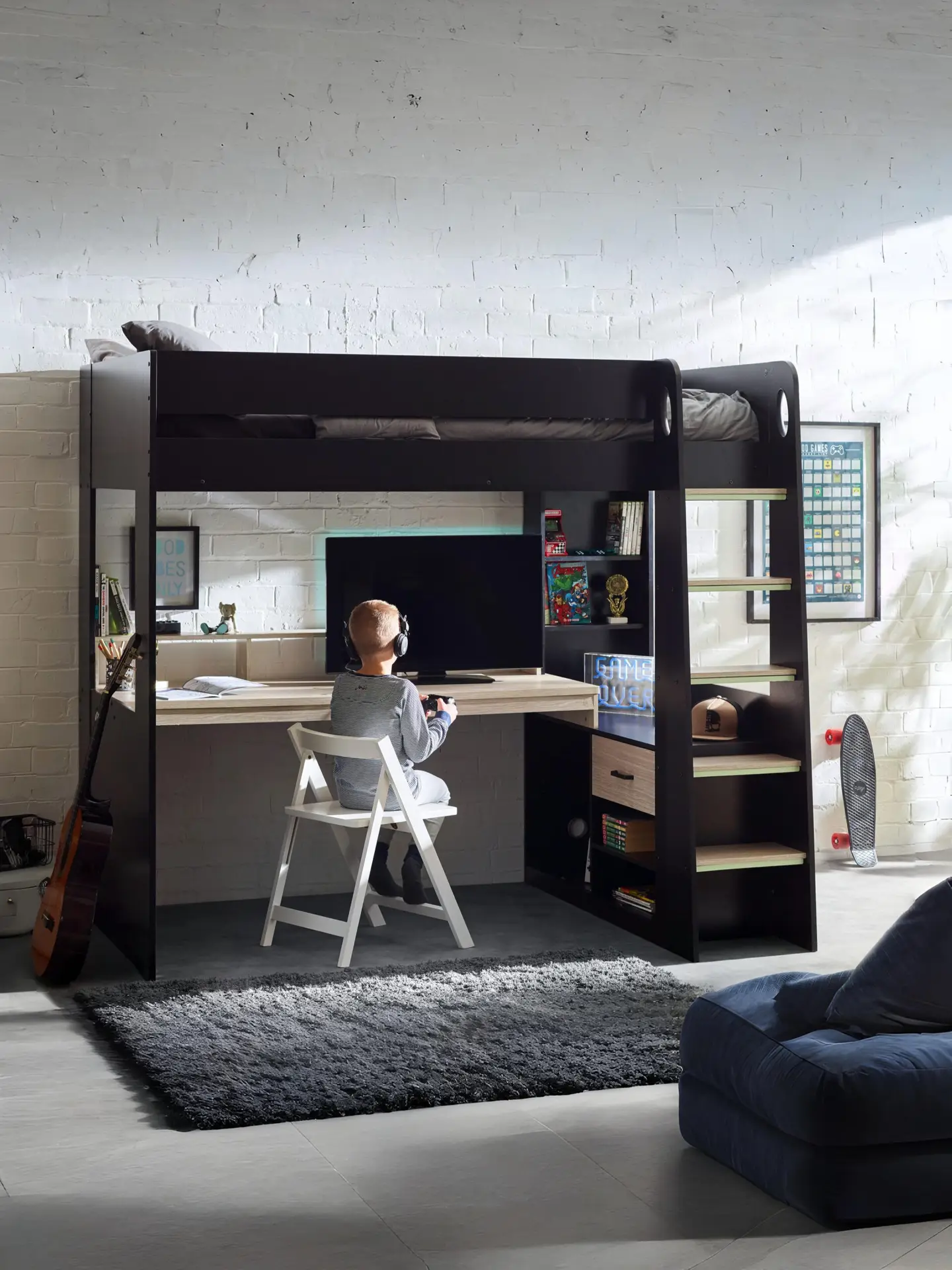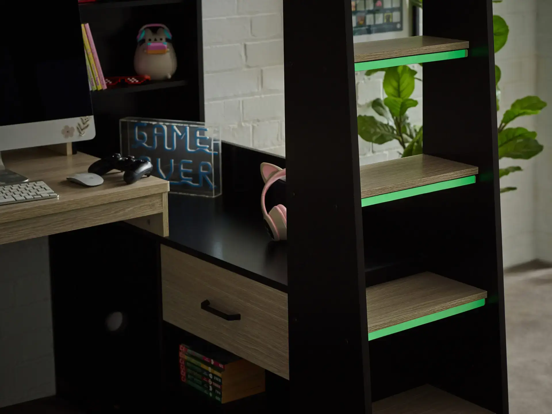 Step into the gaming sanctuary of your dreams with the Blaze Gaming Highsleeper – an exquisite fusion of style and functionality. This expertly crafted bunk bed, with a black and pale woodgrain finish, is beautifully designed to be the ultimate haven for every gamer. Its built-in shelving and drawers seamlessly provide organised storage for gaming gear and essentials within arm’s reach. The wide-span desk offers abundant space for any gaming setup, while raised platforms effortlessly cradle monitors, offering an immersive gaming experience. Glow-in-the-dark steps guarantee a secure ascent to the elevated gaming realm. Additionally, the bunk bed is available in a sleek white finish, presenting a diverse range of options to align with your personal style.