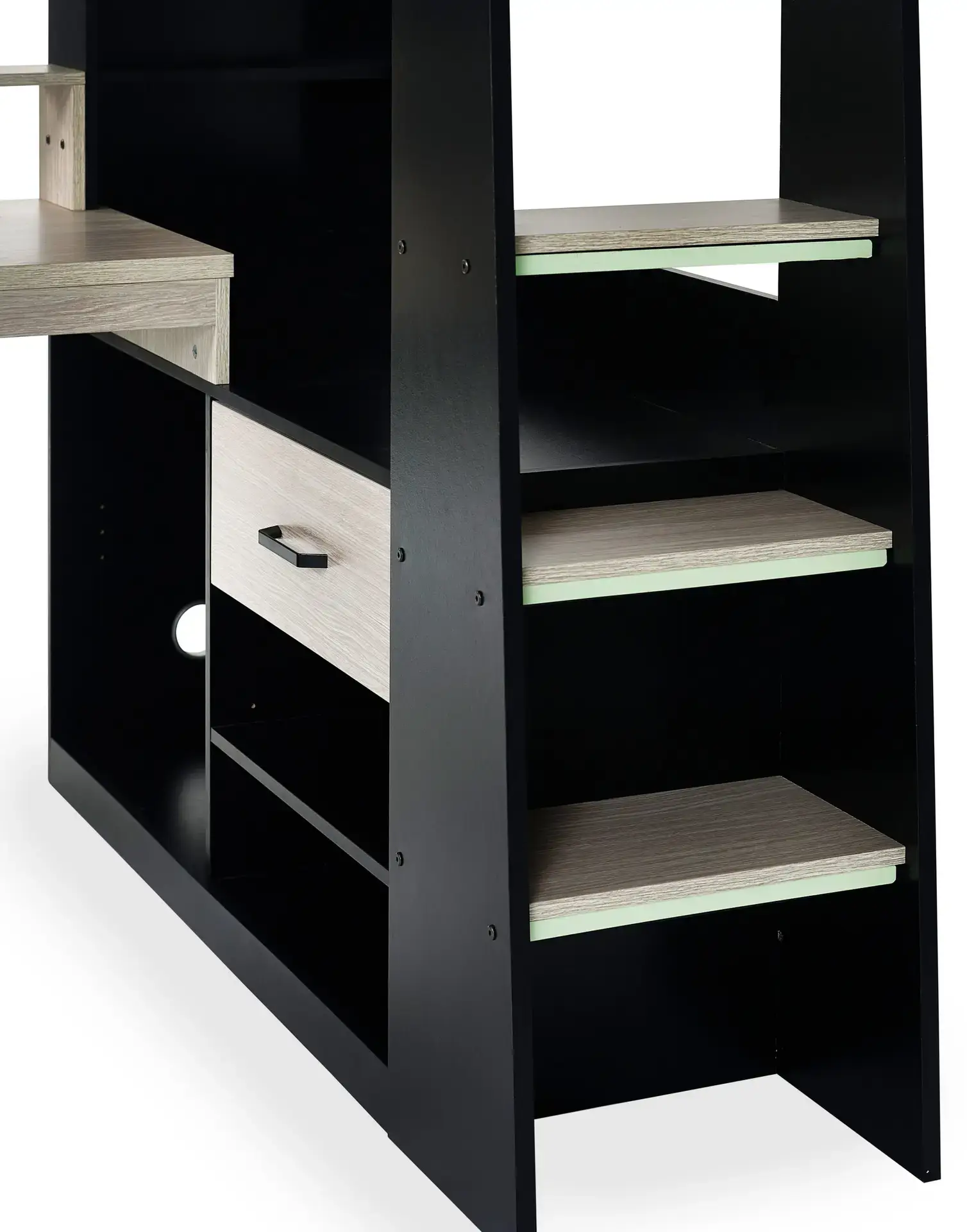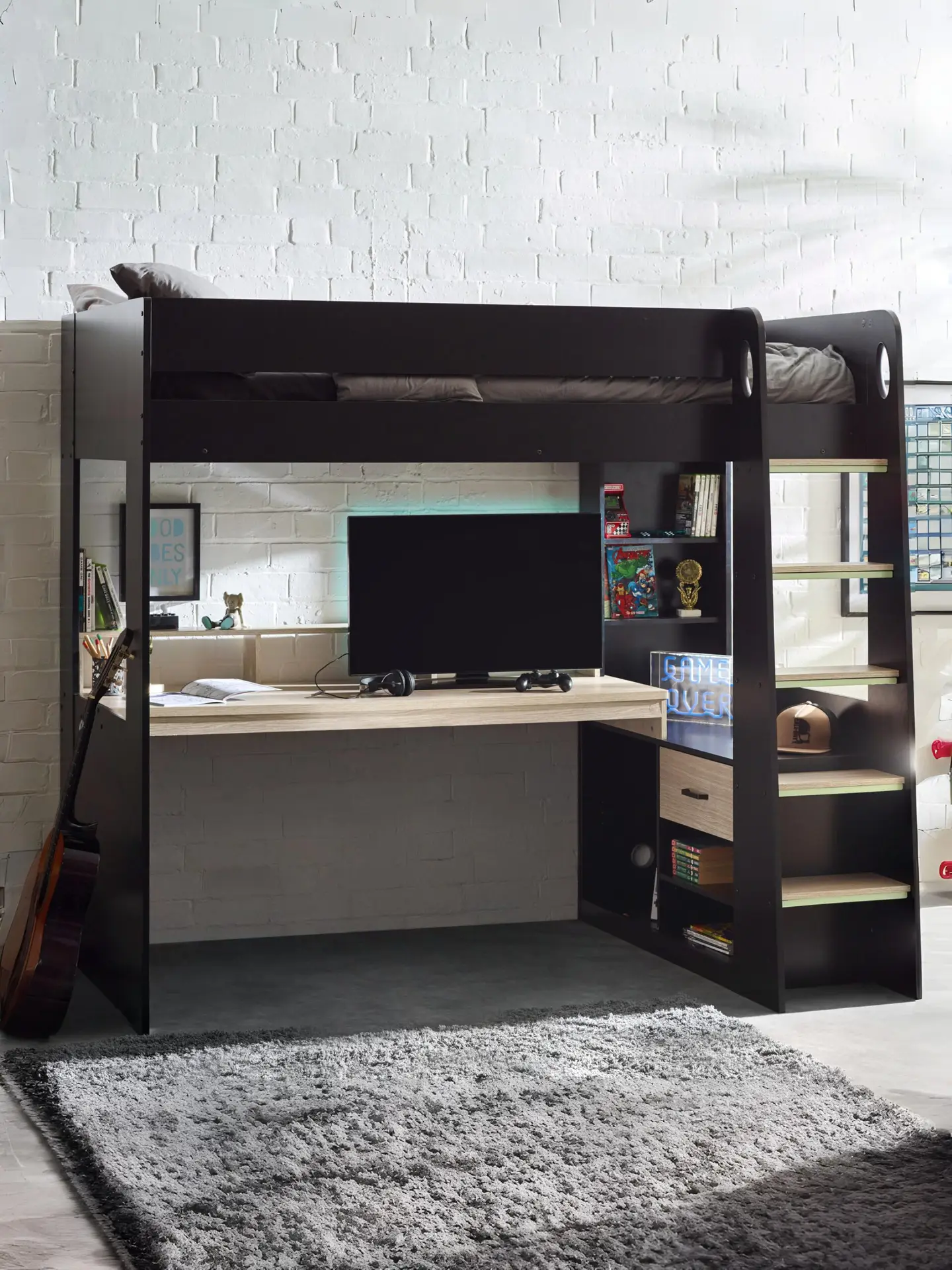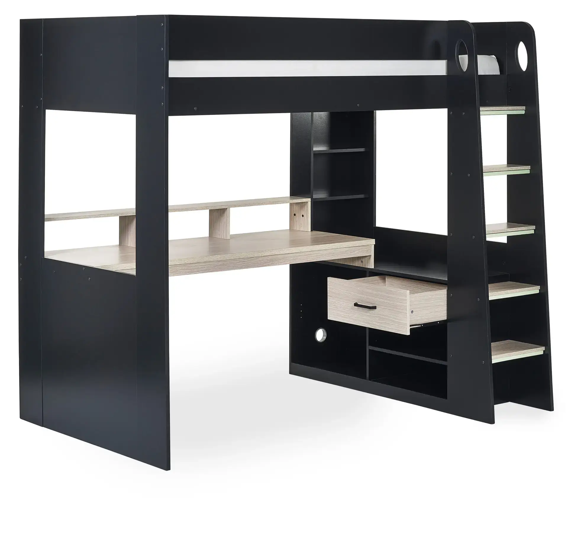 Step into the gaming sanctuary of your dreams with the Blaze Gaming Highsleeper – an exquisite fusion of style and functionality. This expertly crafted bunk bed, with a black and pale woodgrain finish, is beautifully designed to be the ultimate haven for every gamer. Its built-in shelving and drawers seamlessly provide organised storage for gaming gear and essentials within arm’s reach. The wide-span desk offers abundant space for any gaming setup, while raised platforms effortlessly cradle monitors, offering an immersive gaming experience. Glow-in-the-dark steps guarantee a secure ascent to the elevated gaming realm. Additionally, the bunk bed is available in a sleek white finish, presenting a diverse range of options to align with your personal style.