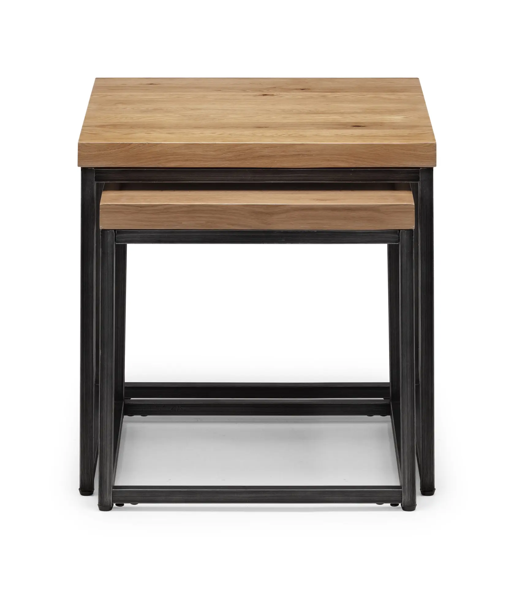 Made from solid oak, these Nesting Lamp Tables offer a rustic finish emphasising the stunning natural wood grain. The Brooklyn Nesting Lamp Tables offer a vintage edge featuring industrial style metal legs. Stylish, functional and well proportioned, these lamp tables are a perfect space saving solution suitable for a wide range of modern decor. Part of the Julian Bowen Brooklyn Dining and Occasional Collection.