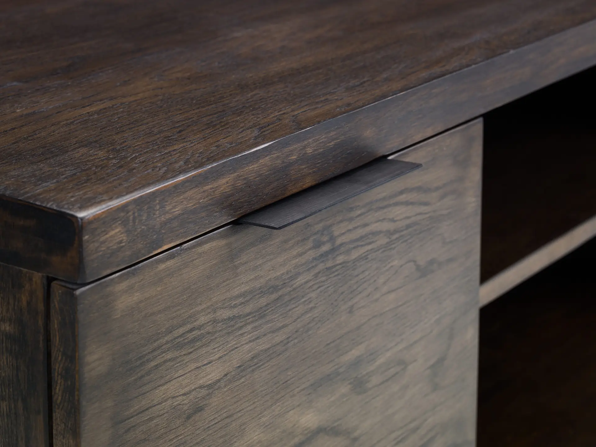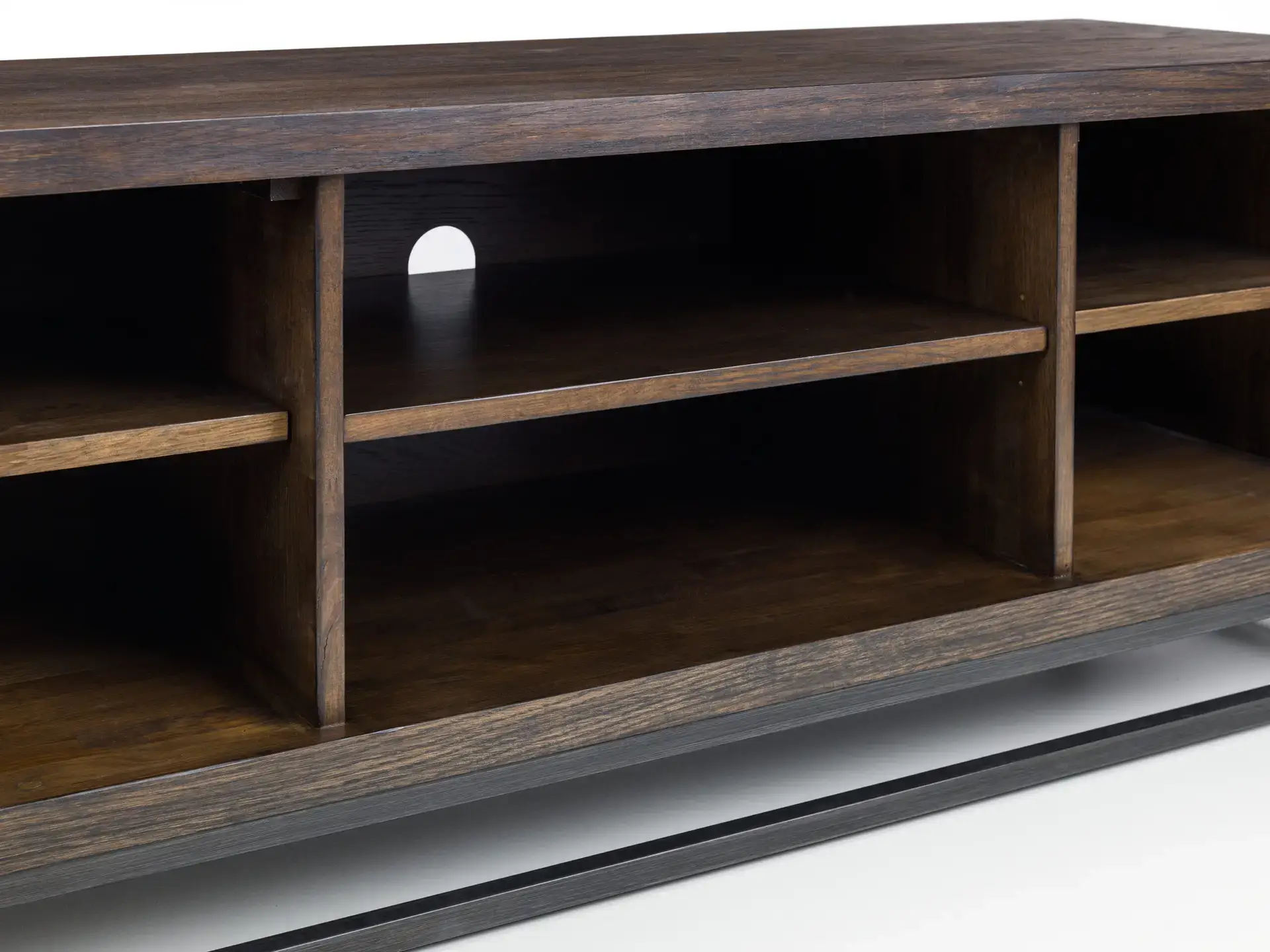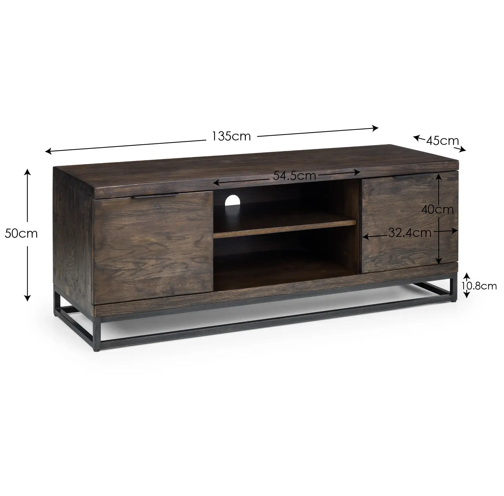 Made from solid oak, this TV Unit offers a rustic dark oak finish emphasising the stunning natural wood grain. The Brooklyn TV Unit offers a vintage edge featuring industrial style metal legs. Featuring two cupboards with shelves, and an additional shelf in the middle suitable for a console, this TV Unit is perfect for a wide range of modern decor. Part of the Julian Bowen Brooklyn Dining and Occasional Collection.