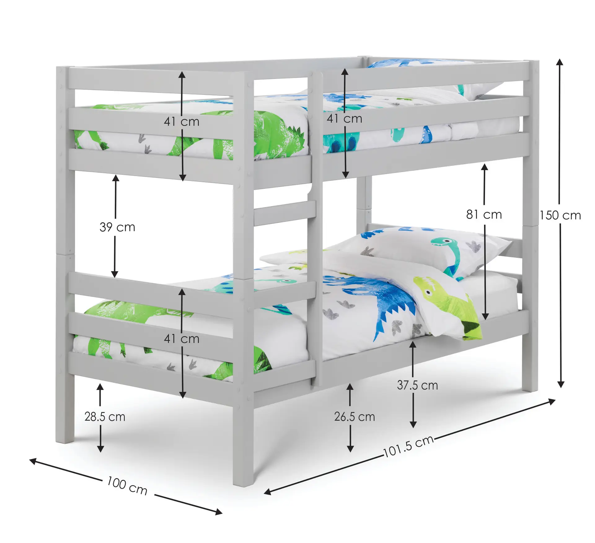 - Dimensions: The overall dimensions are 201cm (L) x 102cm (W) x 154cm (H). The bed includes a slatted base for both the top and bottom bunks, providing excellent mattress support and ventilation.