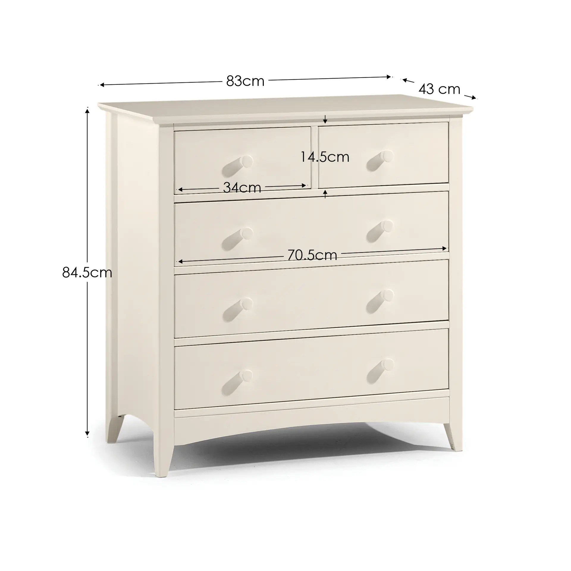 Cameo is a beautiful stone white lacquered bedroom range. Its timeless shaker design is the perfect accompaniment to any interior style and is perfect for grown-up bedrooms and children’s bedrooms alike. Solid pine frames ensure a sturdy and durable construction. The Cameo 3+2 chest offers a great storage solution with 2 small drawers and 3 large drawers.