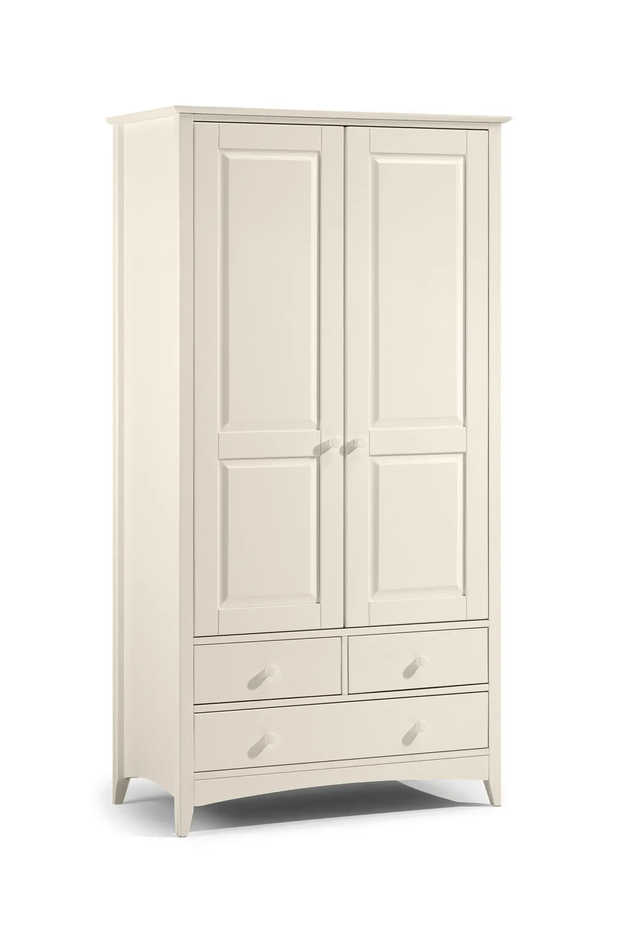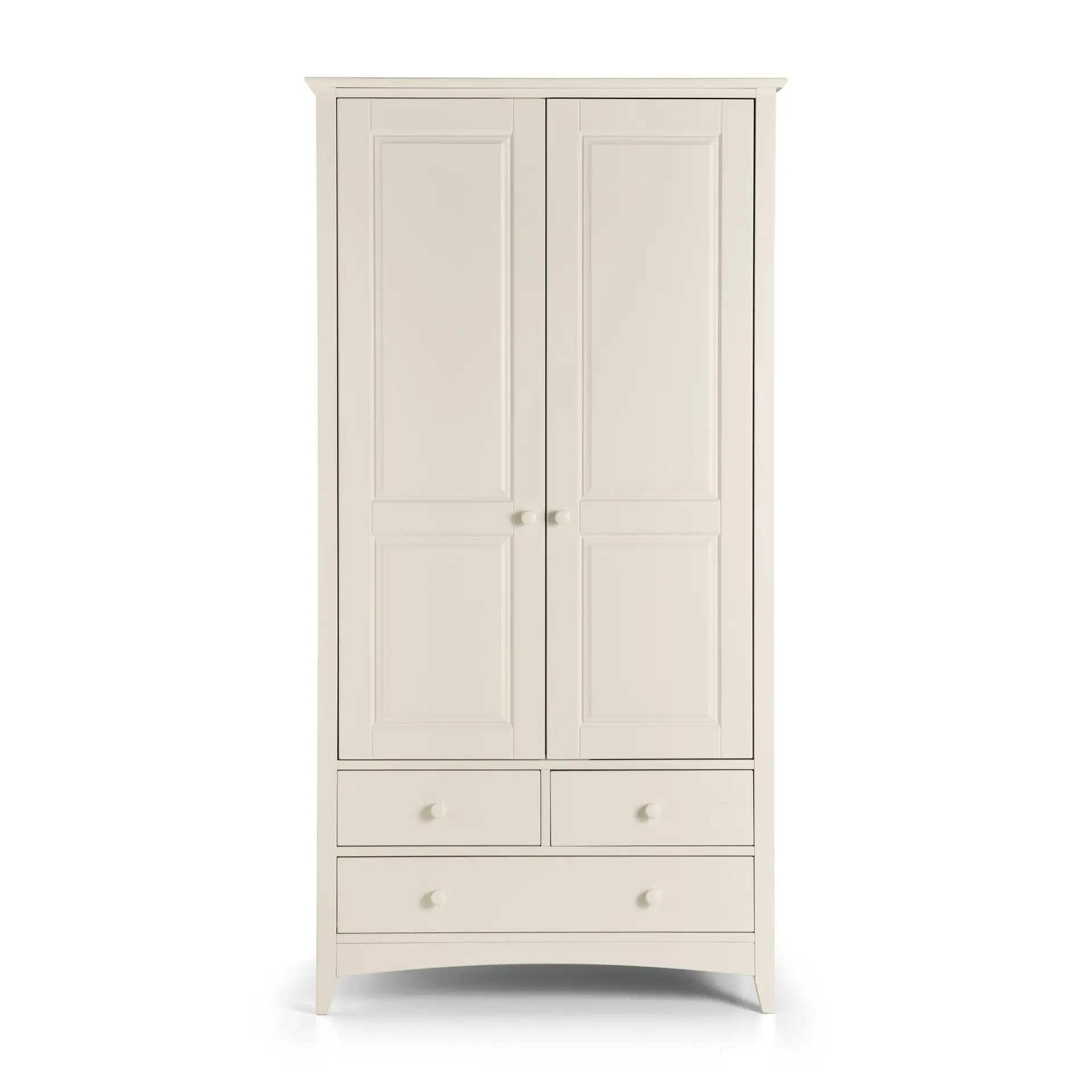Cameo is a beautiful stone white lacquered bedroom range. Its timeless shaker design is the perfect accompaniment to any interior style and is perfect for grown-up bedrooms and children’s bedrooms alike. Solid pine frames ensure a sturdy and durable construction. The Cameo combination wardrobe has 2 doors and 3 drawers. The wardrobe also includes an internal shelf above the hanging rail.