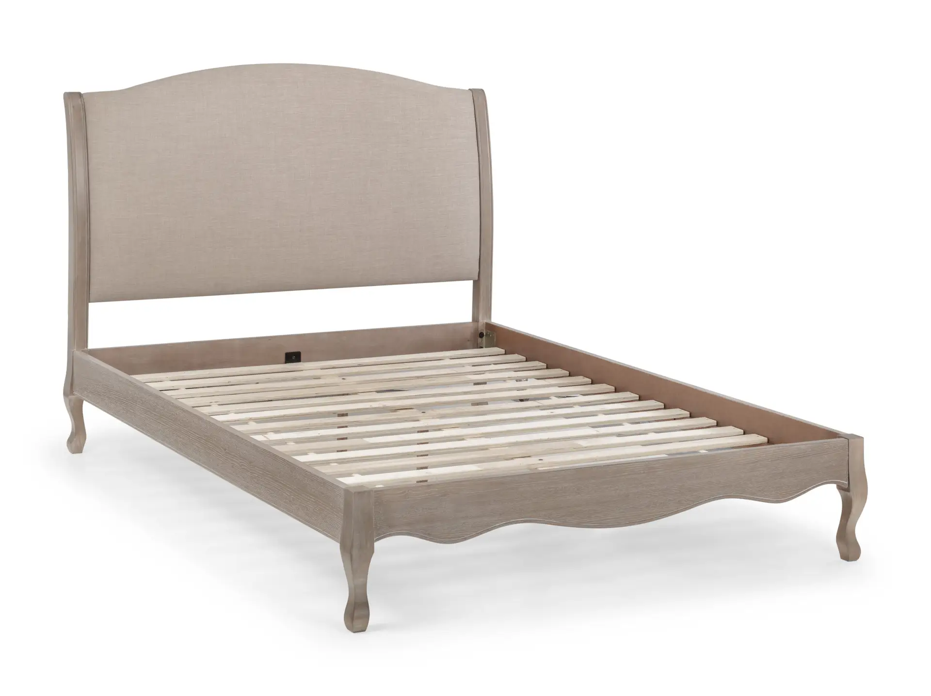 Inspired from a classic French design, the Camille bed excels in elegance. Featuring traditional ornate details, from the curved and arched headboard, to a scalloped footboard with cabriole legs, this bed is the definition of a timeless design. The frame is finished in a limed oak effect, with a soft upholstered headboard covered in an oatmeal linen fabric. The Camille Bed is available in 135cm Double, 150cm King, and 180cm super king sizes.