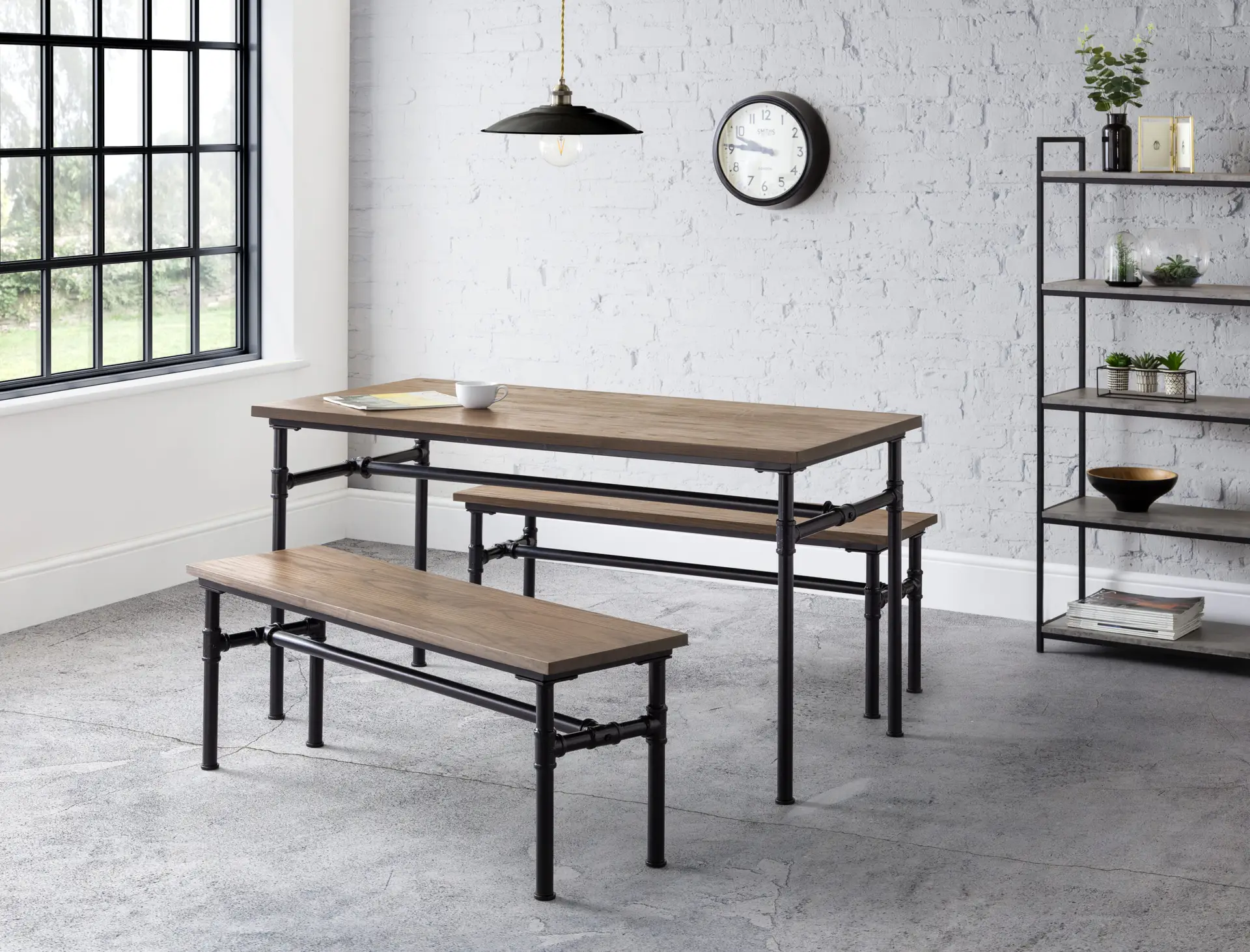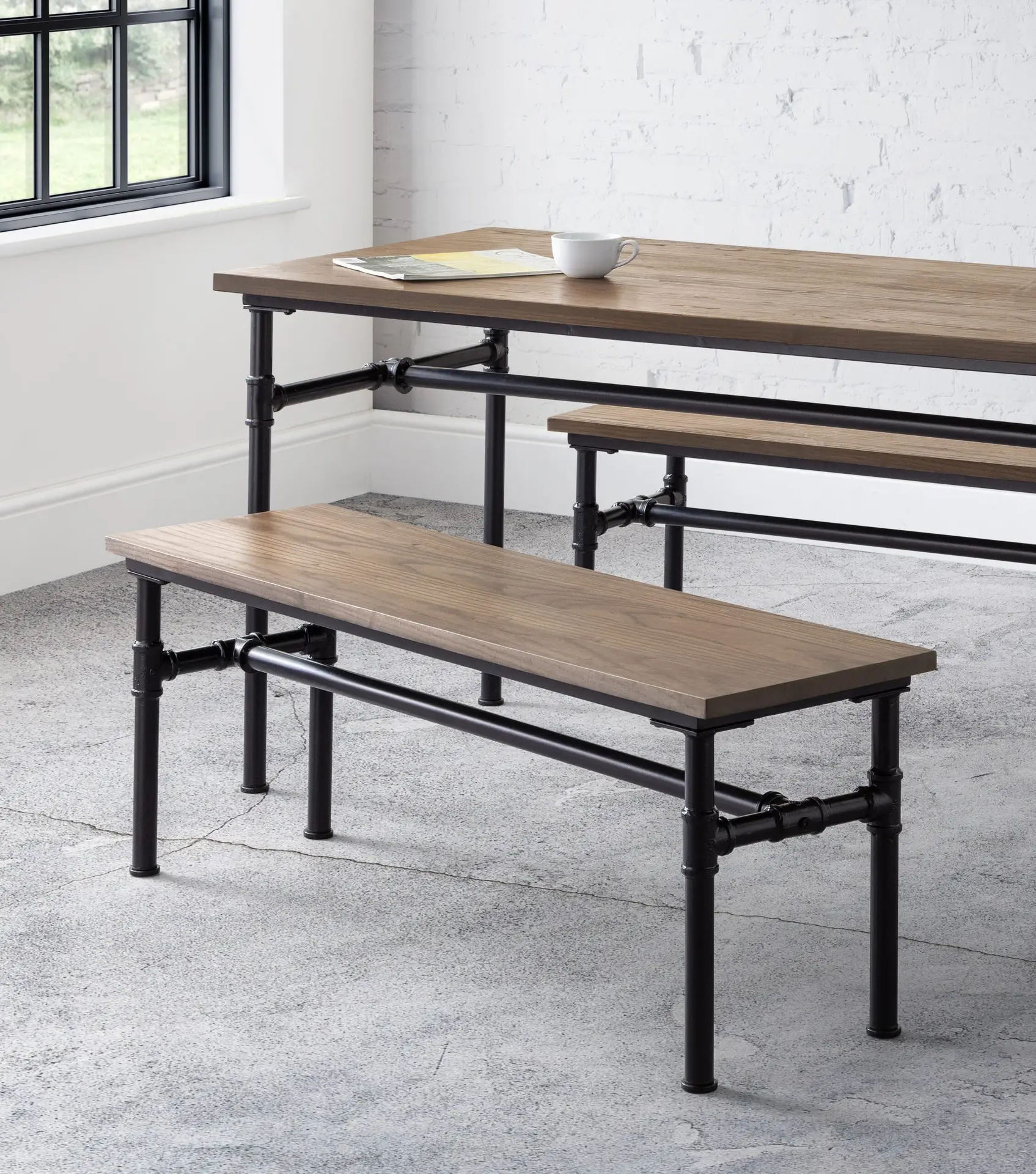 Seating up to 2 people, the Carnegie Bench offers an industrial design, perfect for your kitchen, dining room and other interior space. The use of solid Elm wood in a mocha finish adds a distinctive statement look, whilst beautifully showing off the wood grain. Finished with powder-coated steel legs in a pipework style, this Bench is perfect with the Carnegie Dining Table.