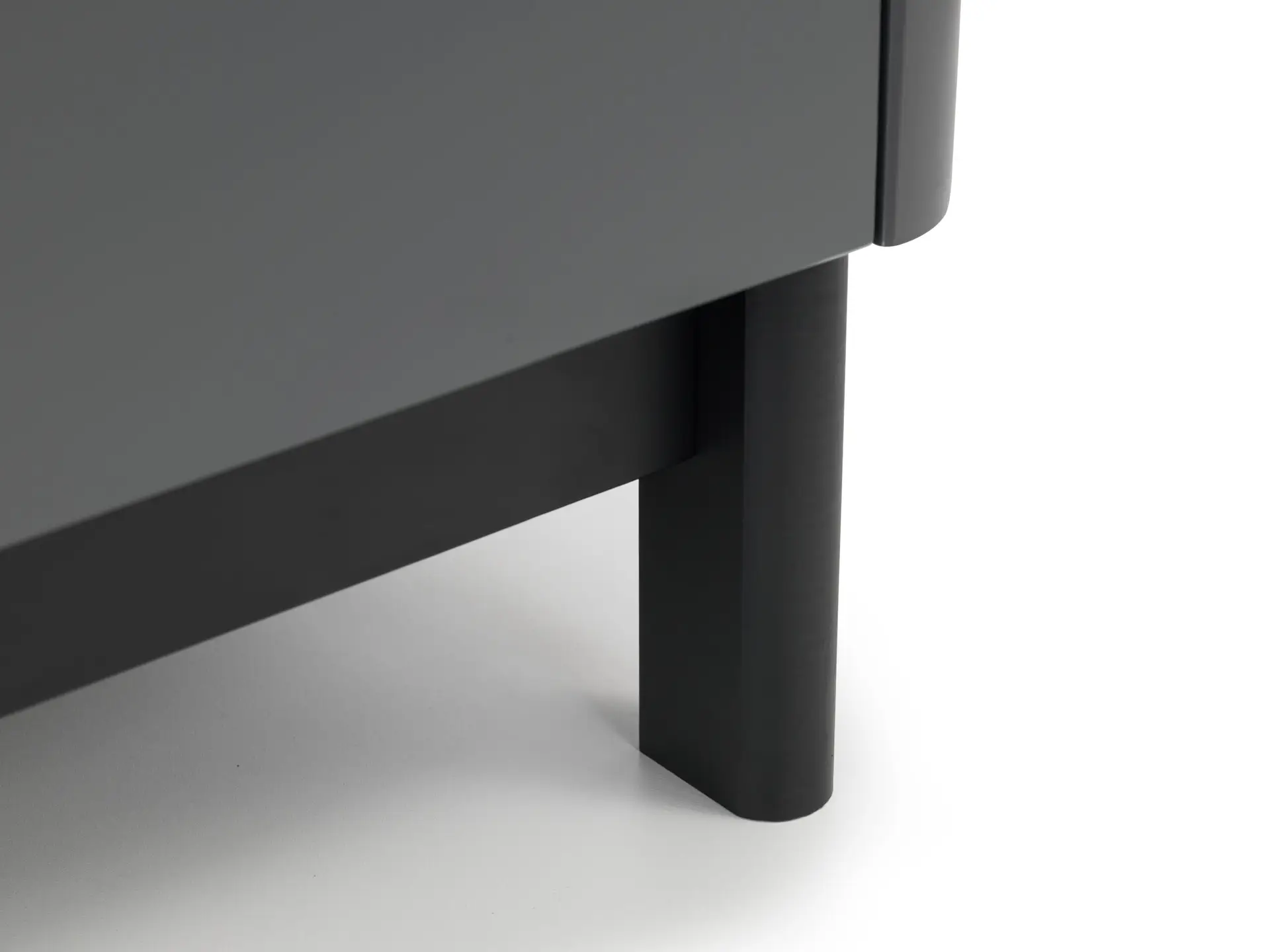The Chloe Bedroom collection has a modern, retro style finished in a storm grey lacquer with satin black wooden legs and handles. The corners are rounded for a softer look, creating perfect balance between style and functionality. This wardrobe features a large hanging area behind 2 doors, along with a drawer for additional storage.