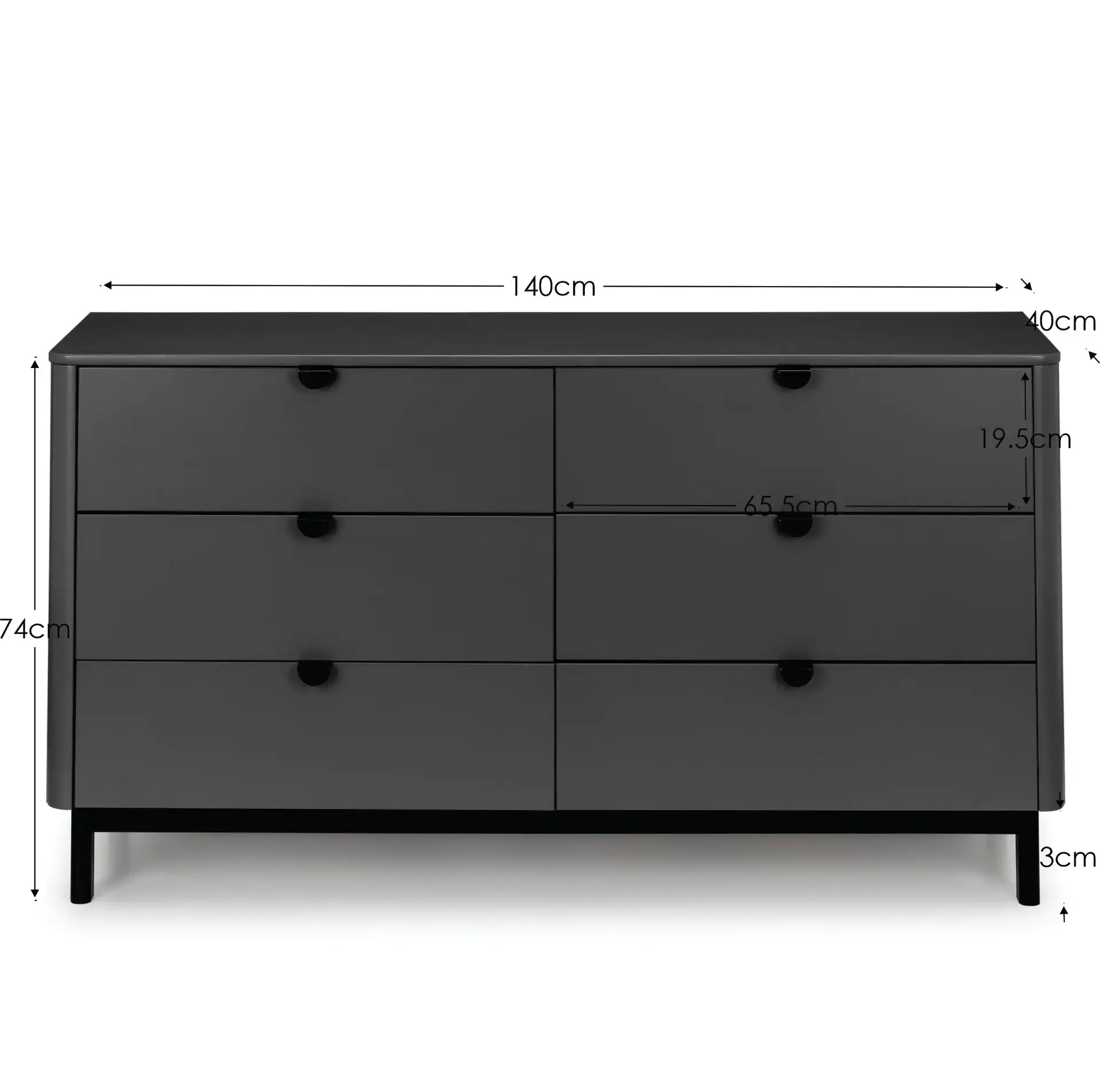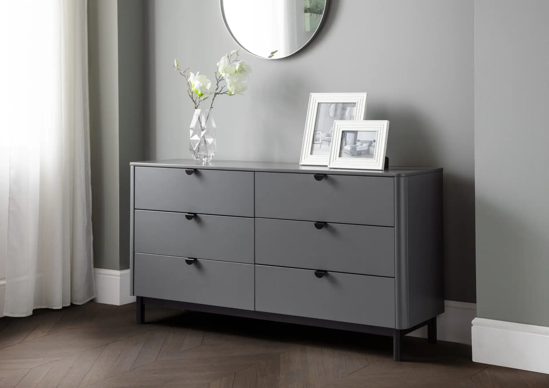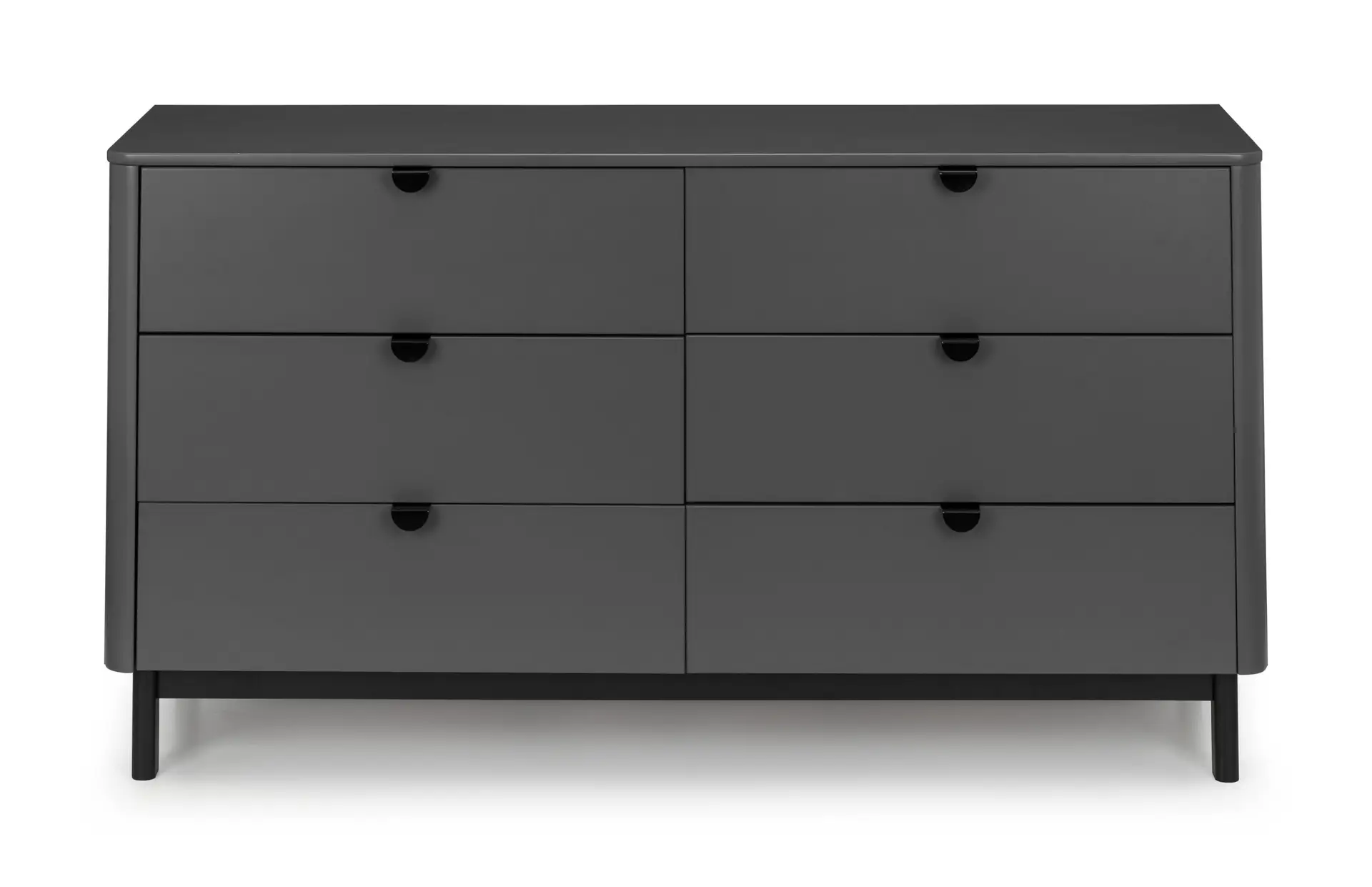 The Chloe Bedroom collection has a modern, retro style finished in a storm grey lacquer with satin black wooden legs and handles. The corners are rounded for a softer look, creating perfect balance between style and functionality. Featuring 6 large drawers, this chest is perfect for neatly storing your clothes.