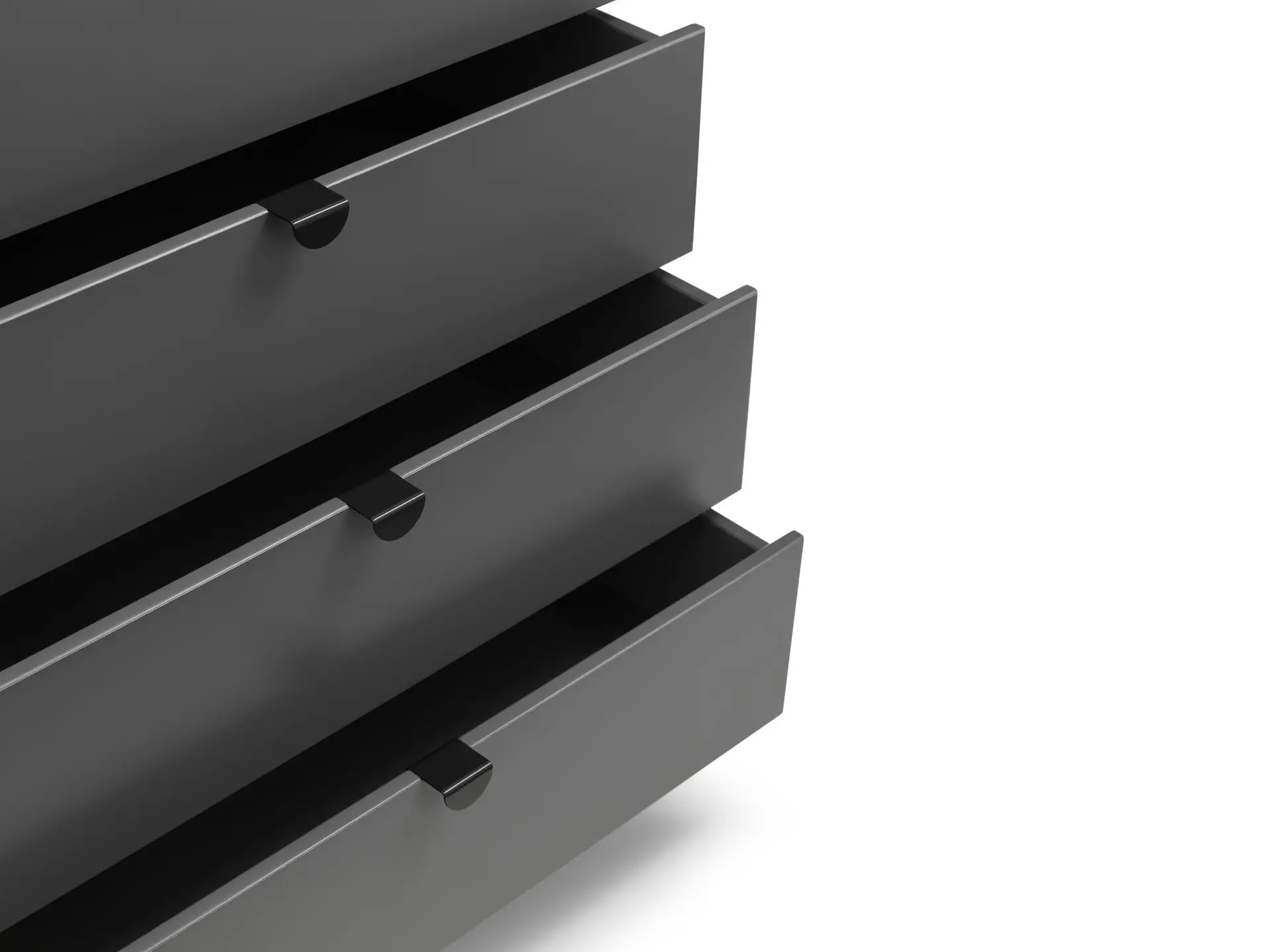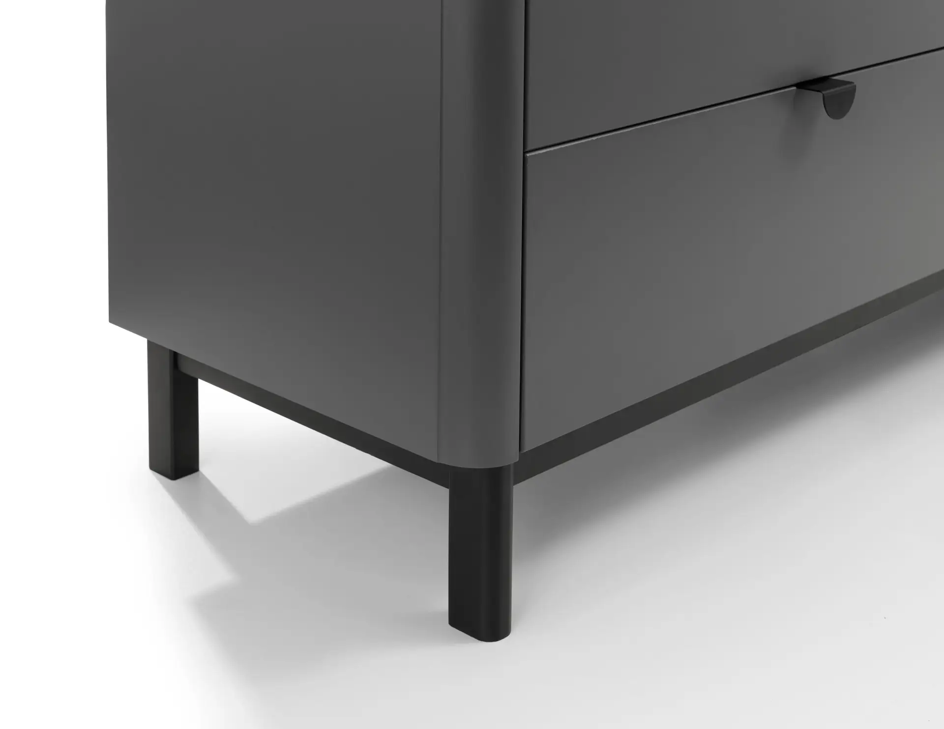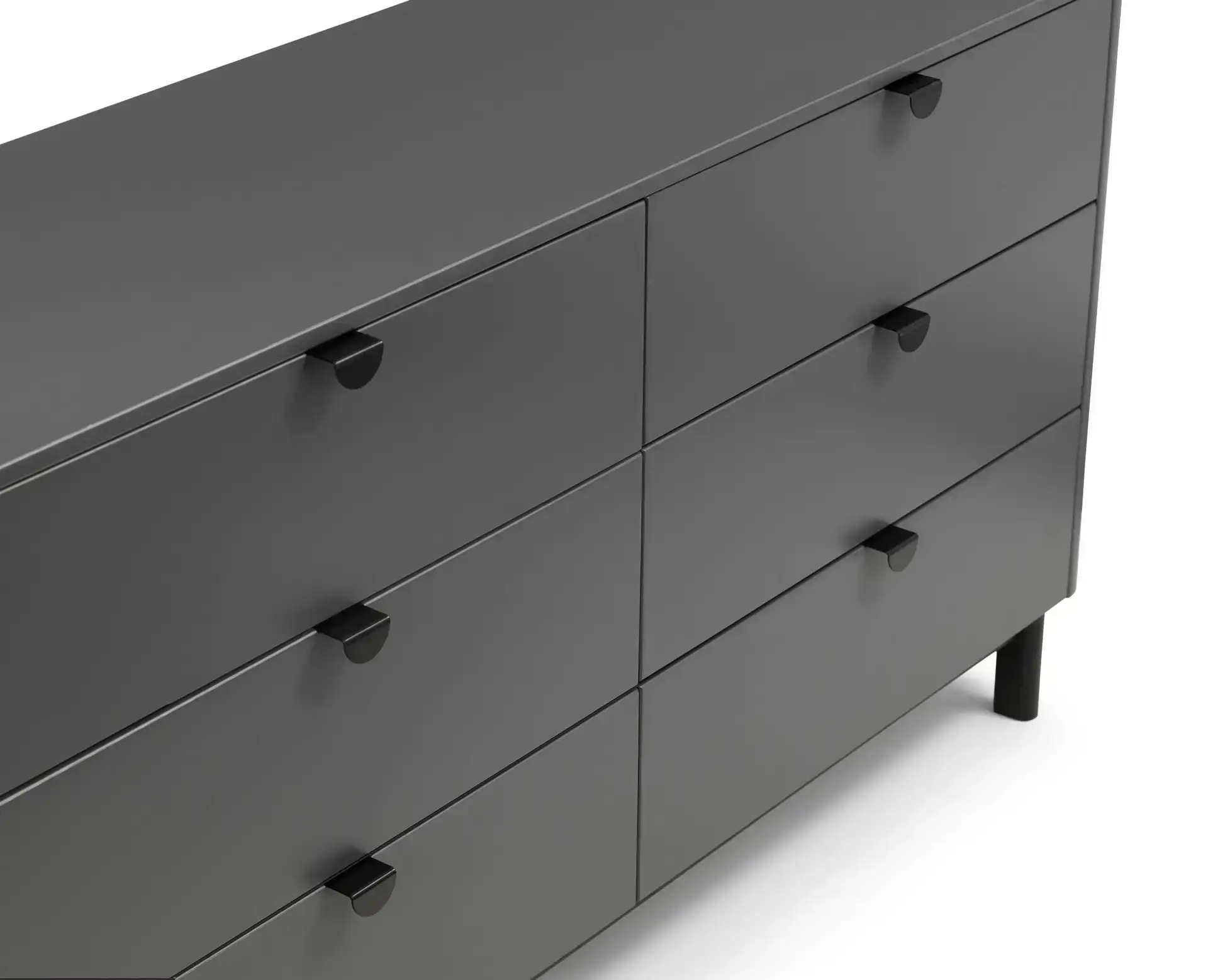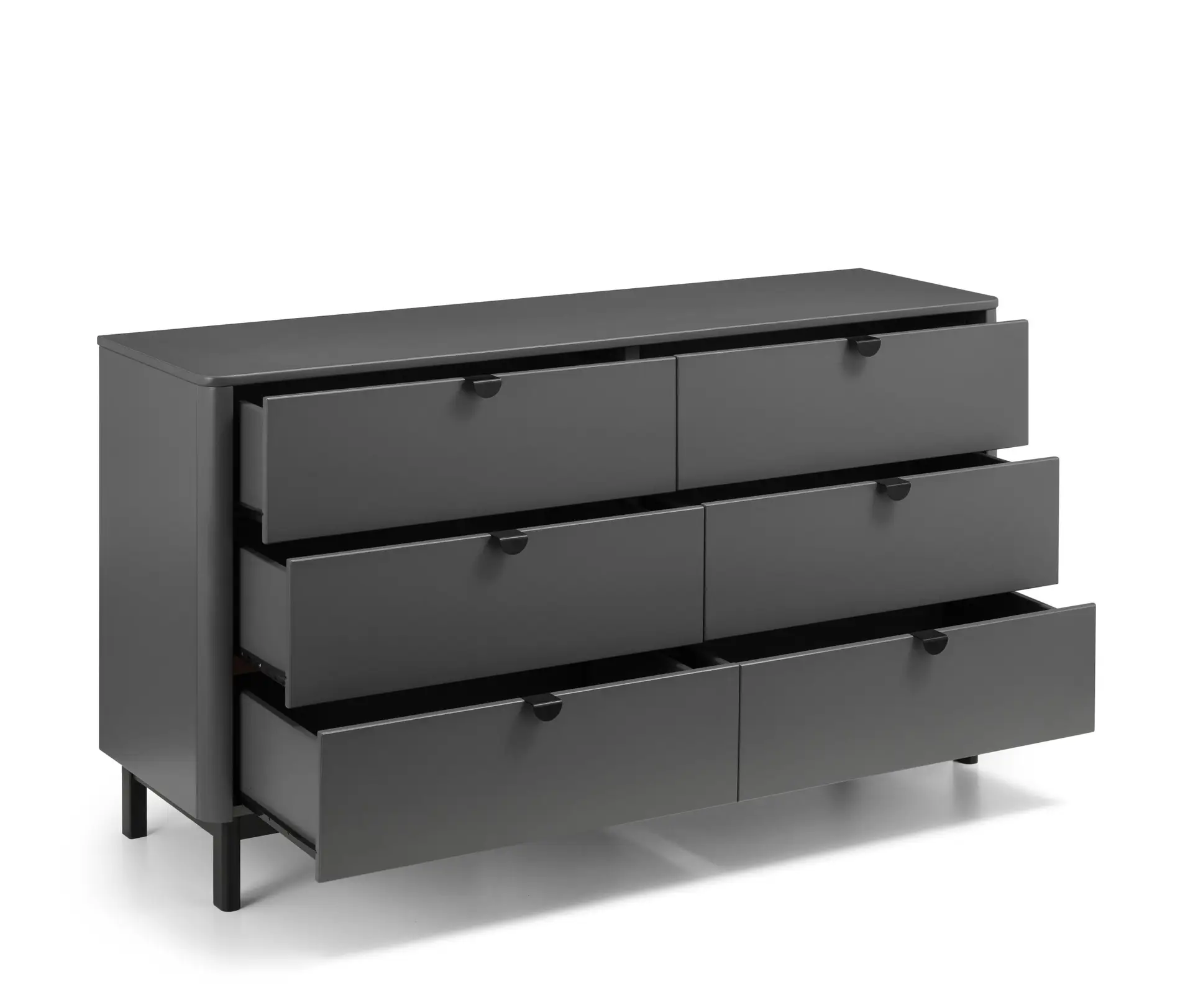 The Chloe Bedroom collection has a modern, retro style finished in a storm grey lacquer with satin black wooden legs and handles. The corners are rounded for a softer look, creating perfect balance between style and functionality. Featuring 6 large drawers, this chest is perfect for neatly storing your clothes.