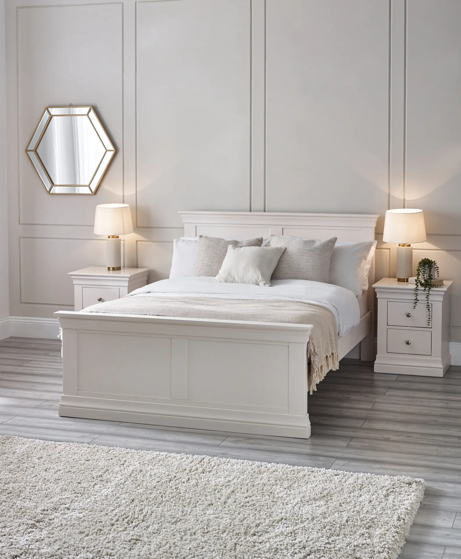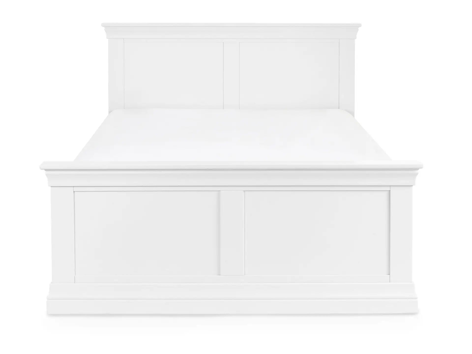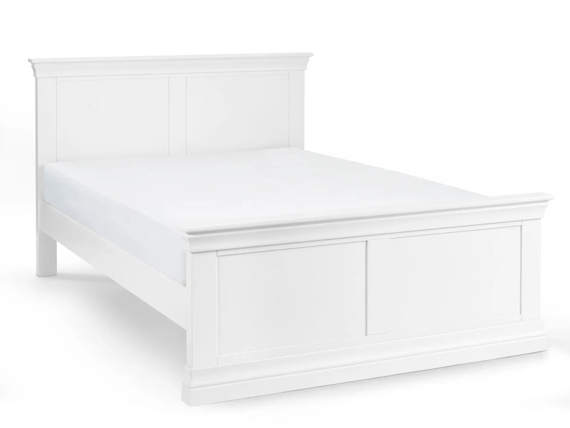 Add a touch of French elegance to your bedroom with the Clermont Bed in Surf White. This beautiful bed is crafted from a blend of pine and MDF, offering a combination of style and durability that stands the test of time. The sleek surf white finish brightens up any room, while solid pine slats ensure robust support for a restful night’s sleep. Charming details like top tapered cornices and a distinctive cut-out plinth base gives this bed a sophisticated edge. Its timeless design is a perfect fit for both modern and traditional homes. Mattress sold separately.
