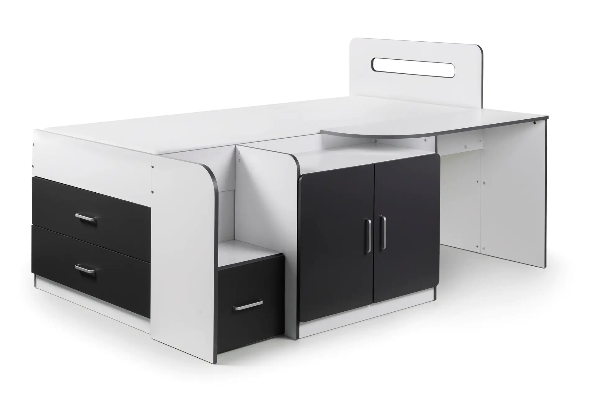 An innovative and highly functional cabin bed offering incredible versatility with three storage drawers, a cupboard, shelf and desk neatly integrated into a sharp, contemporary design. A sleek matt finish in white and charcoal grey makes the Cookie Cabin Bed the perfect combination of style and practicality for any children’s or teenager’s bedroom.