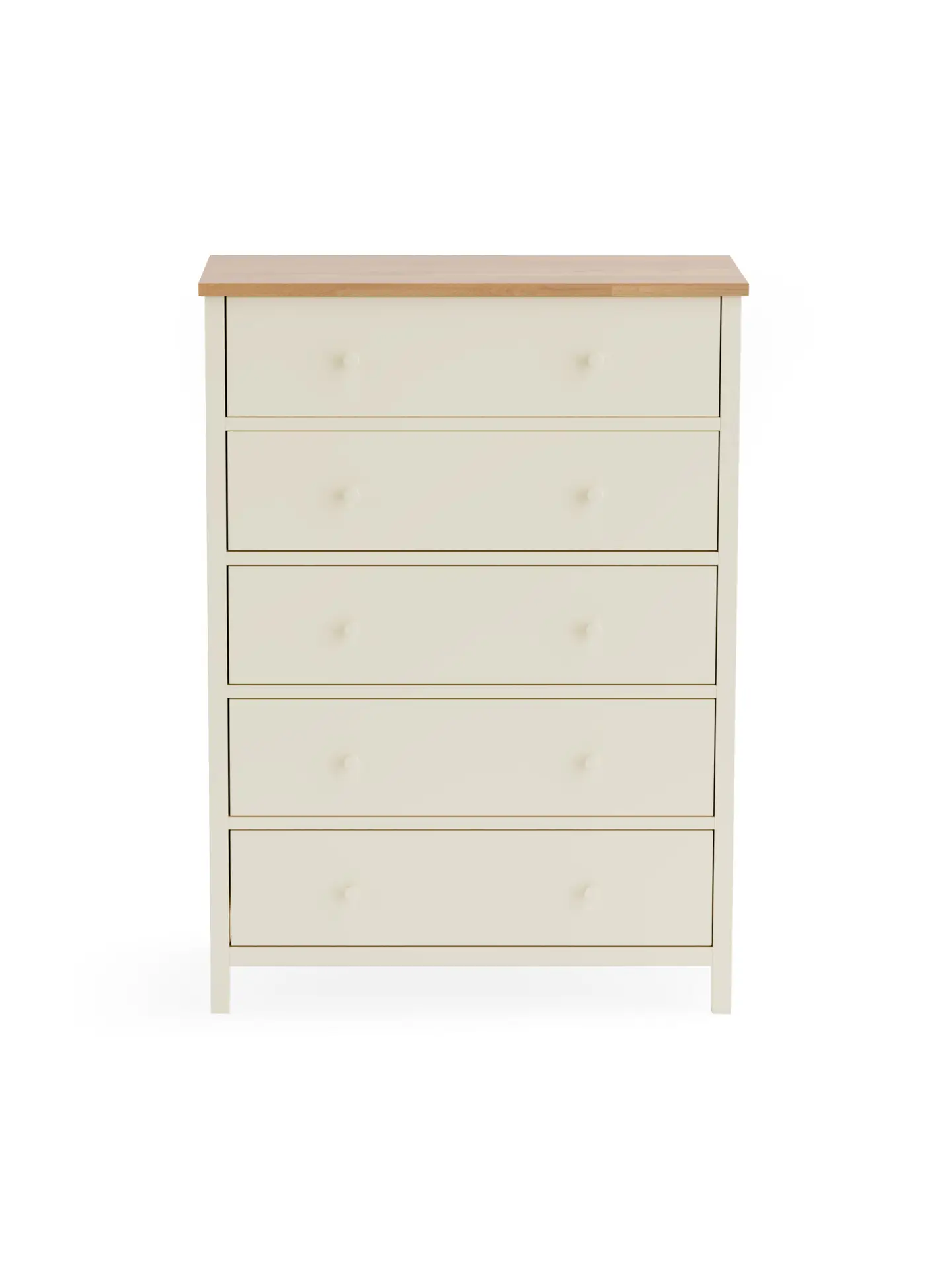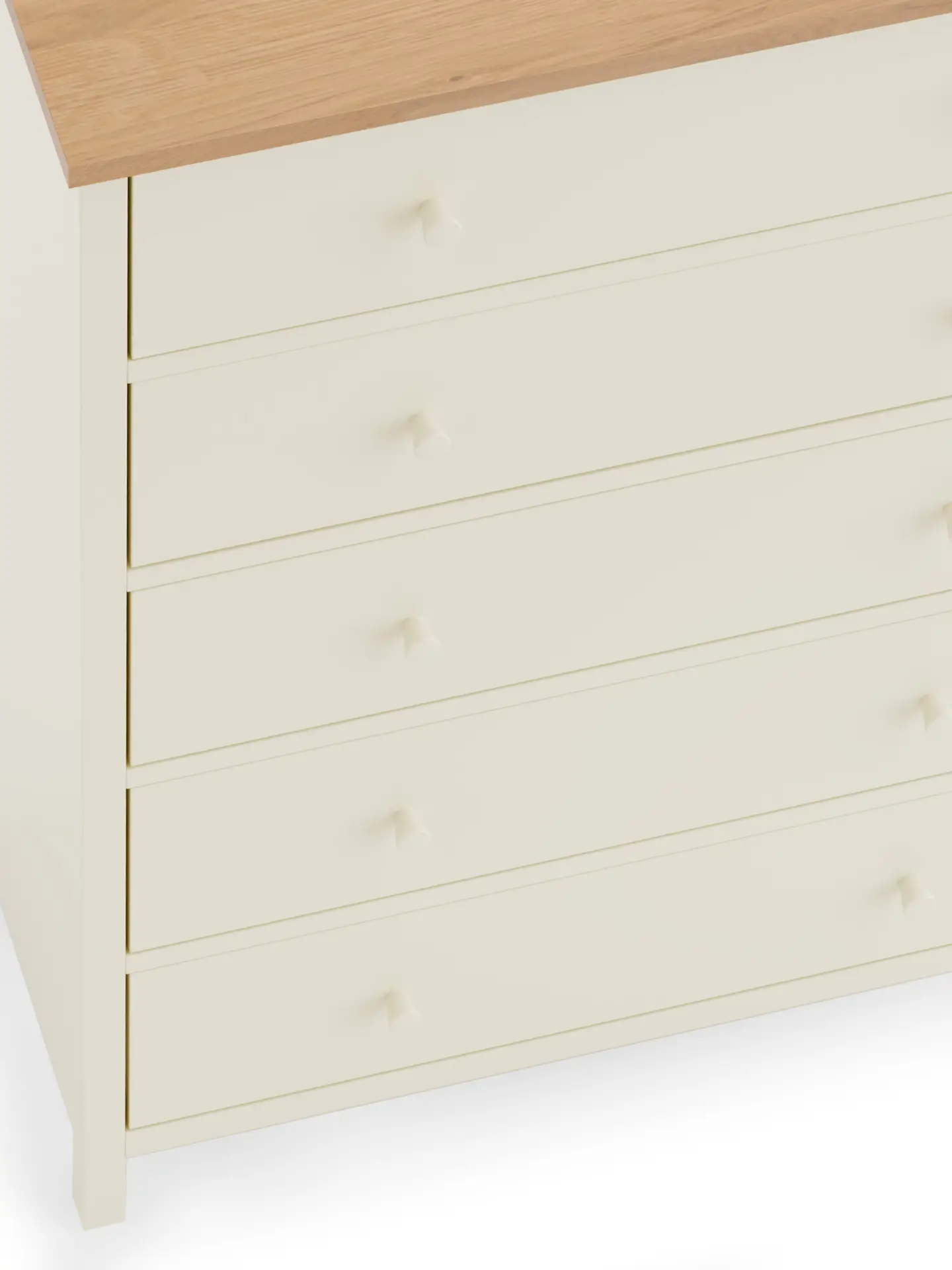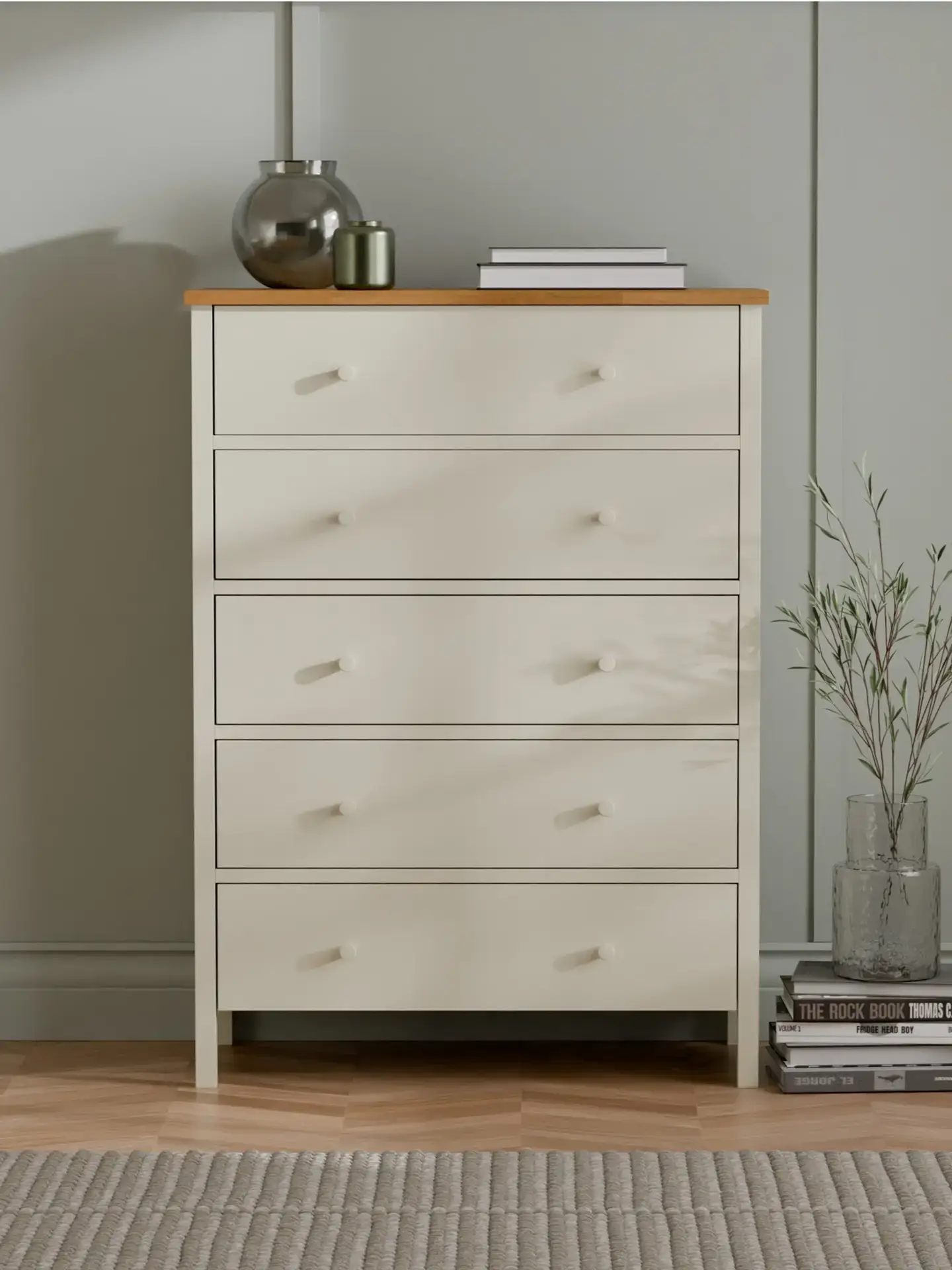 Upgrade your bedroom storage with the Coxmoor 5-Drawer Wide Chest in an elegant Ivory and Oak finish. Designed with five generously sized drawers, each equipped with sleek knob handles, this chest offers ample space for clothes, bedding, and other essentials. Its horizontal layout maximizes storage while creating a stylish focal point in your room. The blend of Ivory and Oak finish brings a sophisticated touch to your space, effortlessly complementing a variety of décor styles. Built for durability, this chest is a timeless addition to any home, combining both practical storage and elegant design. Requires minimal assembly.