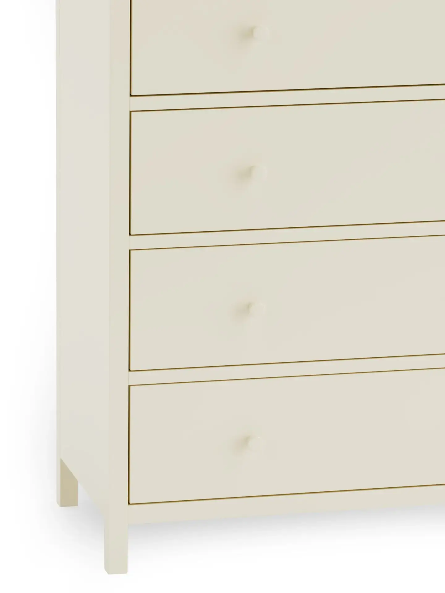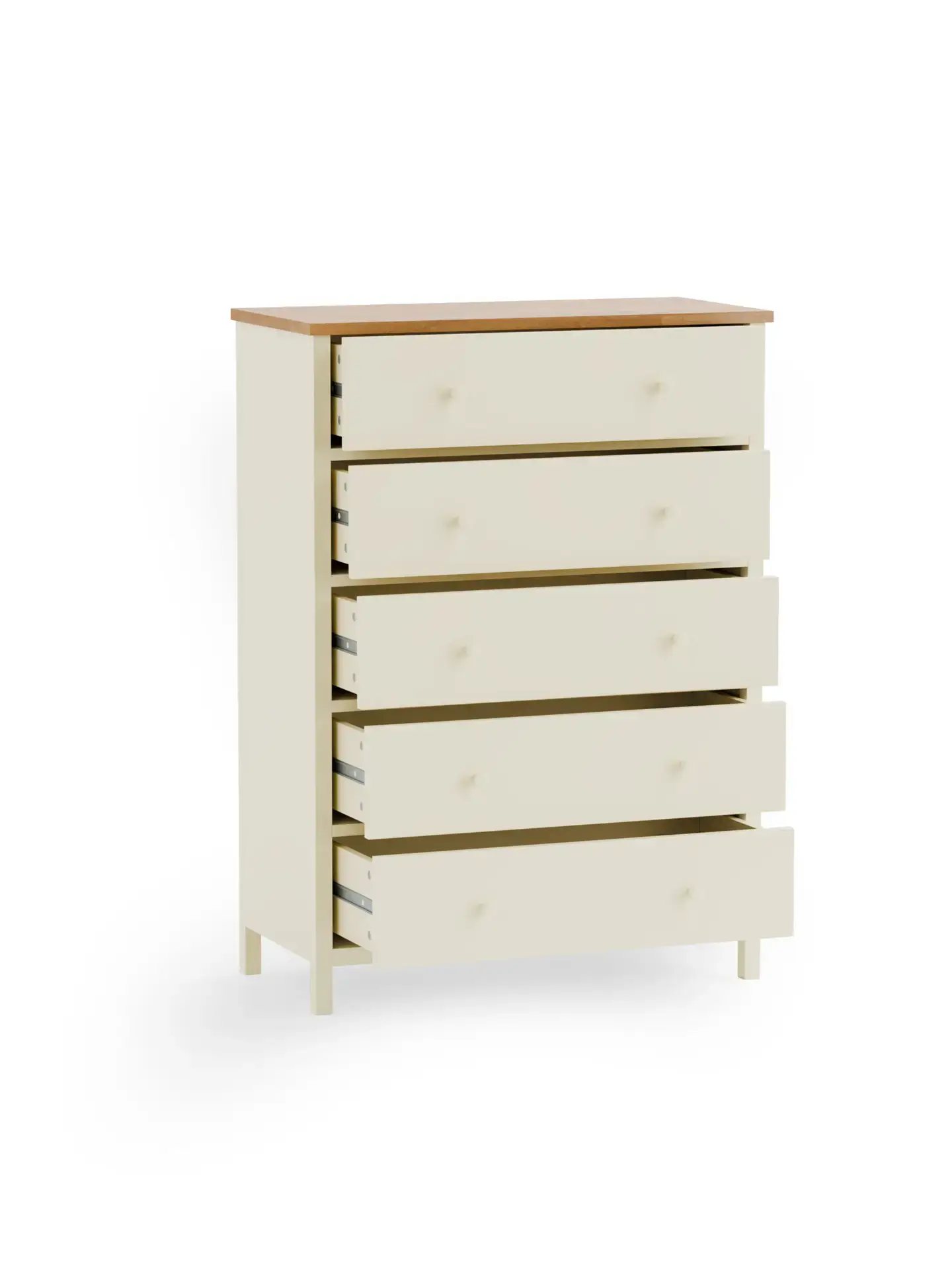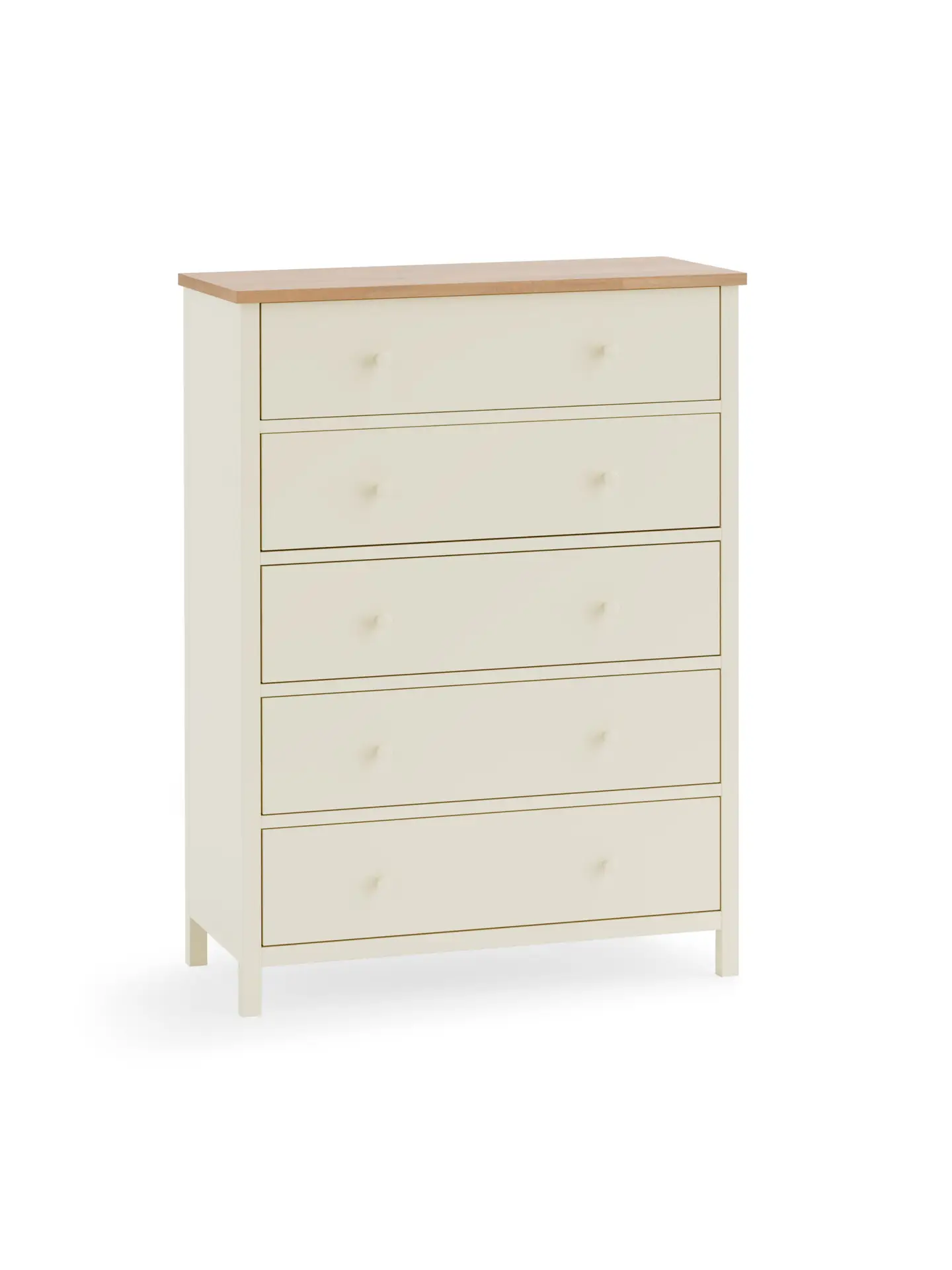 Upgrade your bedroom storage with the Coxmoor 5-Drawer Wide Chest in an elegant Ivory and Oak finish. Designed with five generously sized drawers, each equipped with sleek knob handles, this chest offers ample space for clothes, bedding, and other essentials. Its horizontal layout maximizes storage while creating a stylish focal point in your room. The blend of Ivory and Oak finish brings a sophisticated touch to your space, effortlessly complementing a variety of décor styles. Built for durability, this chest is a timeless addition to any home, combining both practical storage and elegant design. Requires minimal assembly.