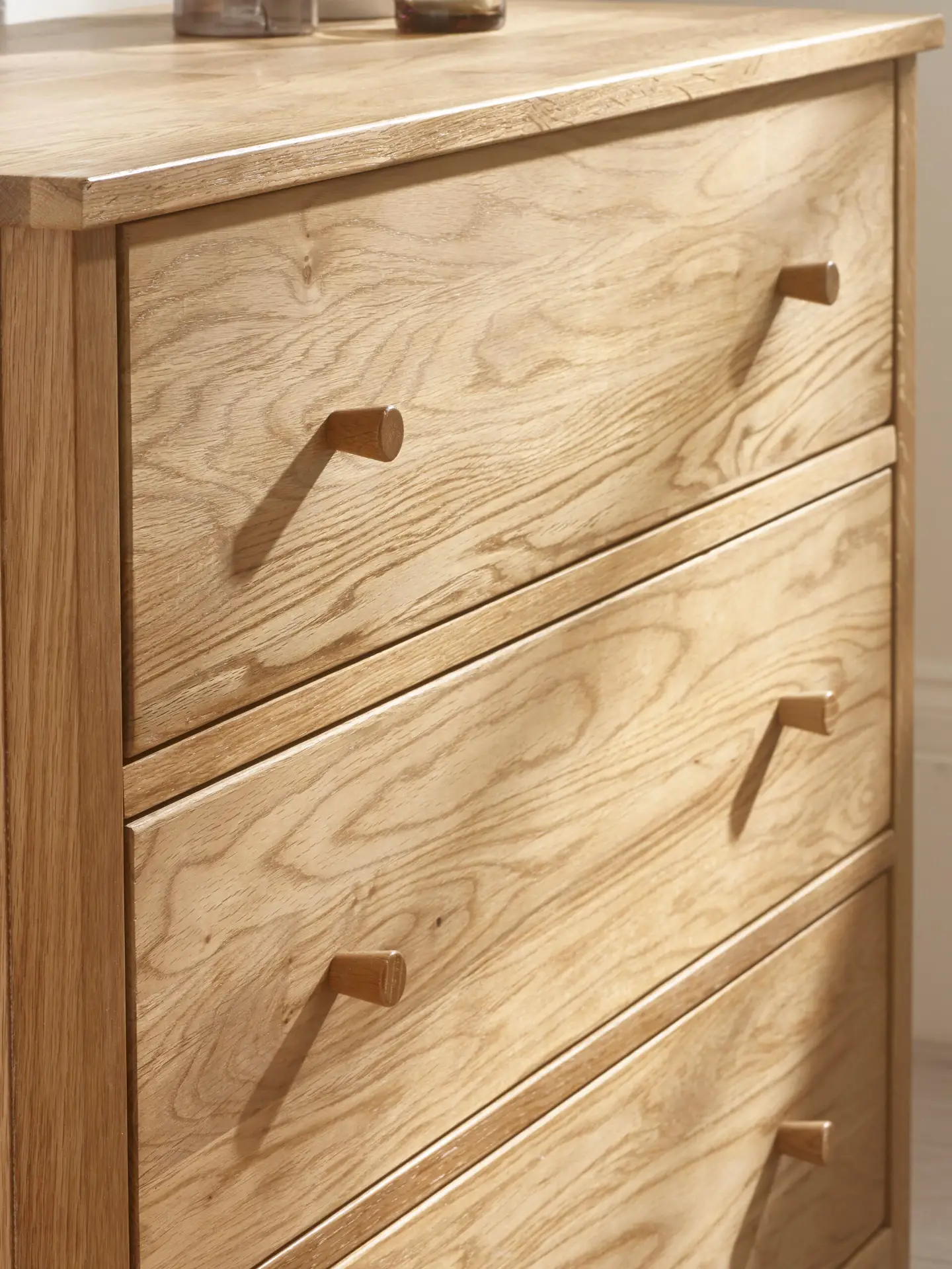 - Stylish knob handles combined with the natural oak finish create an elegant yet functional piece for your bedroom.