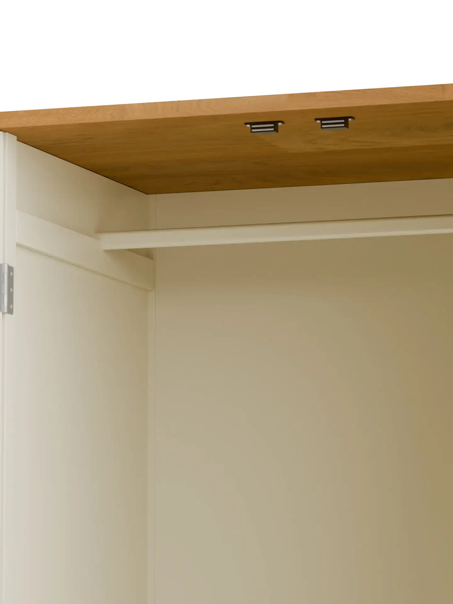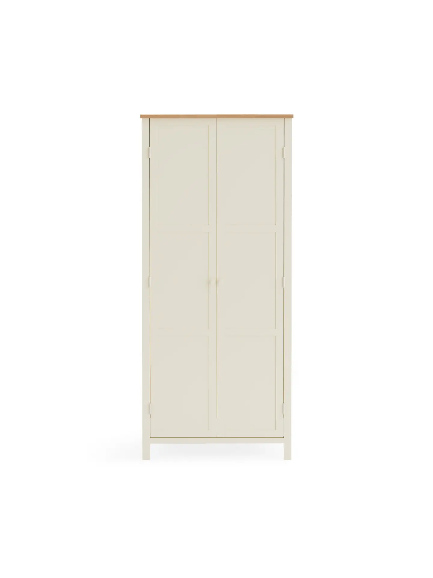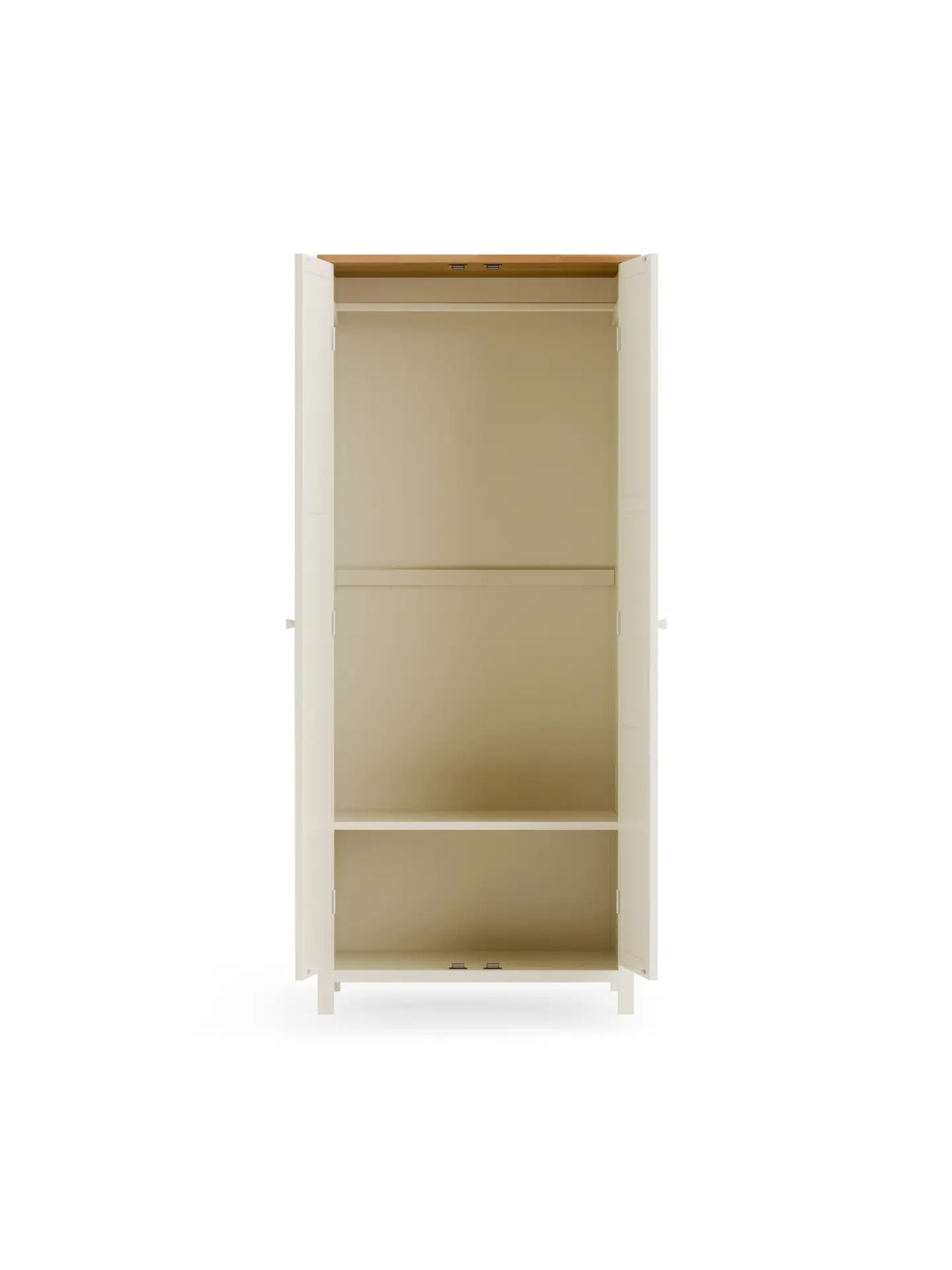 Bring a touch of sophistication to your bedroom with the Coxmoor Wardrobe in Ivory and Oak. This stylish storage solution offers a perfect blend of design and function. It provides generous hanging space for clothes, along with a convenient shelf for folded items or accessories. The sleek, understated knob handles complement the design, while the natural wood grain brings warmth and character to your room. With easy assembly, it’s a seamless addition to any bedroom.