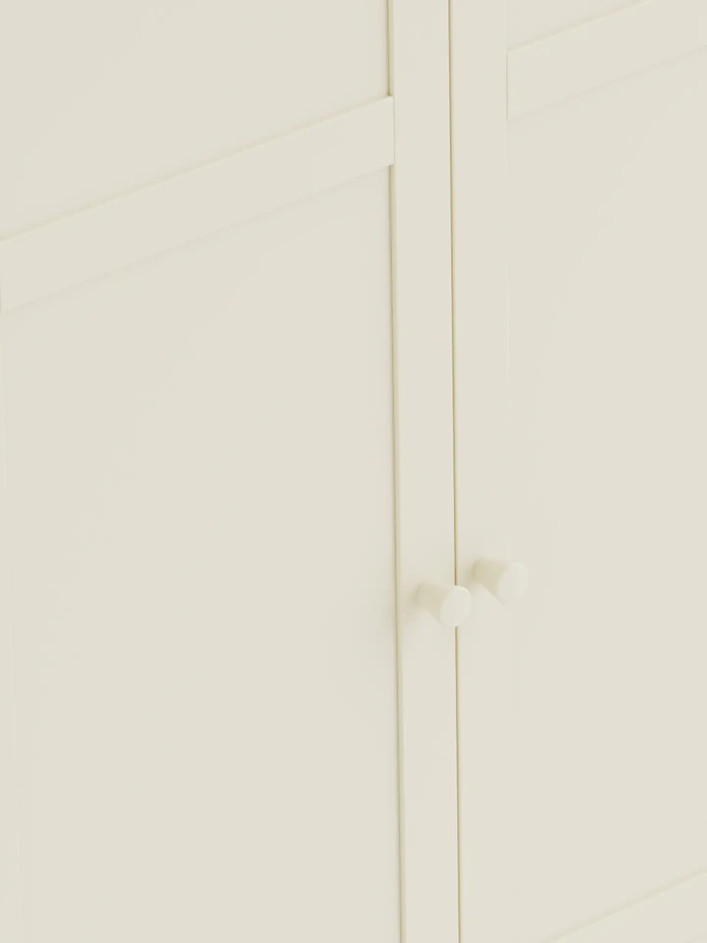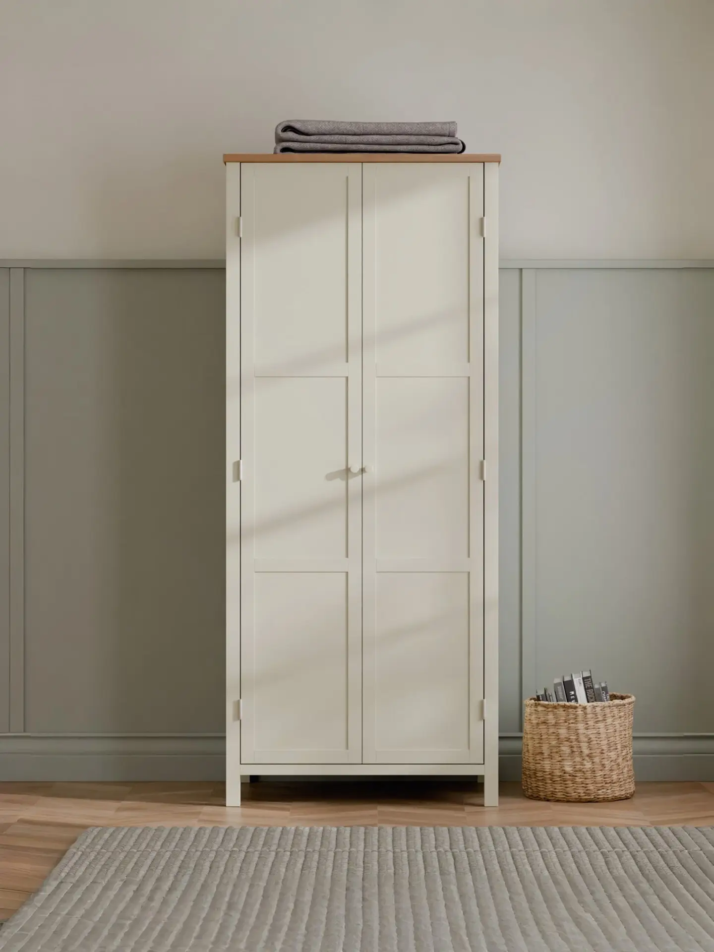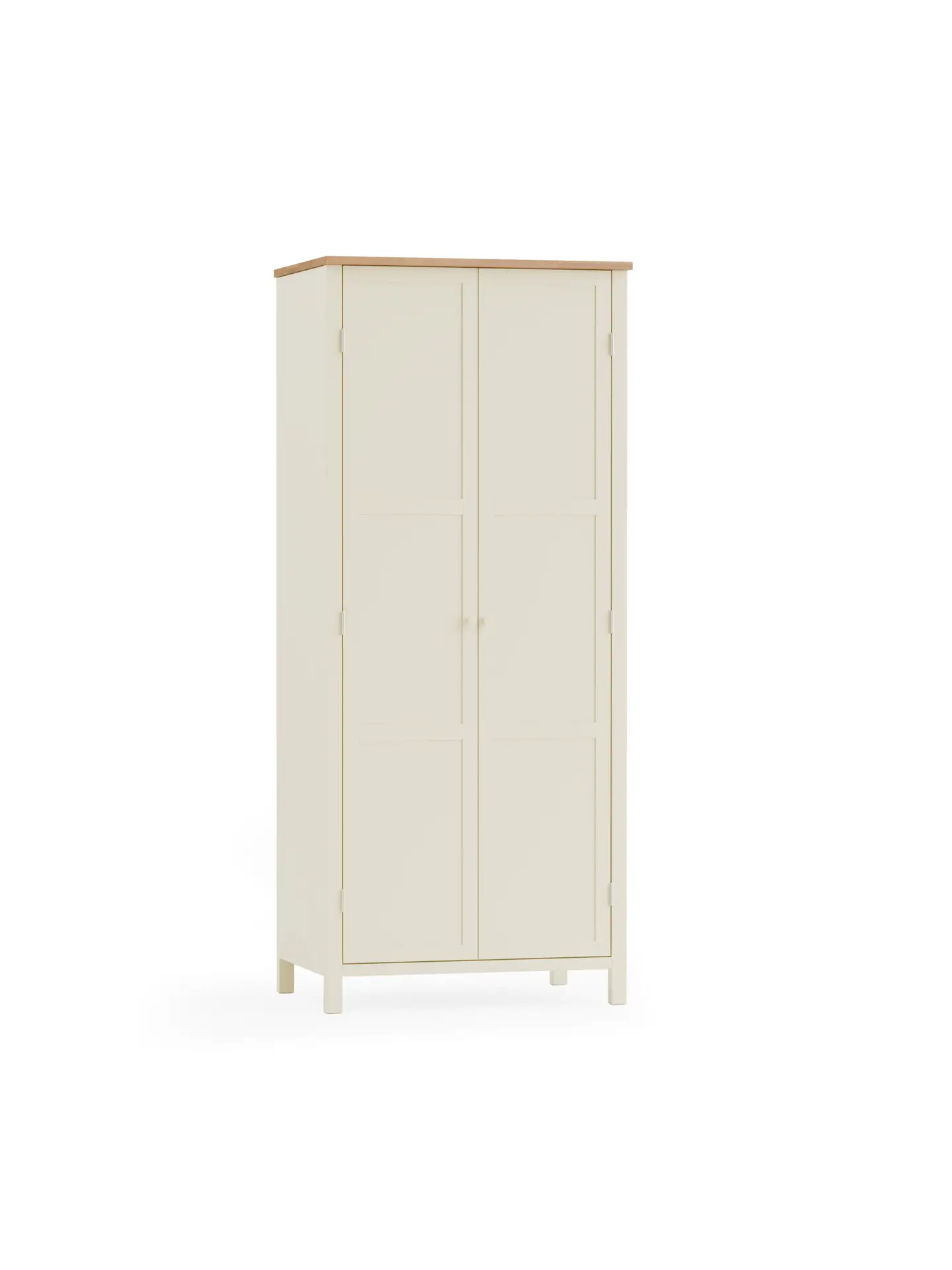 Bring a touch of sophistication to your bedroom with the Coxmoor Wardrobe in Ivory and Oak. This stylish storage solution offers a perfect blend of design and function. It provides generous hanging space for clothes, along with a convenient shelf for folded items or accessories. The sleek, understated knob handles complement the design, while the natural wood grain brings warmth and character to your room. With easy assembly, it’s a seamless addition to any bedroom.