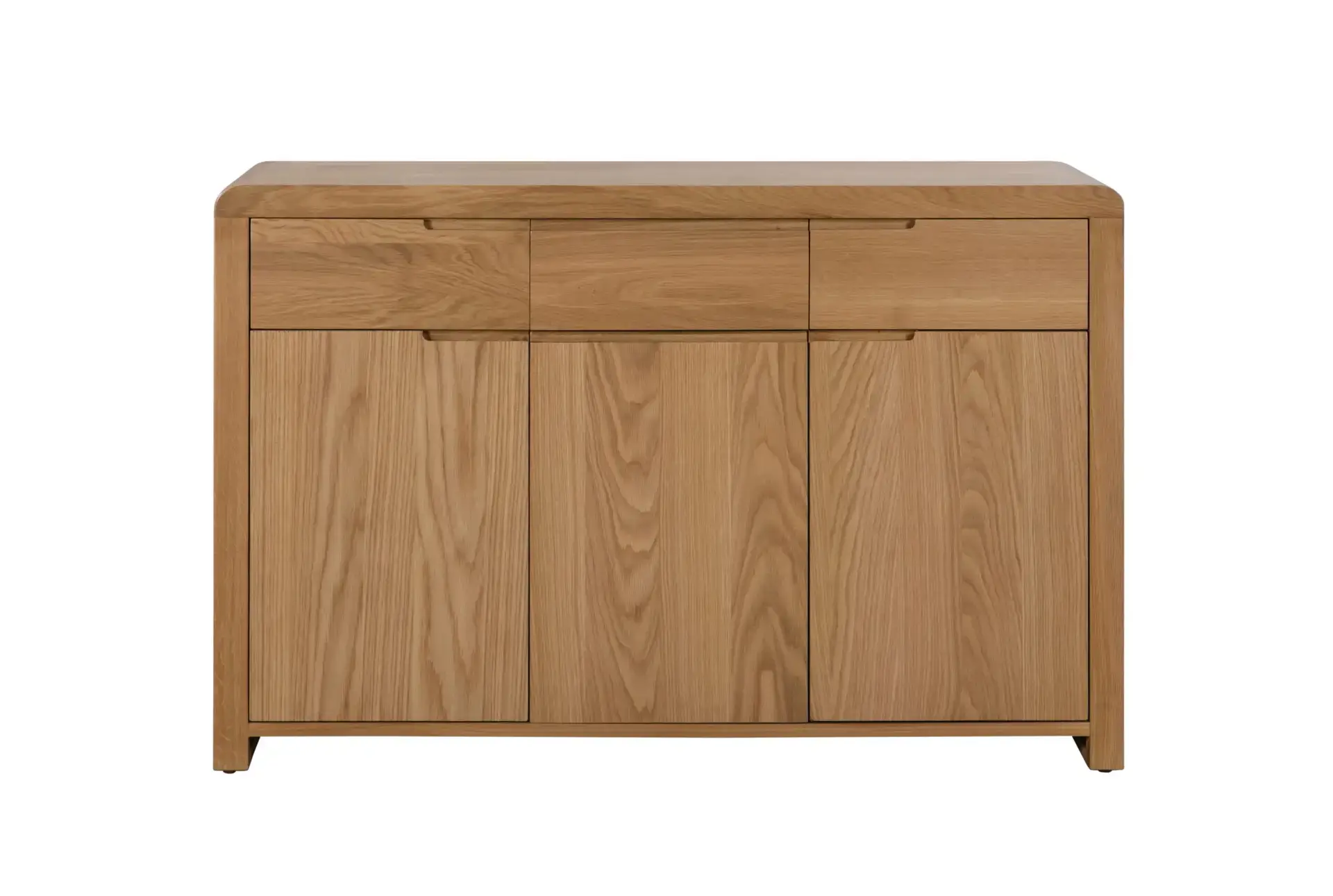 Crafted from solid oak and oak veneers, the Curve combines clean lines with a gentle curved edging, adding a modern, retro feel to any dining area. The Curve Sideboard provides great storage with three drawers and three doors, perfect for the kitchen, dining, or living room. Part of the Julian Bowen Curve Dining and Occasional Collection