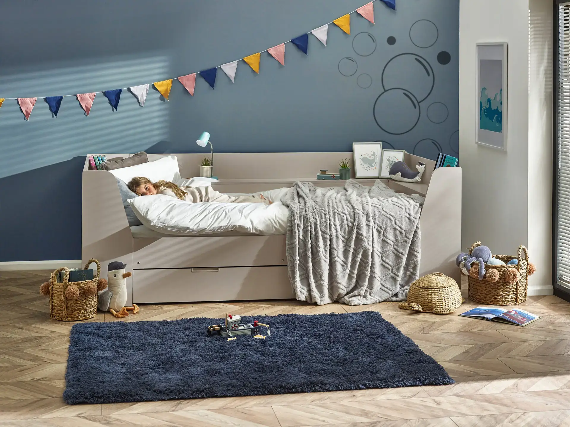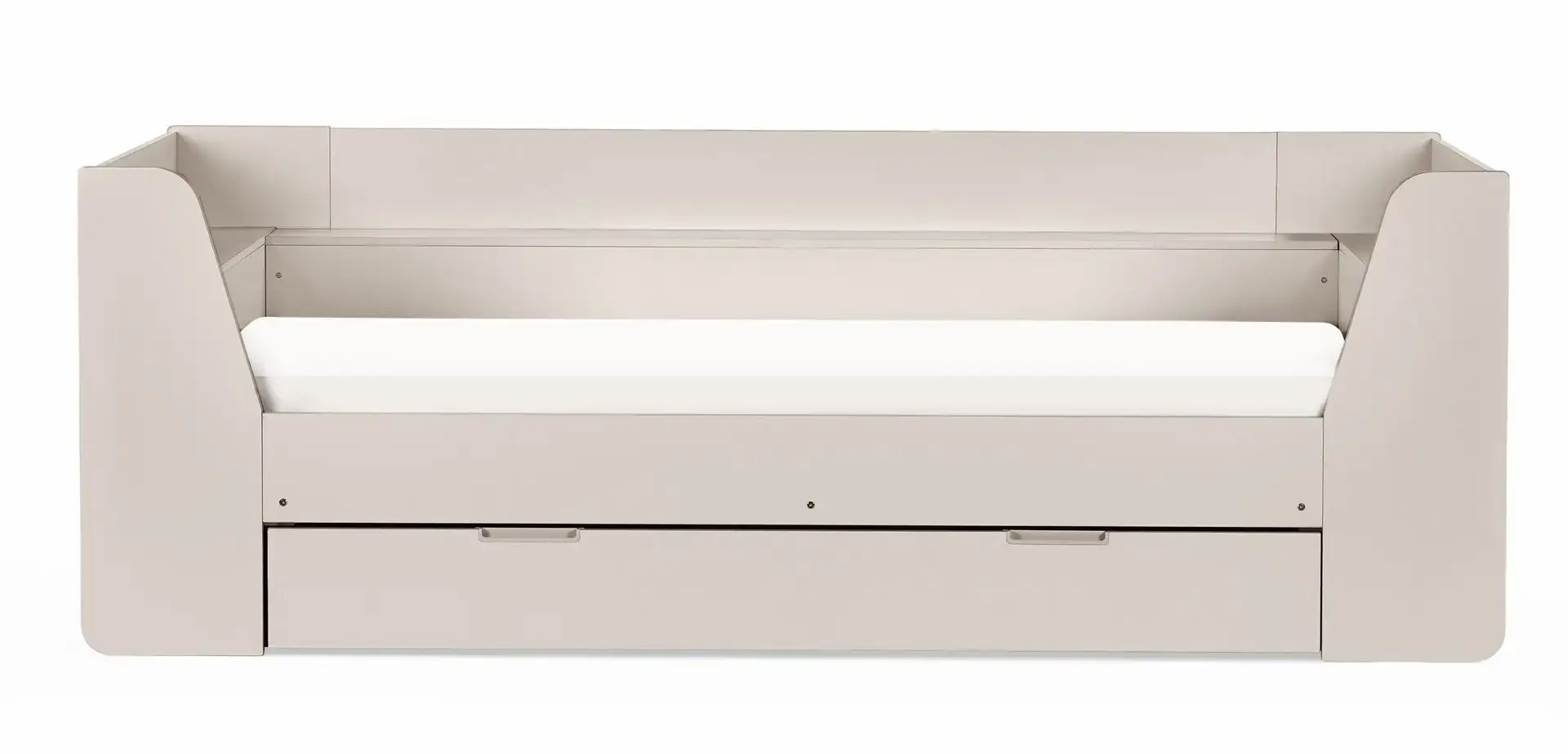 Offering a modern look, the Cyclone Daybed provides the perfect blend of style and functionality to any kid’s bedroom. Featuring a large pull-out drawer with two embedded handles and a shelving unit on the top ideal for storing and organising key essentials. Creating the perfect versatility for your little ones for lounging and sleeping. Available in All White and Taupe.