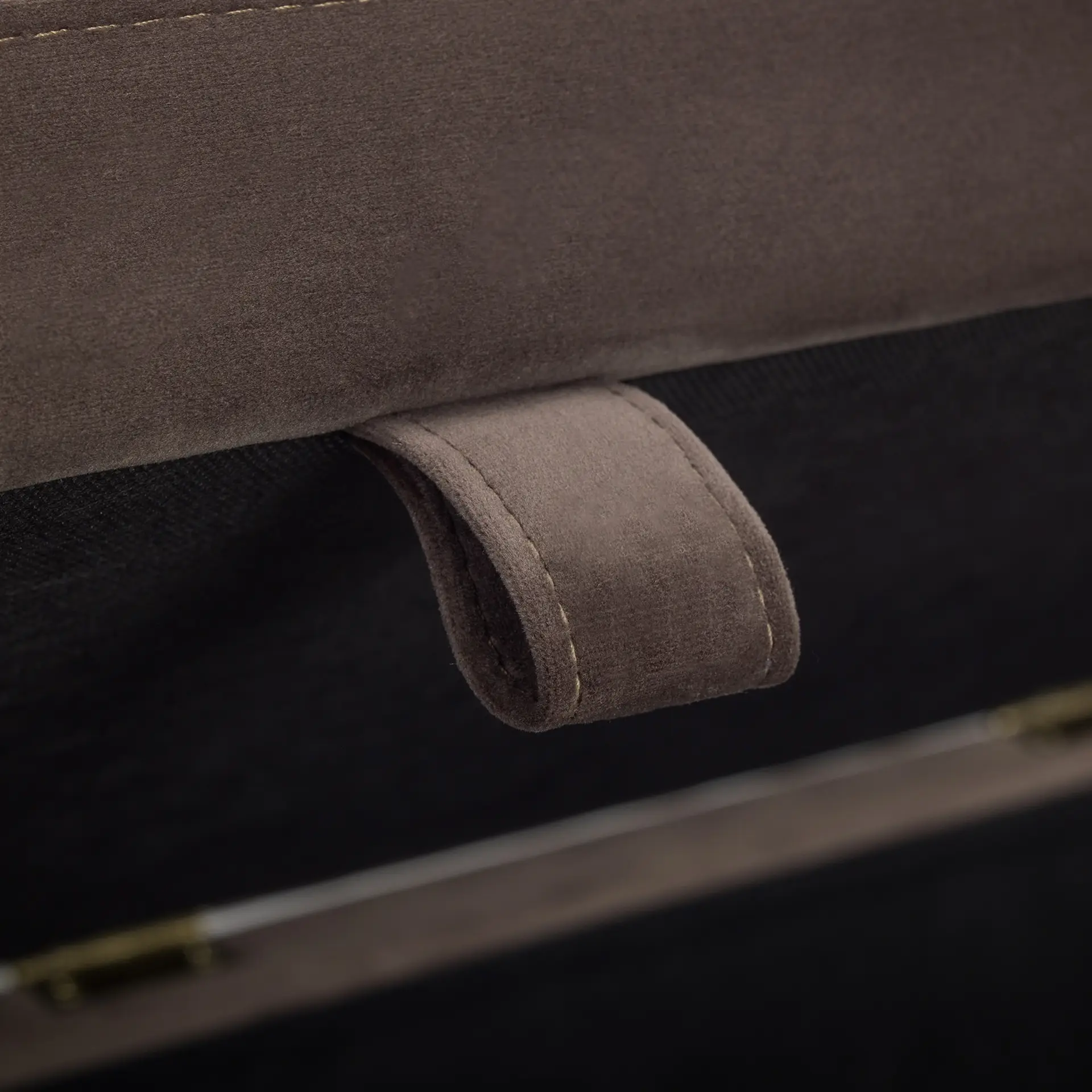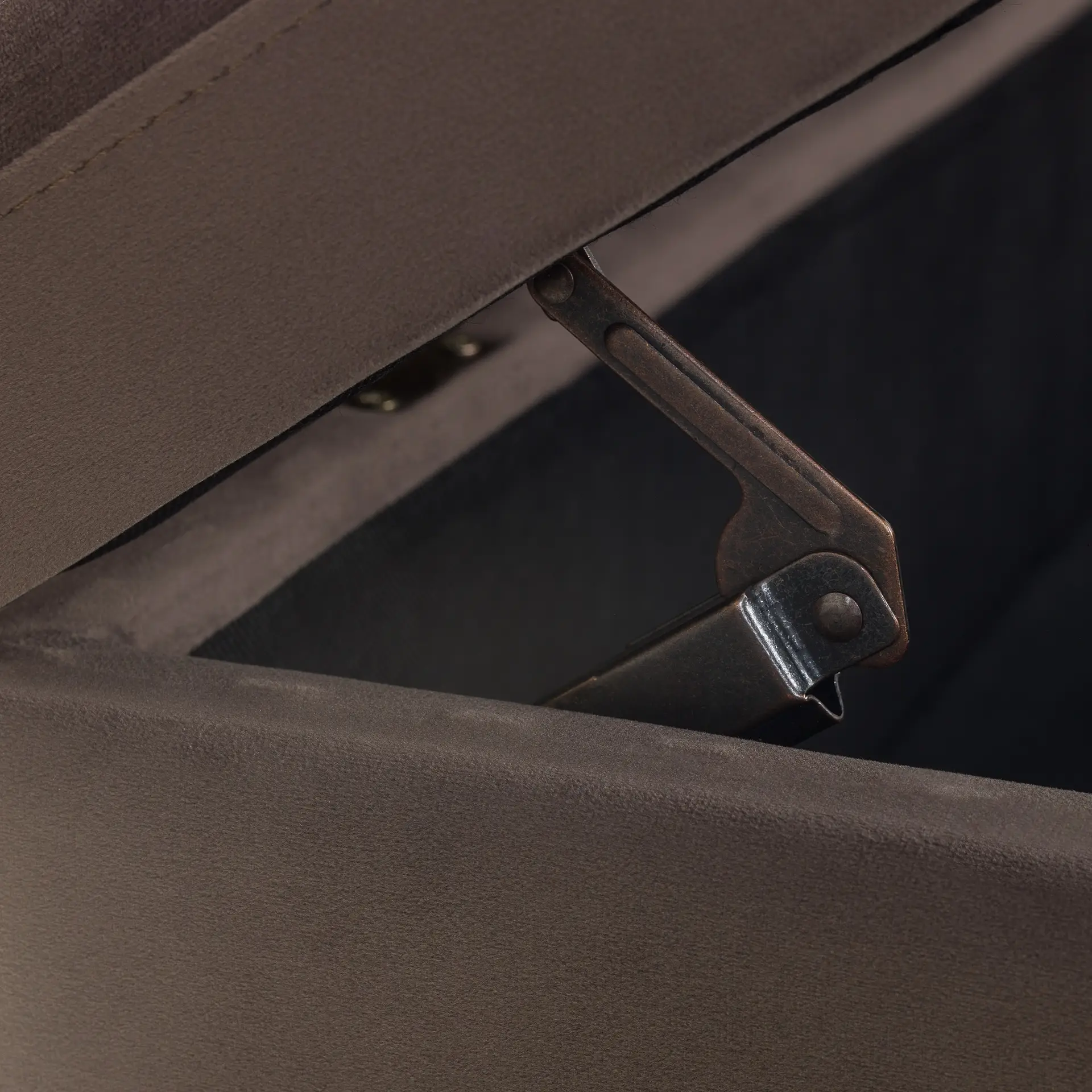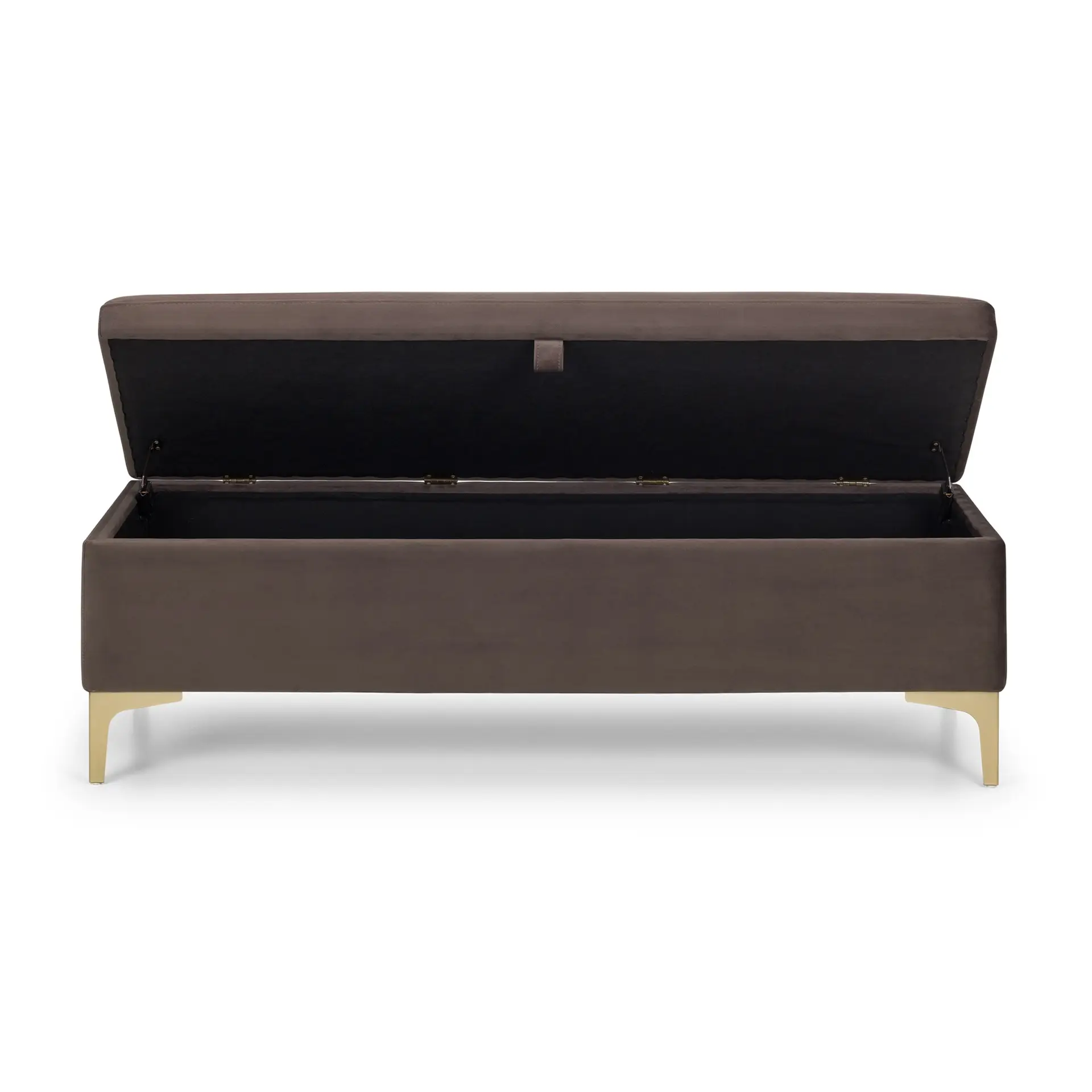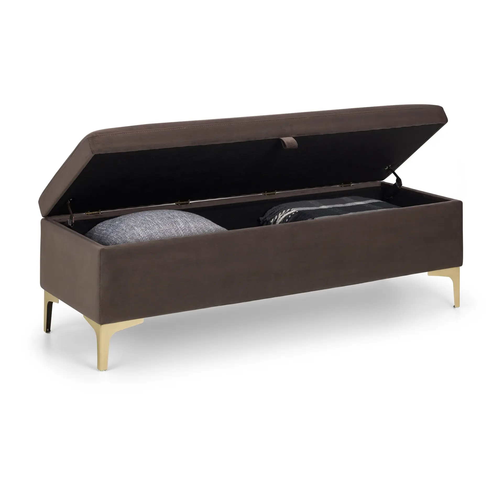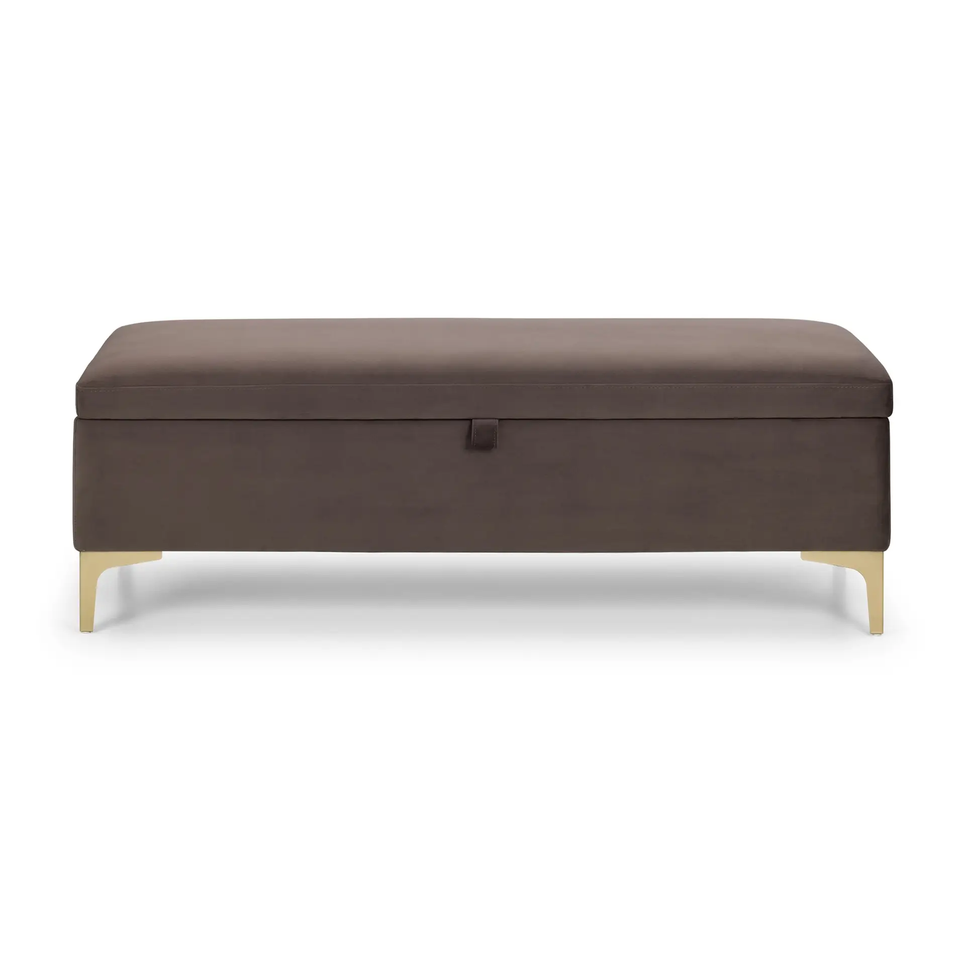 Perfectly proportioned to sit at the end of the Julian Bowen Deco bed, this contemporary Deco blanket box is upholstered in a truffle velvet fabric with complimentary gold metal legs. This contemporary design offers a unique, timeless appeal. The perfect storage for your cushions, linens, or duvets with the ease of soft close hinges.