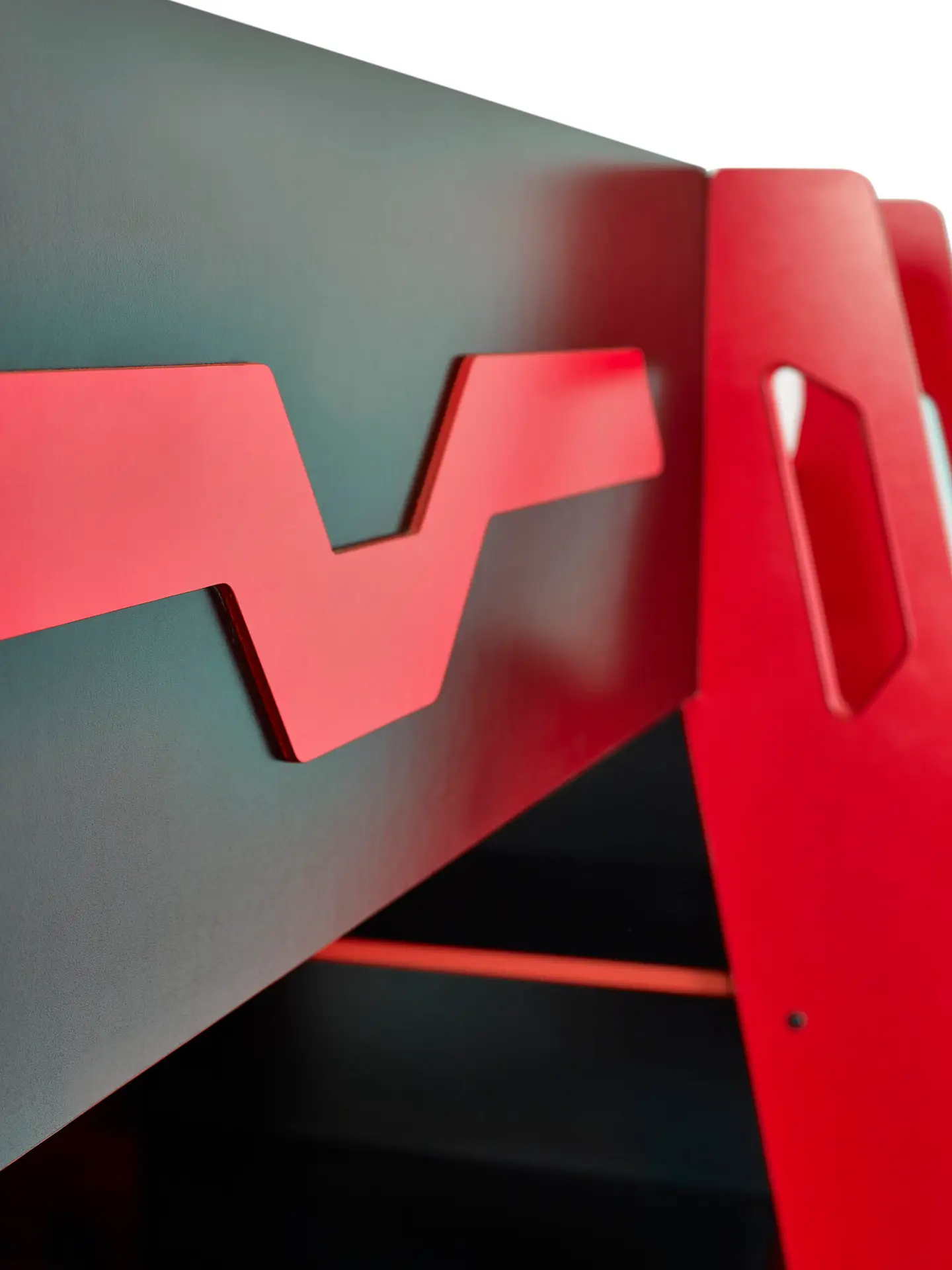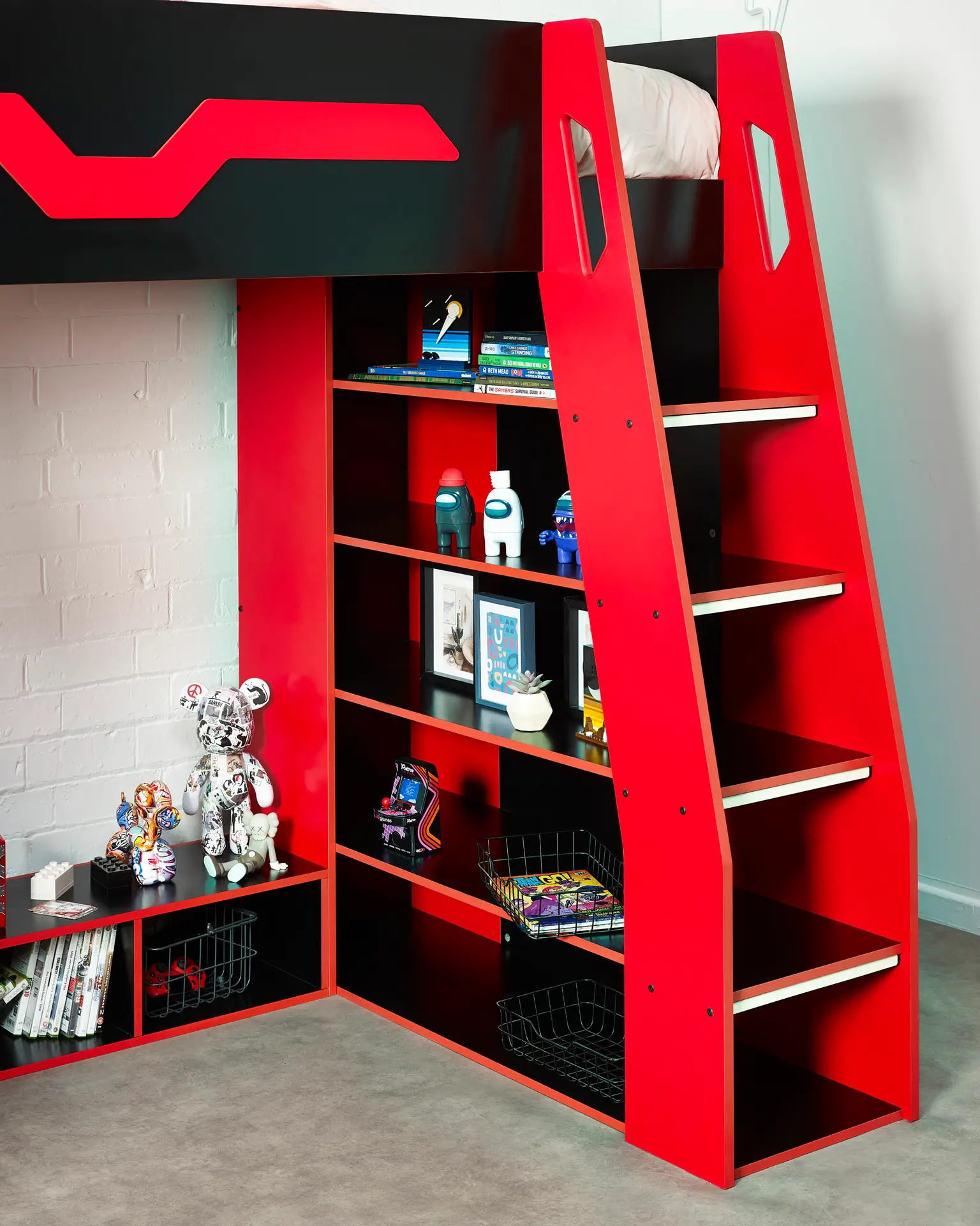 Refresh your child’s bedroom with this ultra-functional high sleeper bed, designed to maximise both space and style. Finished in a bold black and red colourway, this modern loft bed adds energy to any kids’ room while freeing up the floor below for creative use—whether for studying, playing, or storage. The sturdy built-in ladder offers safe and easy access to the raised sleeping area, and the integrated desk provides a dedicated study space that can be positioned inwards or outwards to suit your layout. Crafted from durable materials for lasting stability, this high rise bed is a smart solution for growing needs. Mattress sold separately.