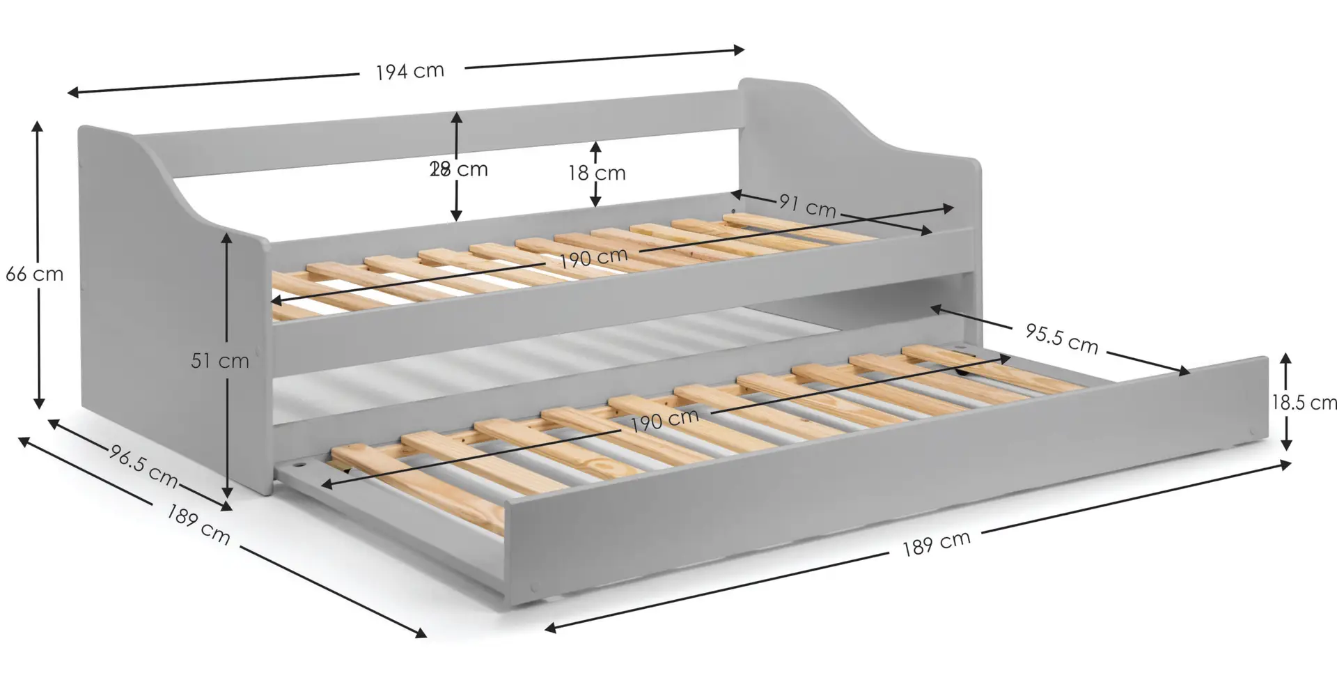 - Dimensions: Measures 194cm (L) x 97cm (W) x 66cm (H), with the pull-out trundle fitting a standard single mattress, making it ideal for compact spaces.