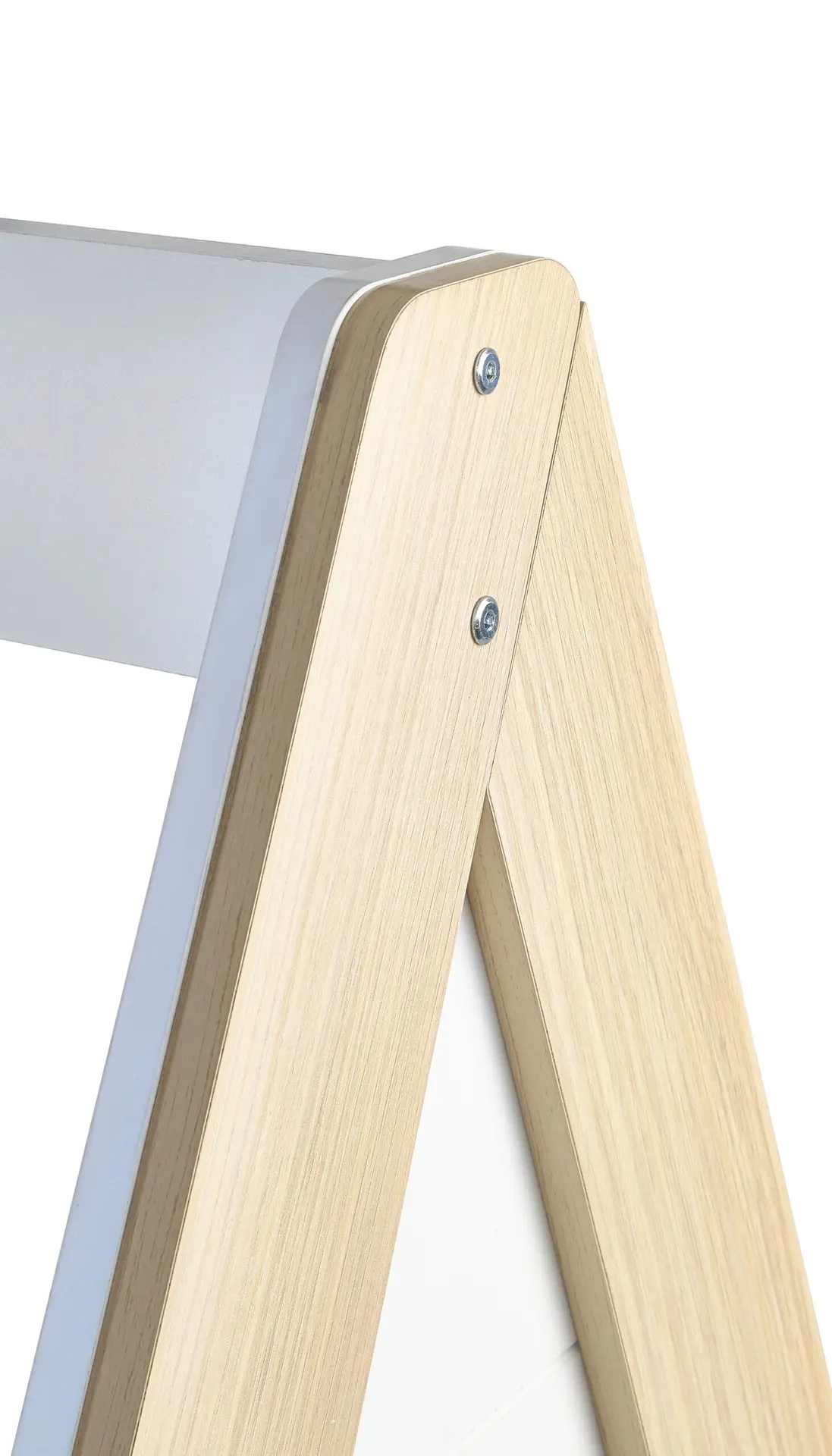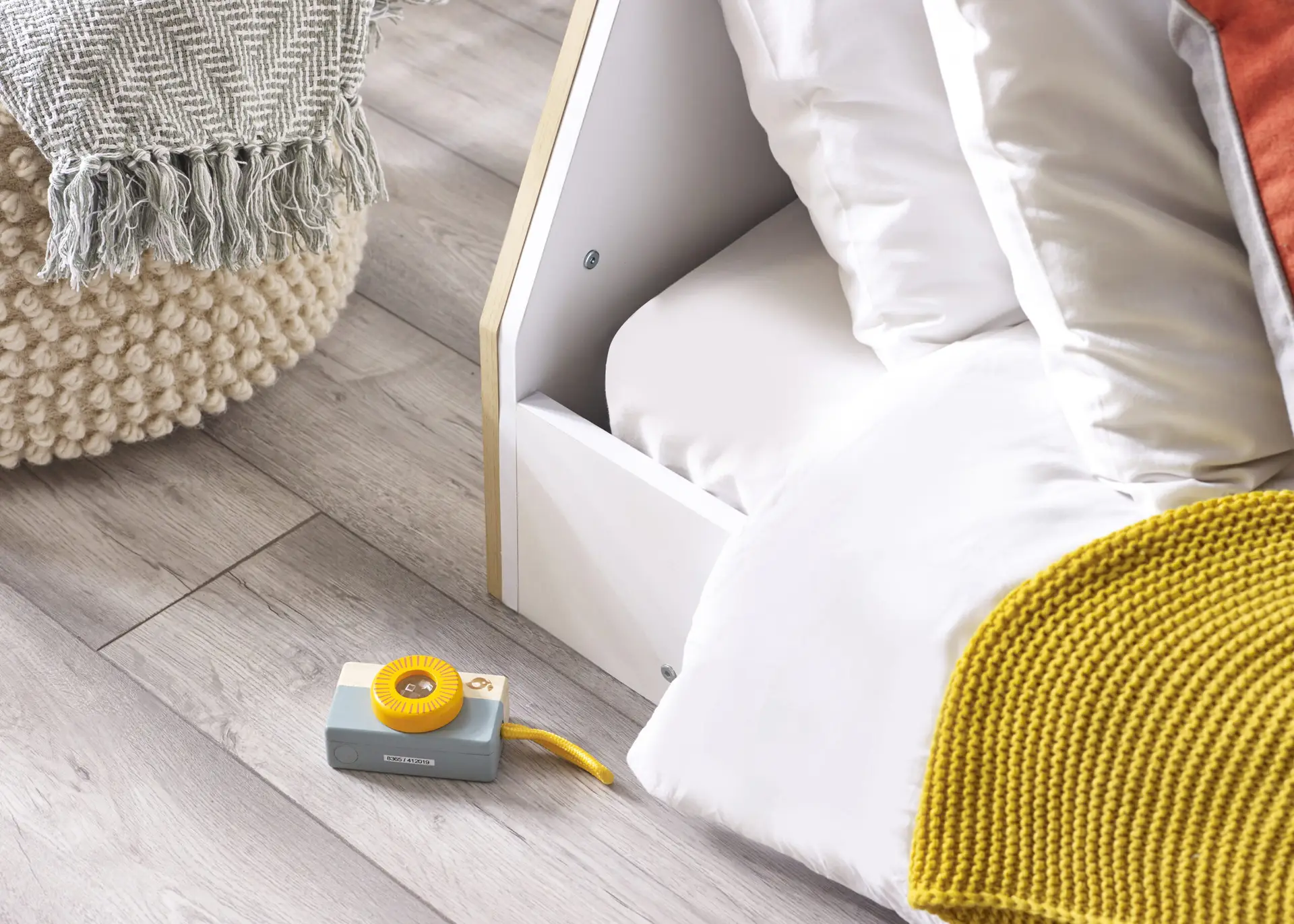 - With a charming, white and woodgrain finish, this teepee-style bed offers a magical space for creative play.