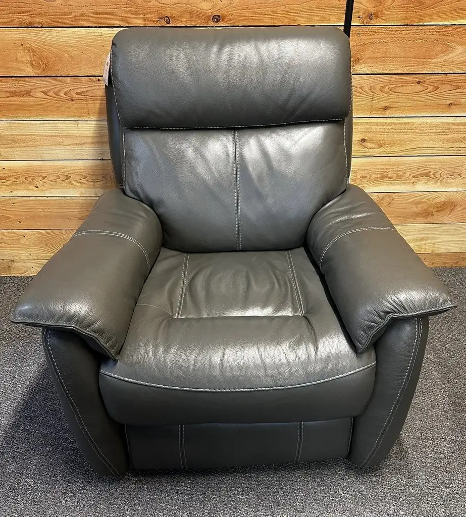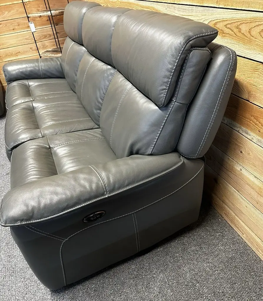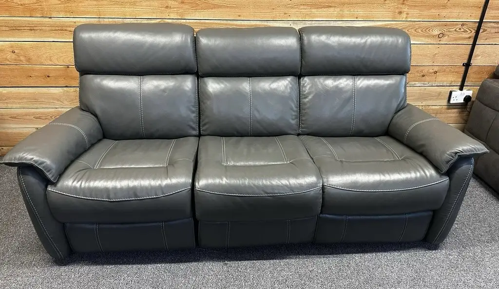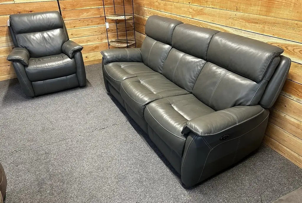 A beautiful 100% real leather grey 3-seater sofa and matching armchair, complete with power recliners, sprung seats, and a built-in USB port—all for a price you won’t believe!