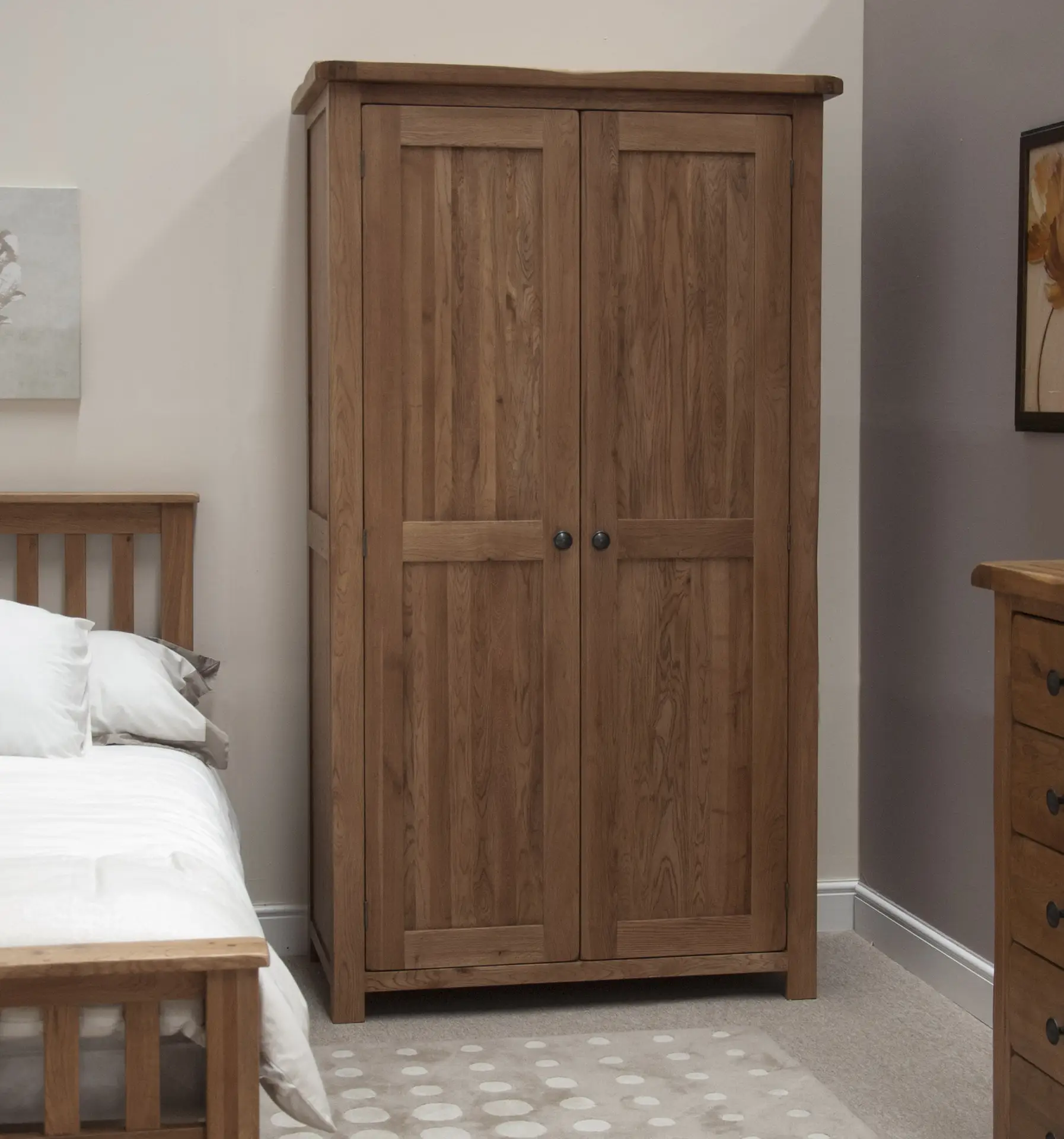 Step into the inviting world of the Rustic Oak Range, a collection of furniture thoughtfully designed to seamlessly complement any decor and home style. Crafted from oak with a striking prominent grain and rich texture, this range exudes a cozy and warm ambiance. From drawers and bed frames to tables, wardrobes, and media units, every piece in this range is meticulously constructed with dovetail joints in the drawers and accented by matching round door handles, ensuring a high-quality finish.