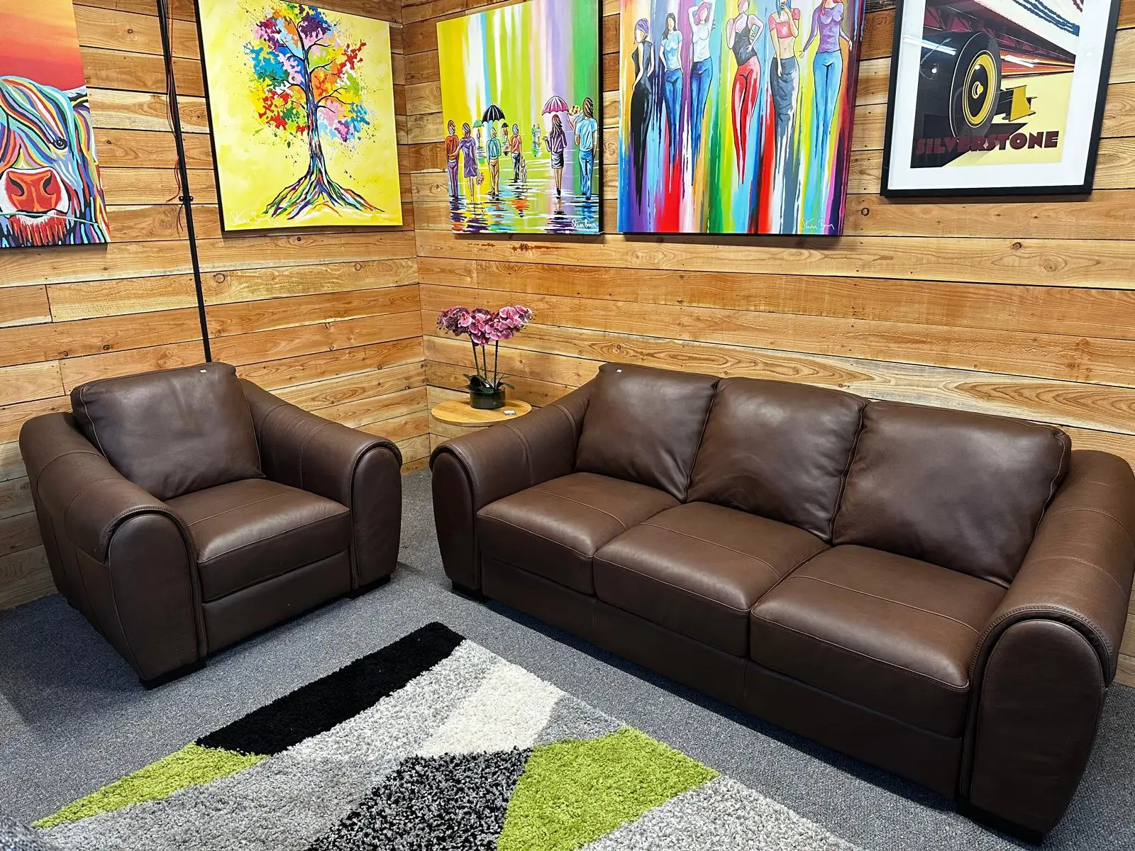 Elevate your living space with the luxurious Sofology Galleria set, featuring genuine brown leather upholstery that combines timeless sophistication with supreme comfort. This distinguished ex-display collection includes a spacious 3-seater sofa and a matching armchair, originally retailed at £3,298.